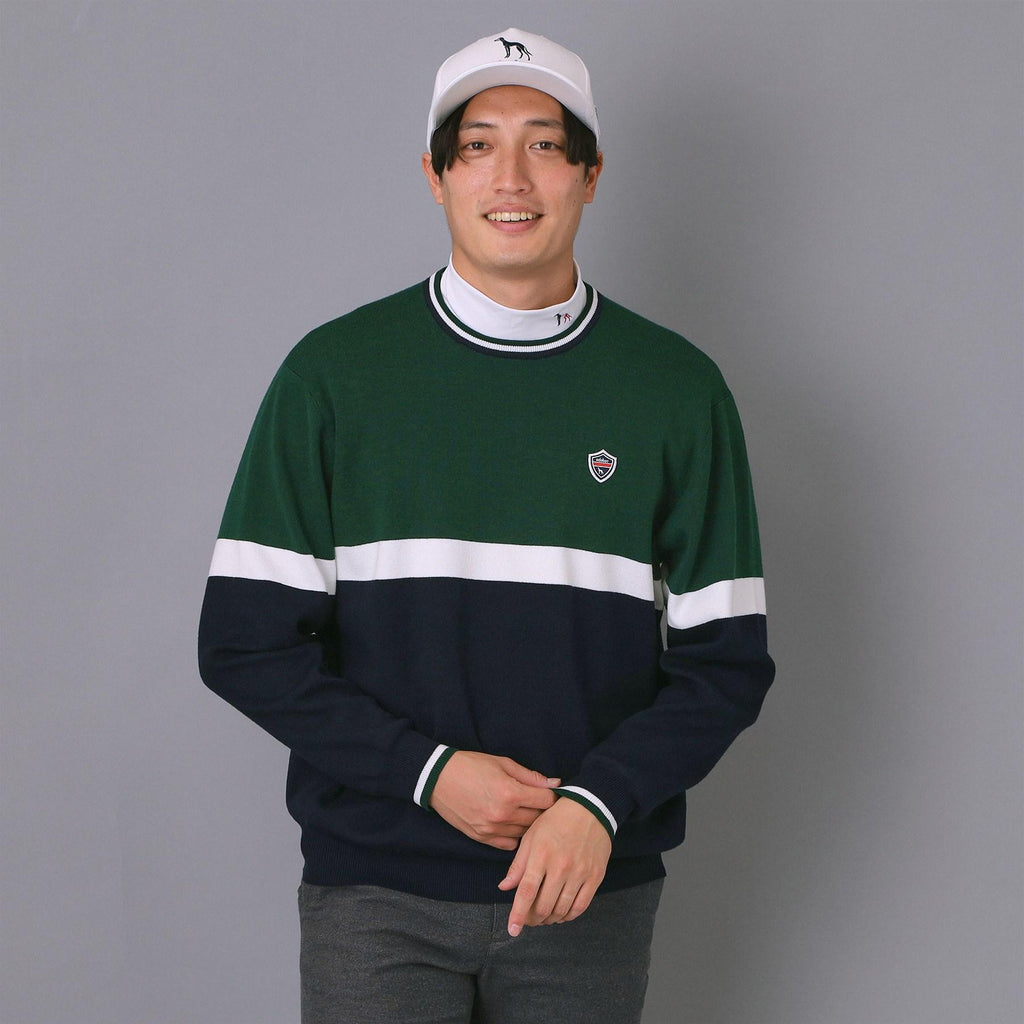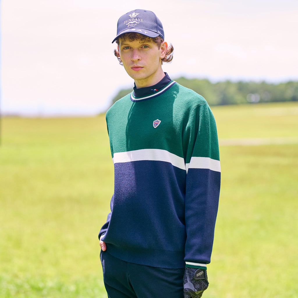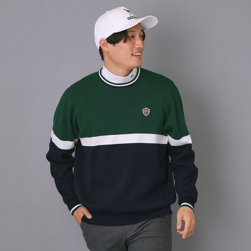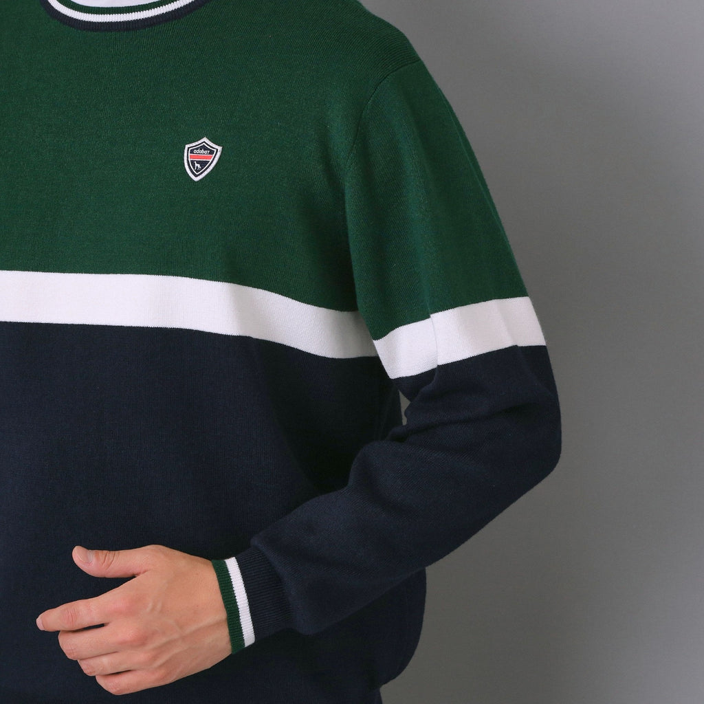 鮮やかなトリコロール配色が際立つ、洗練されたクルーネックニットプルオーバー。