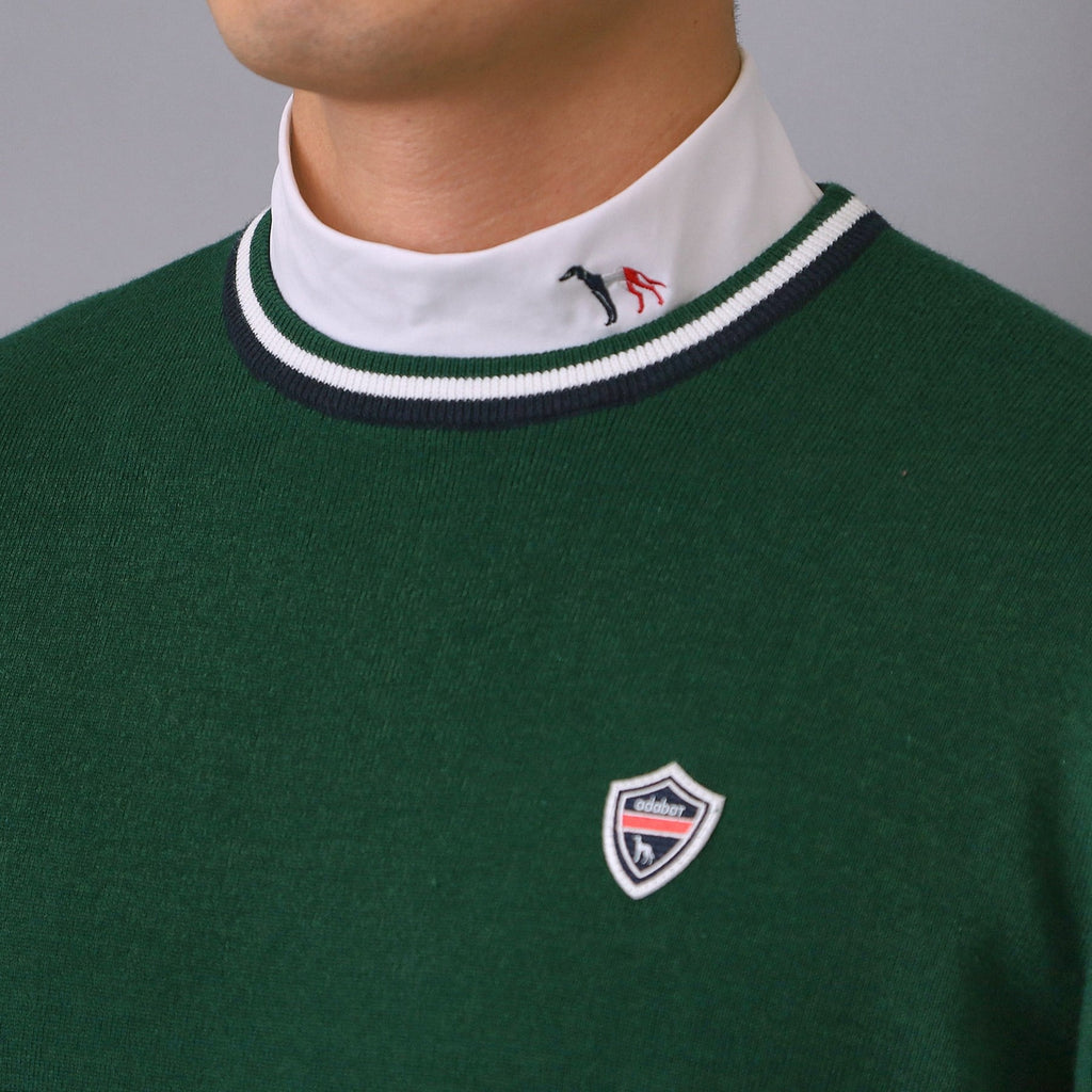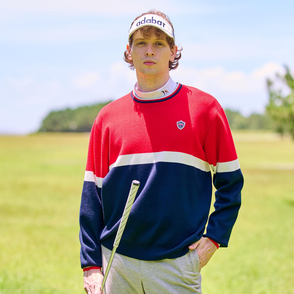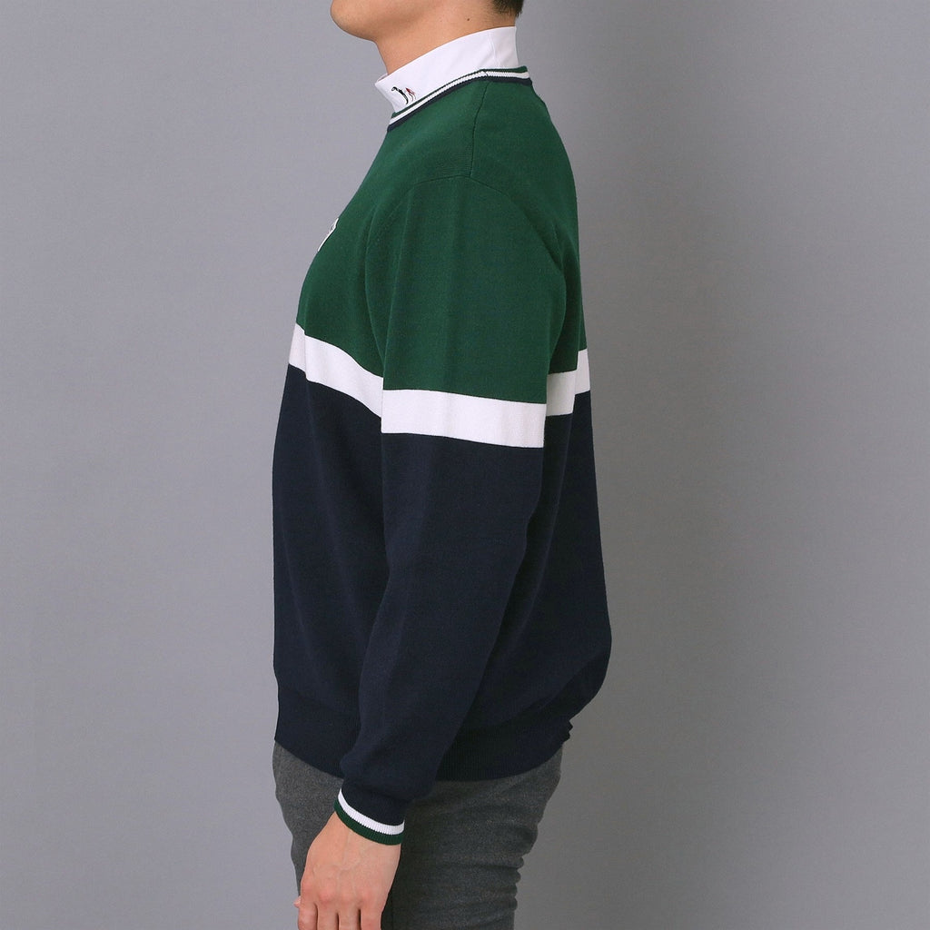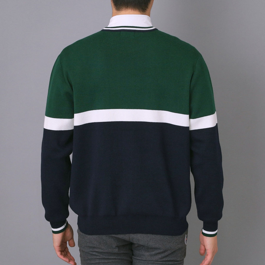 鮮やかなトリコロール配色が際立つ、洗練されたクルーネックニットプルオーバー。