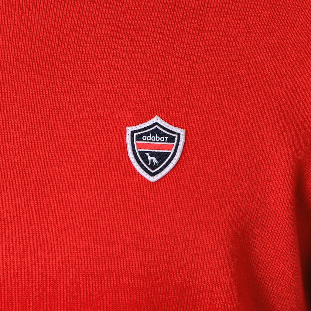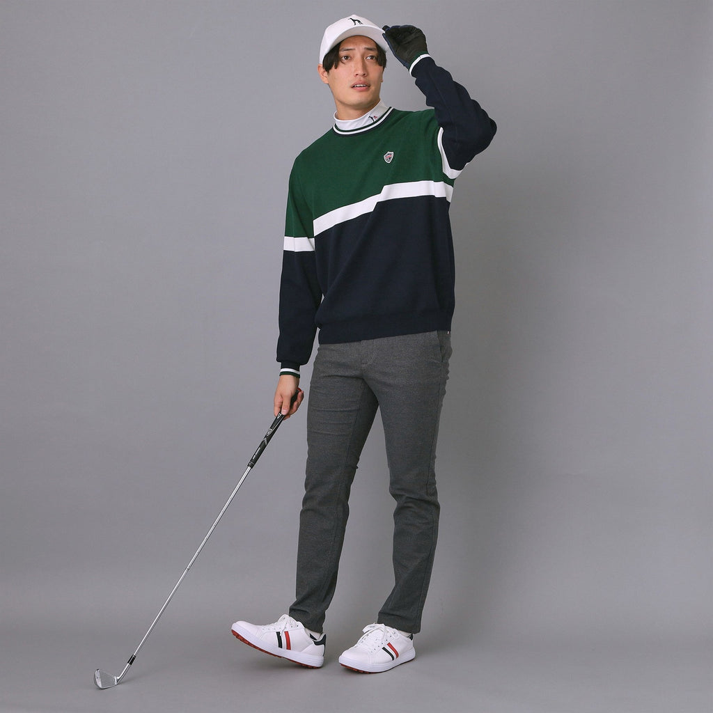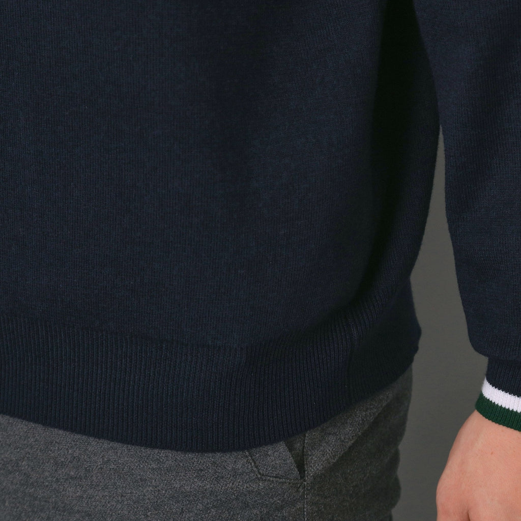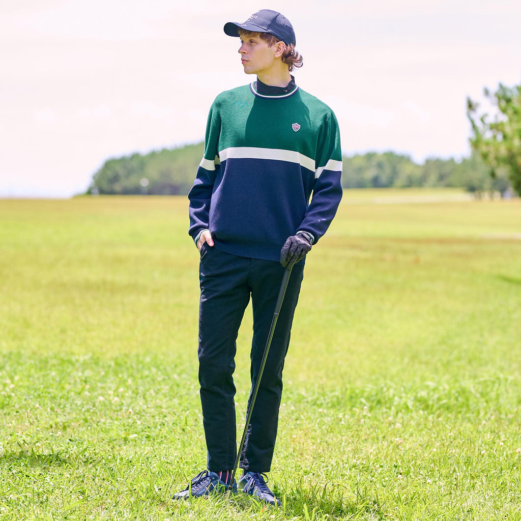鮮やかなトリコロール配色が際立つ、洗練されたクルーネックニットプルオーバー。