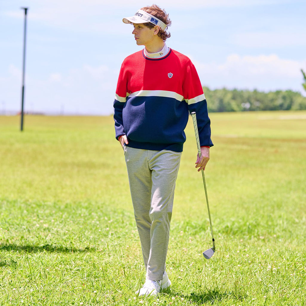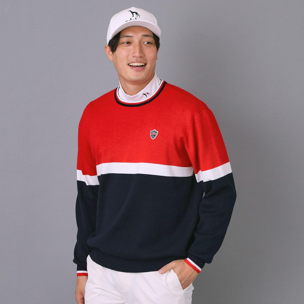 【鮮やかなトリコロール配色が印象的なクルーネックニット】