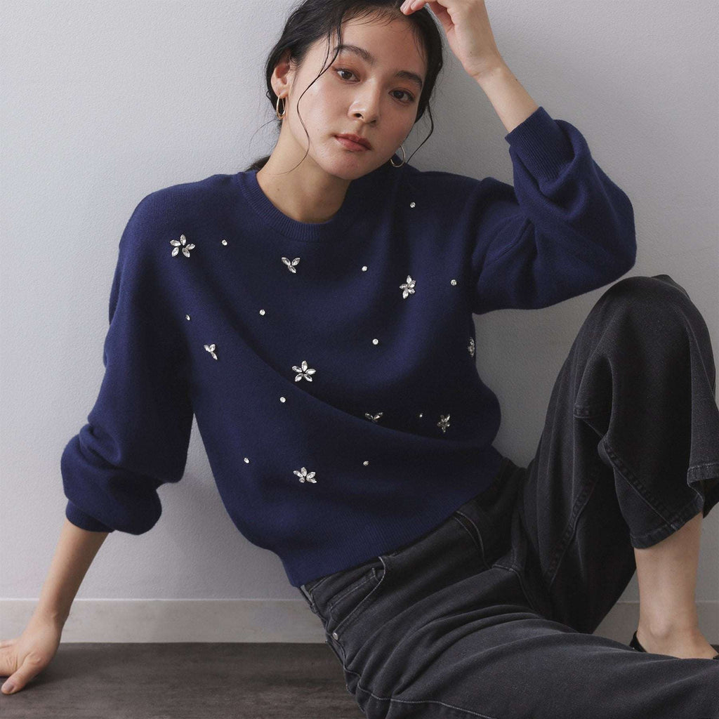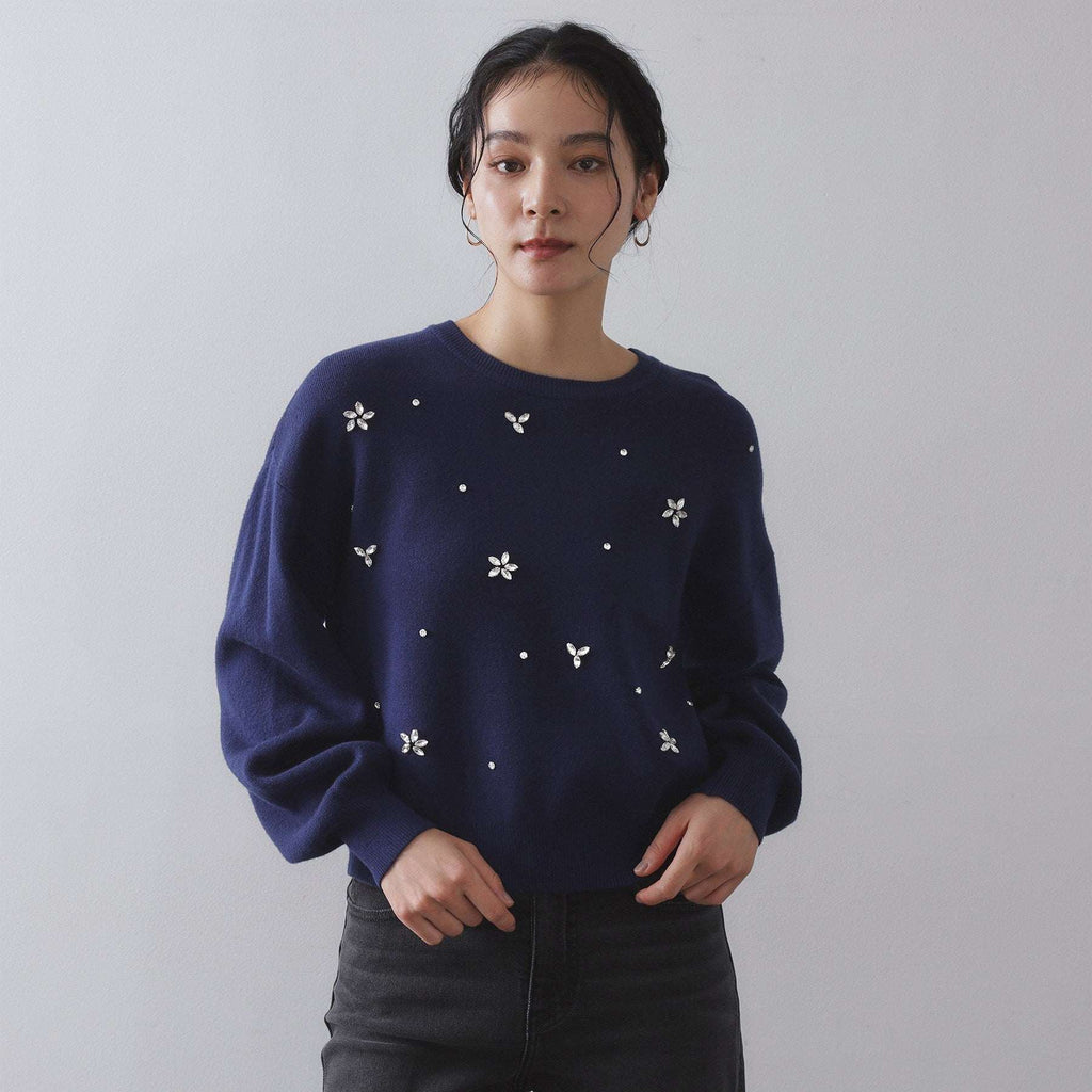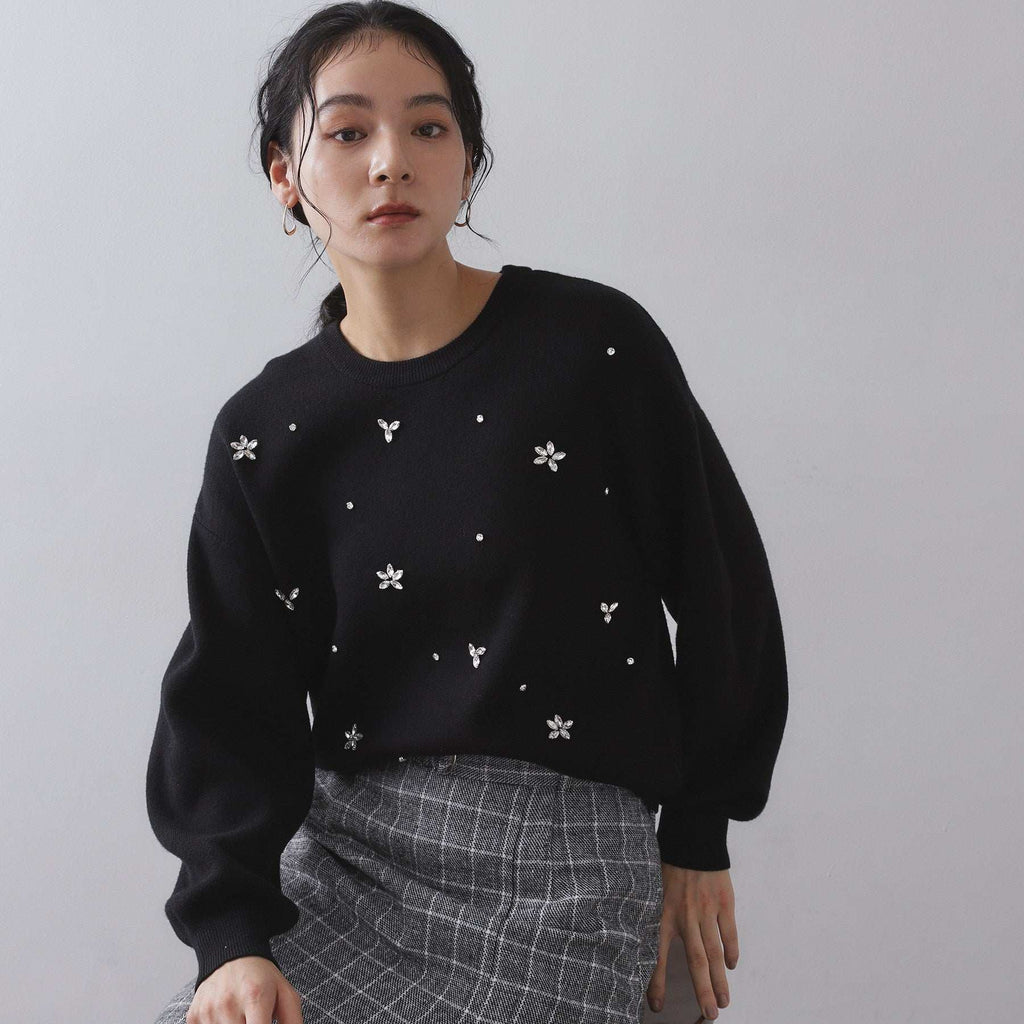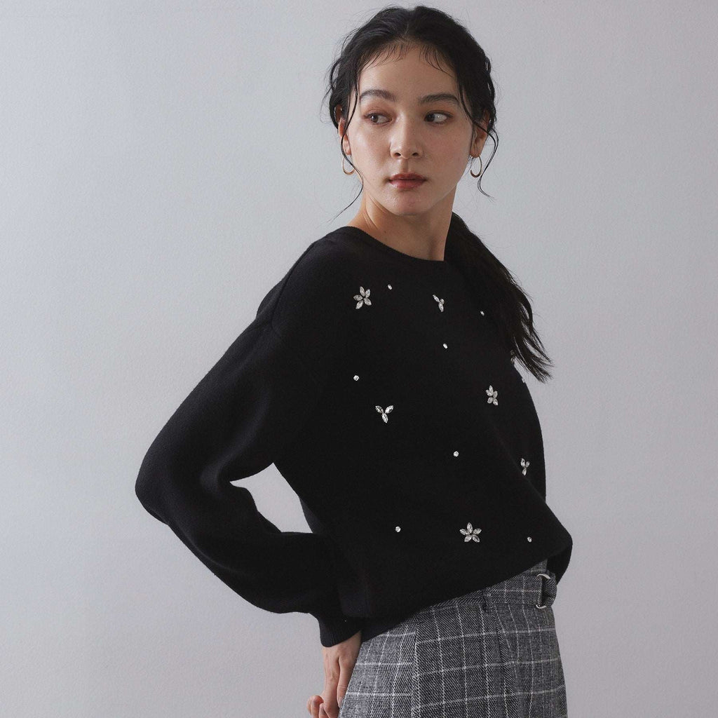 ・ニットトップスの前身頃に、ビジューをあしらった華やかなトップス。