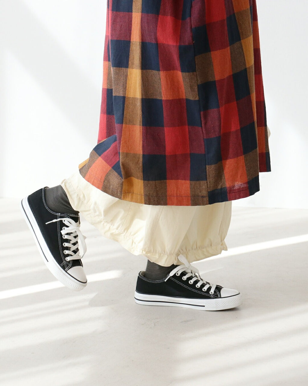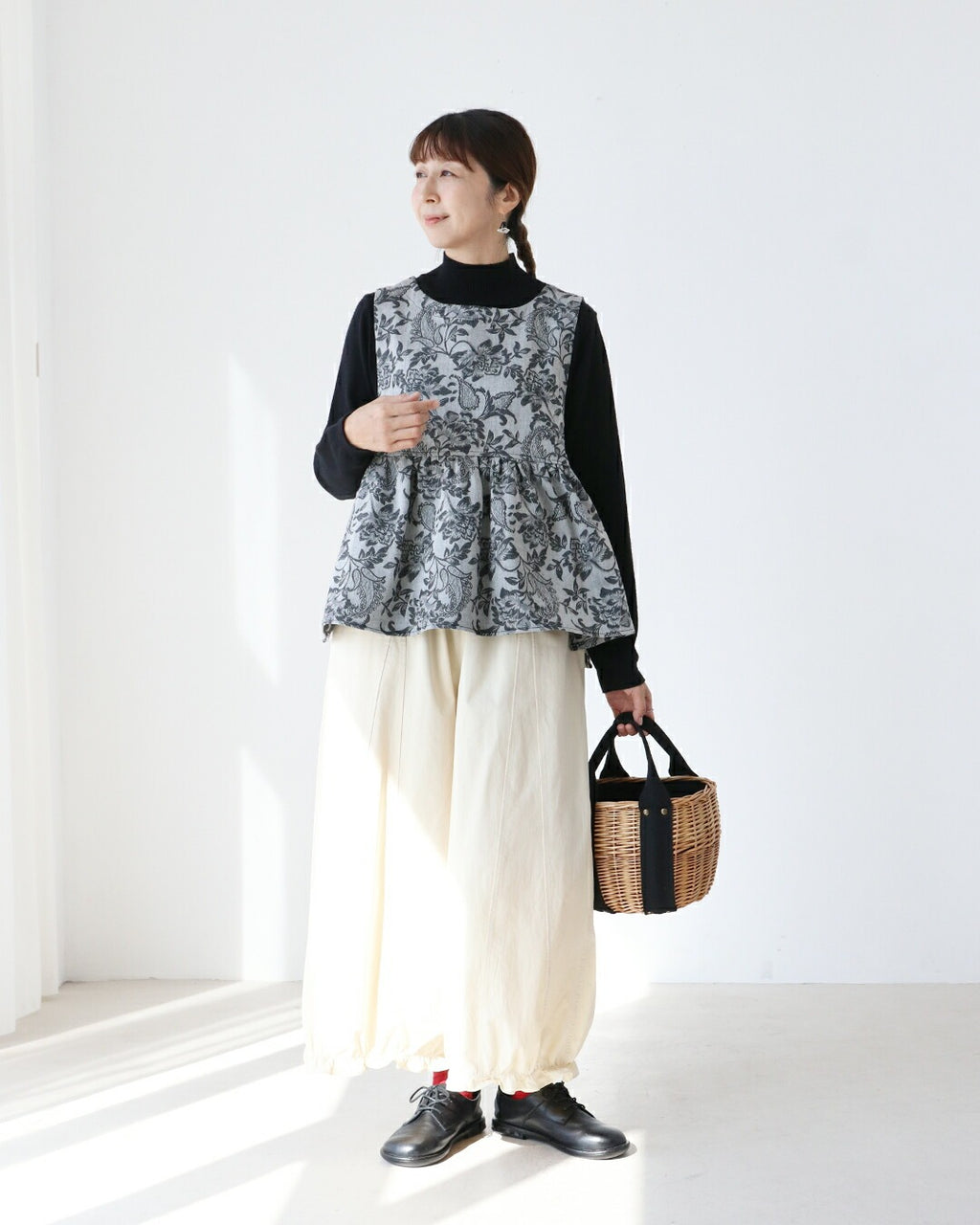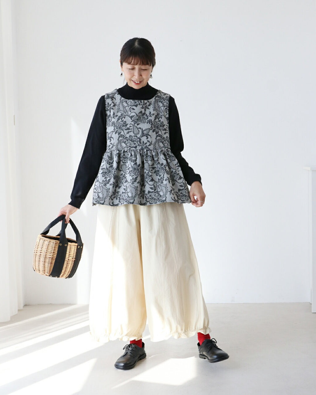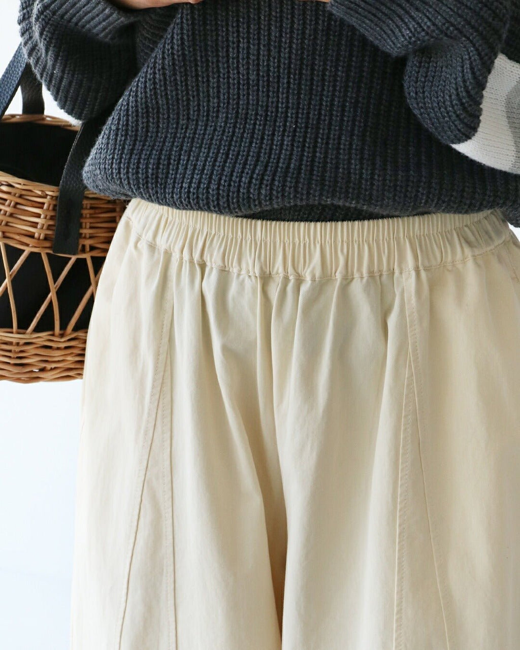 ウエストは総ゴム仕様でフィット感があり、リラクシーな着心地と可愛らしさを両立した一着です。