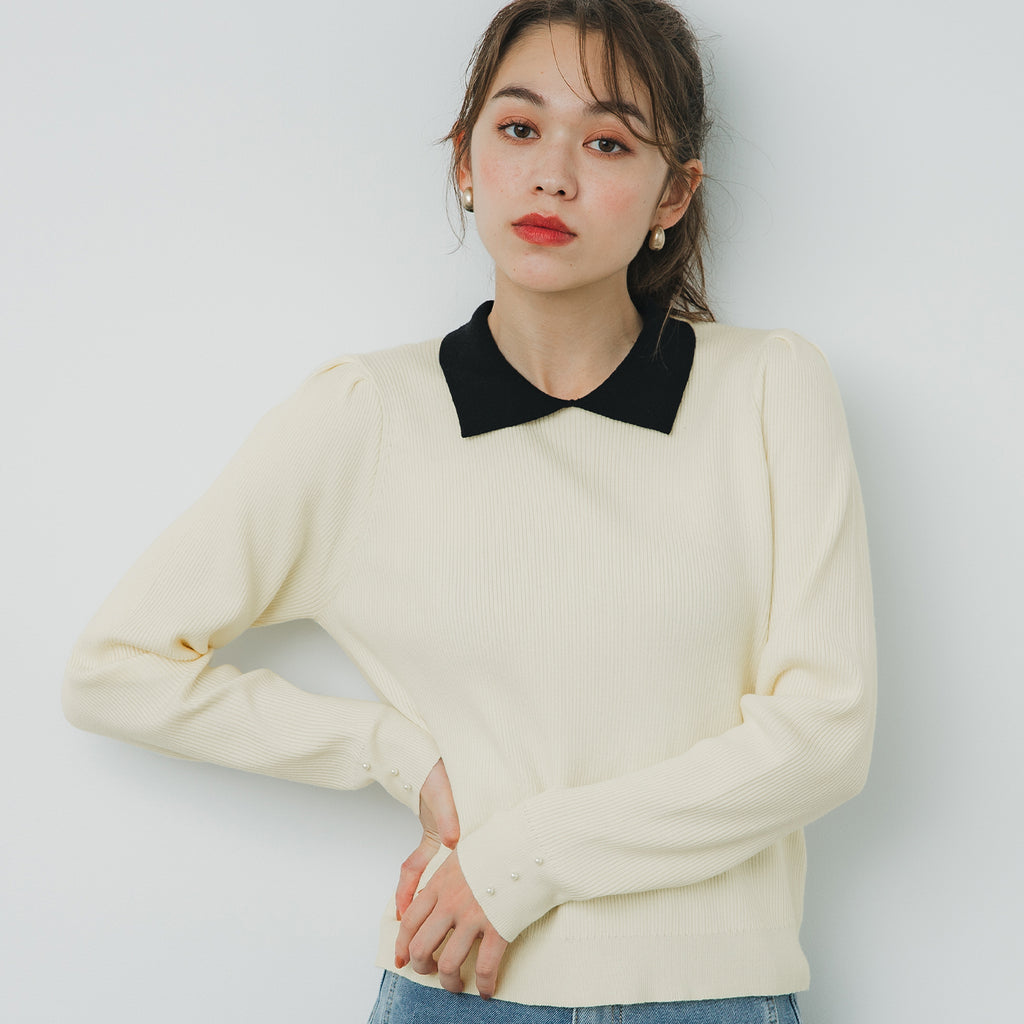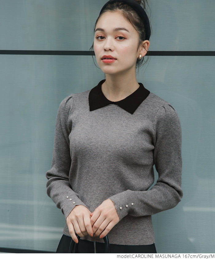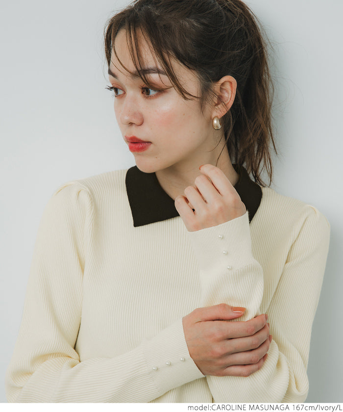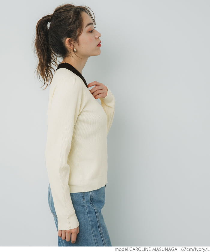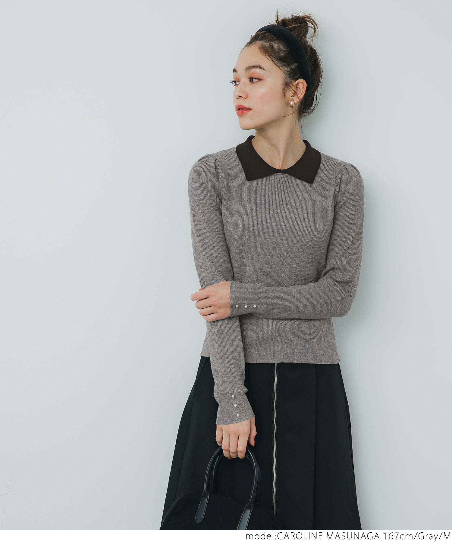 袖口にはさりげなくパールボタンが施されており、女性らしさを引き立てます。