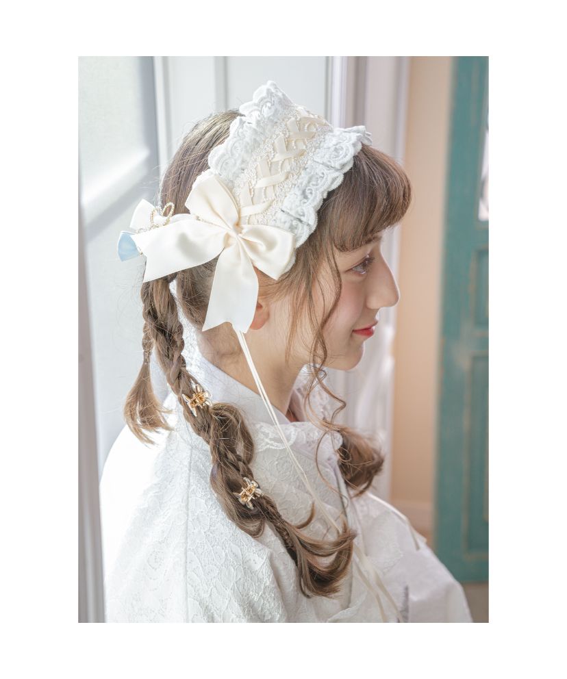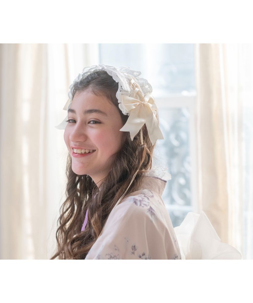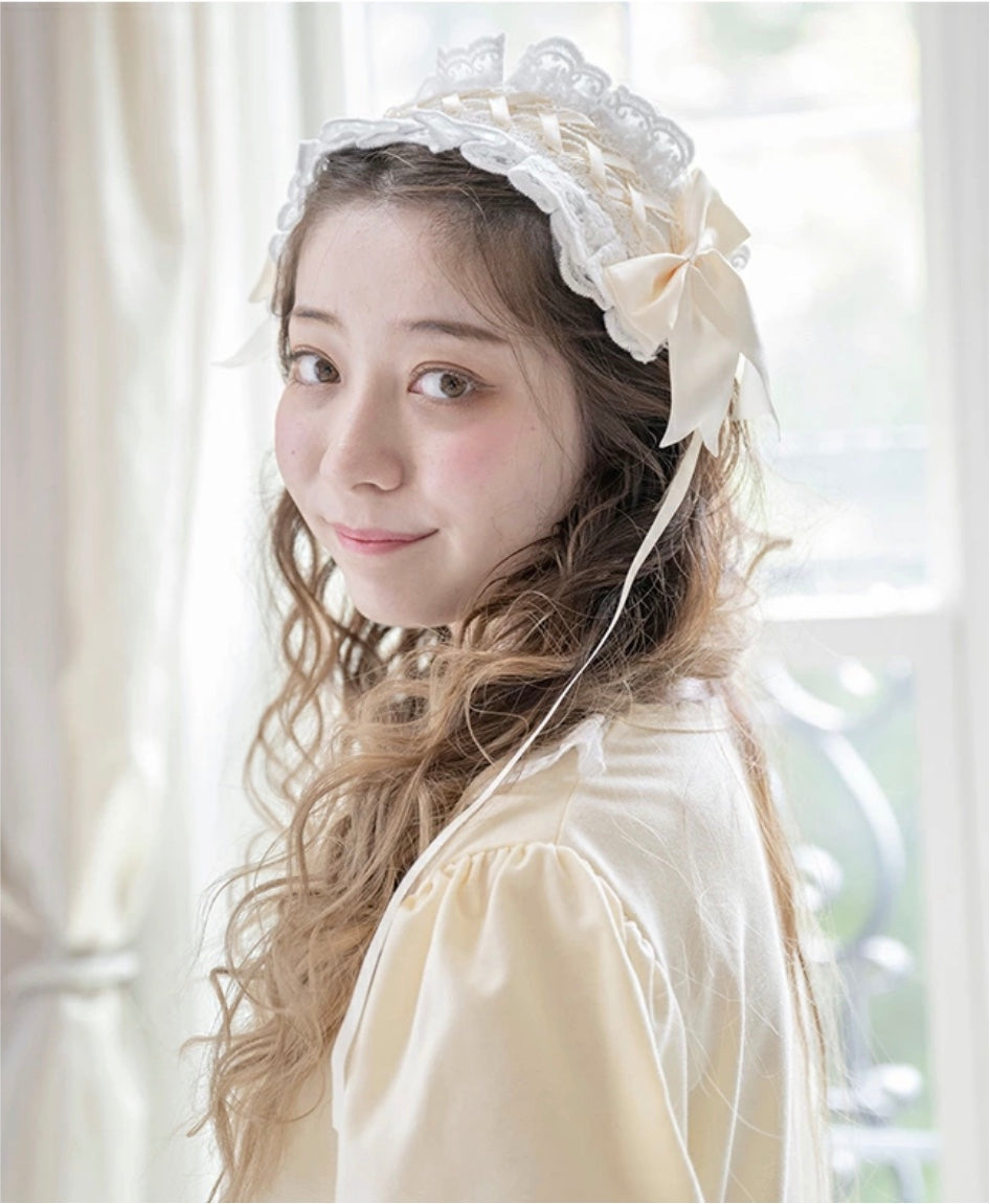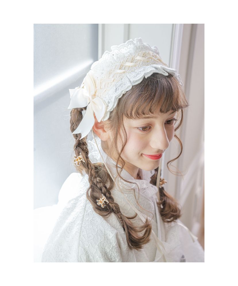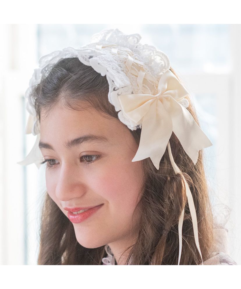 レースとリボンをたっぷりと使ったドーリーなヘッドドレスは、
