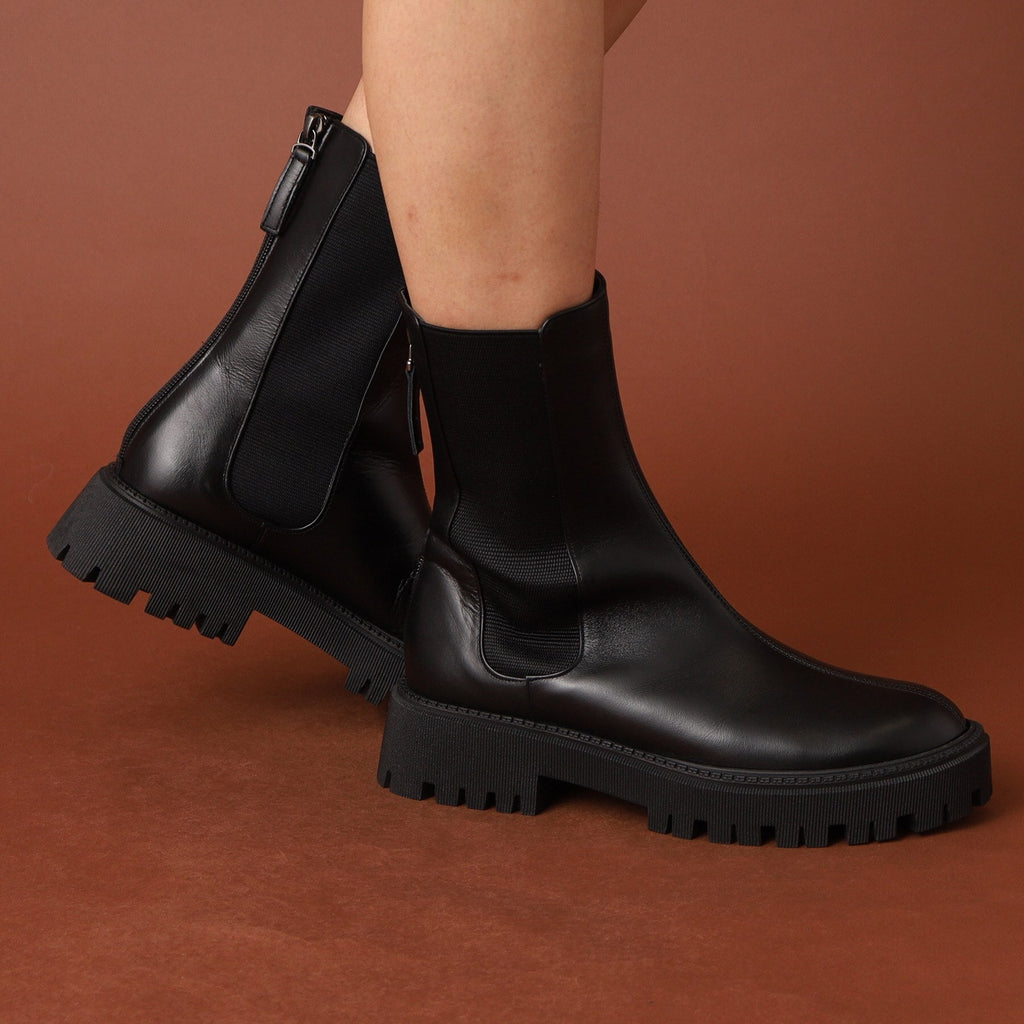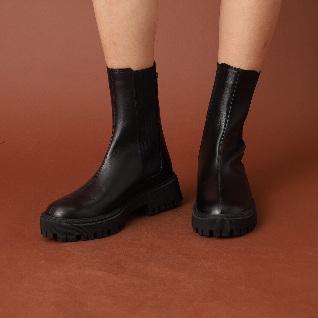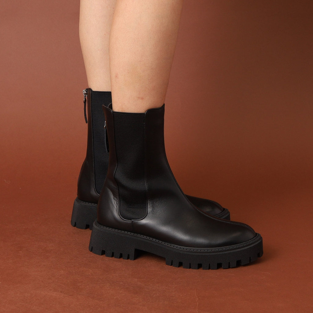 存在感のあるソールと少し長めの丈がトレンドライクなチェルシーブーツ。