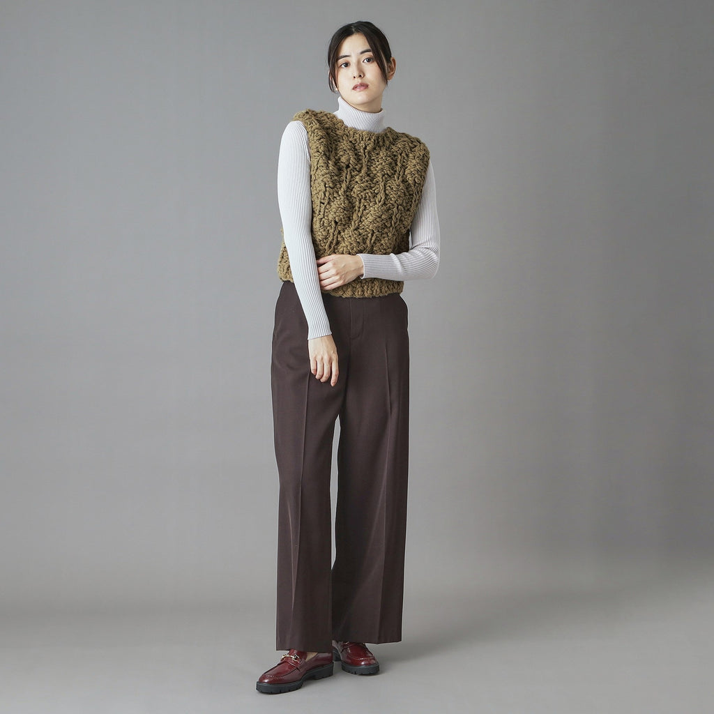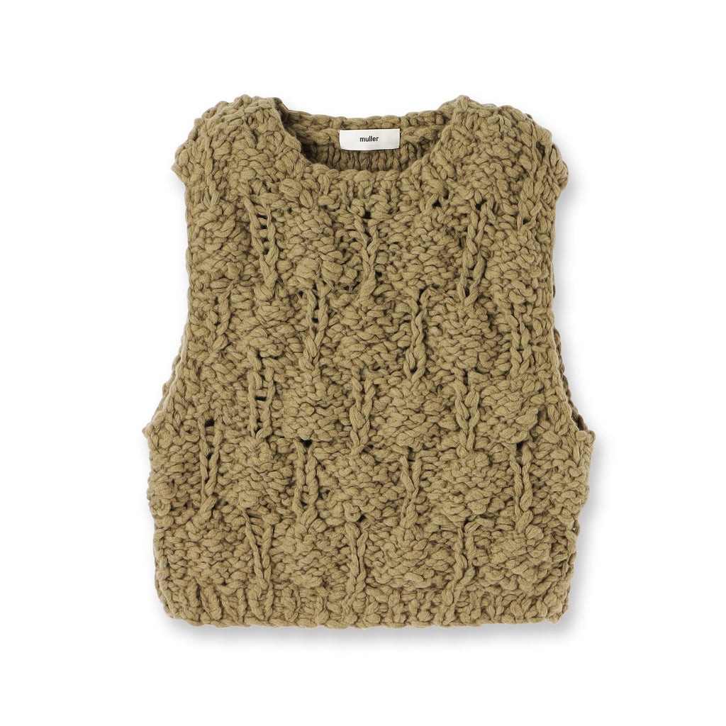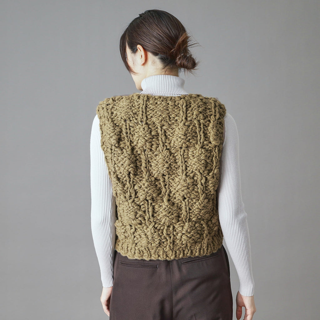 手編みのぬくもりとデザイン性を兼ね備えた、ショート丈のニットベスト
