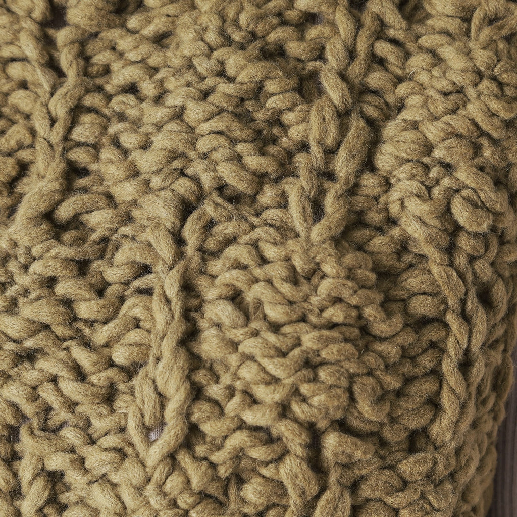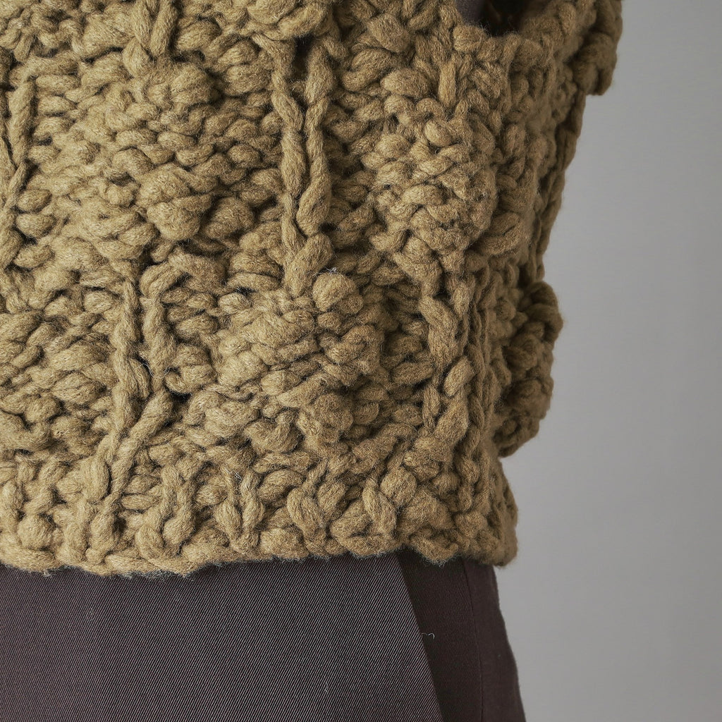 太番手の糸を使用したざっくりとした編み目が特徴で、糸と糸が絡み合うような、不規則で立体的な編地表情を作ります。