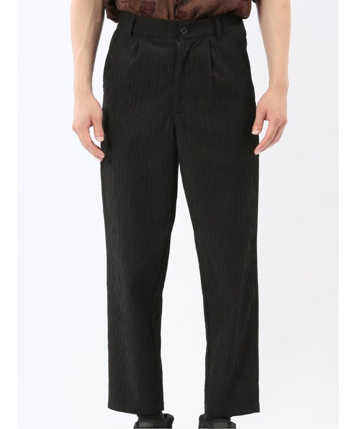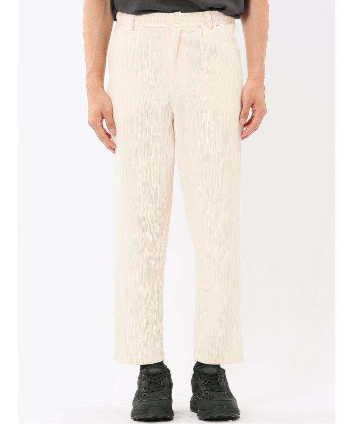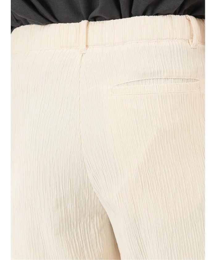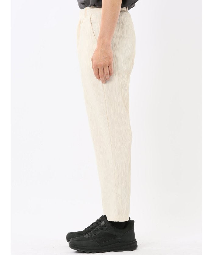 上品さを残しつつラフ感を演出できる、ワンタックのテーパードパンツです。ウエストゴムのイージー仕様で着用ストレスを軽減しています。前ファスナー仕様、ベルト通し付き、ポケット付き、裾部分は加工済みです。(股下M:66-L:67)