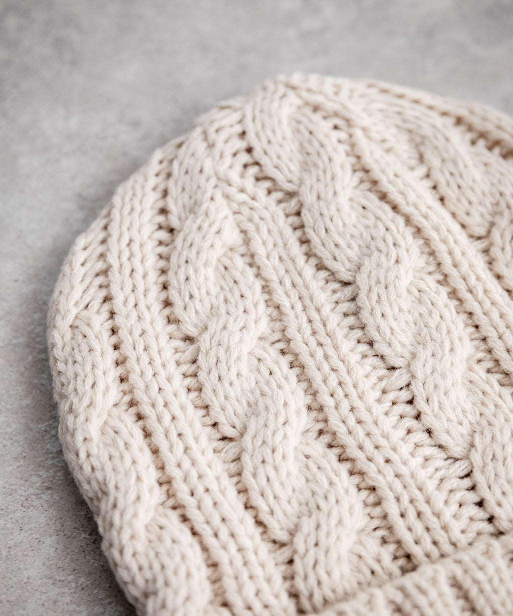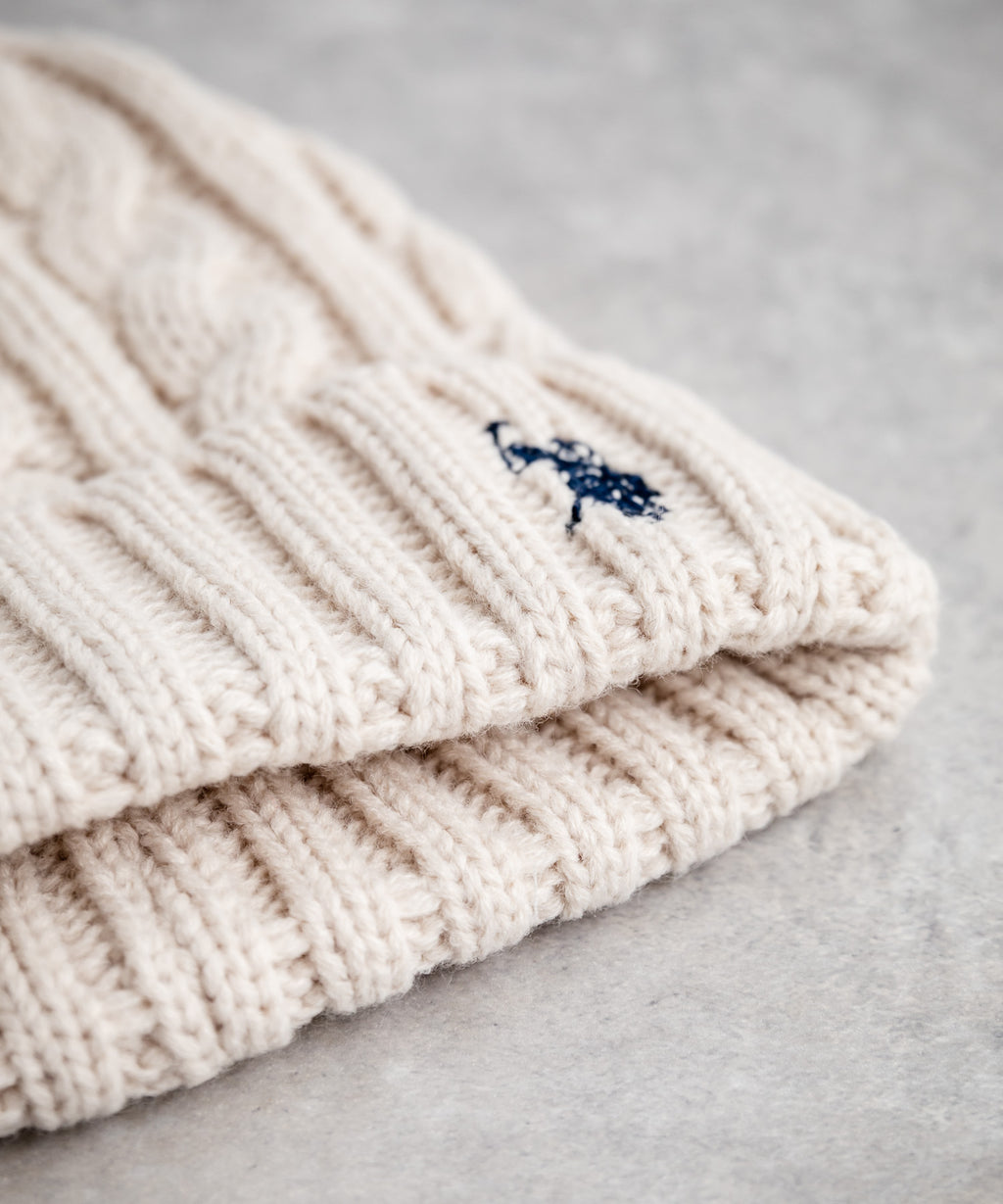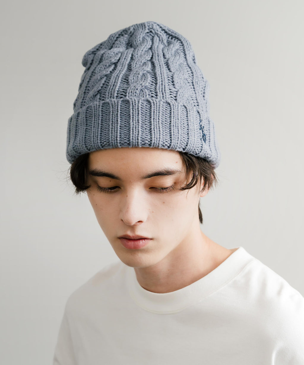 立体的なケーブル編みに、ワンポイントでロゴが施されたシンプルさ。