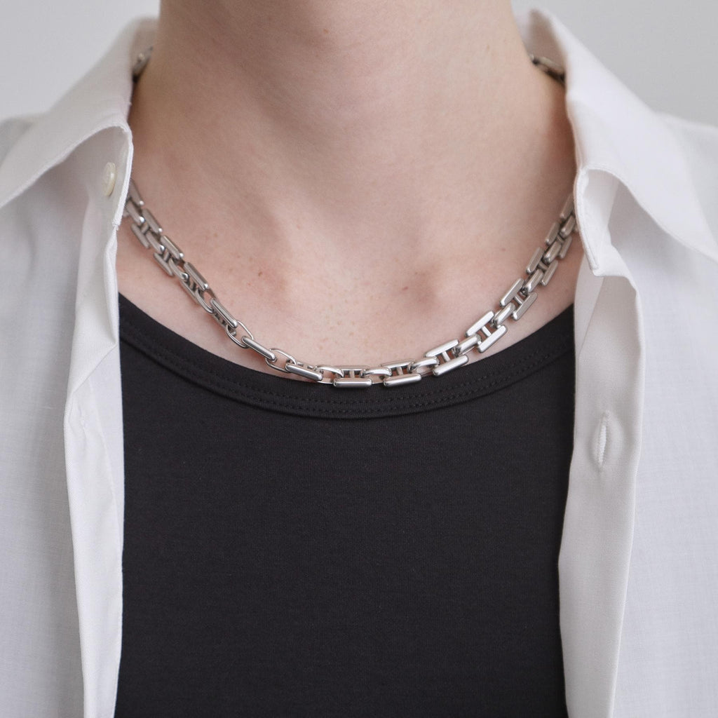 首元にエッジの効いたアクセントを加える、デザイン性の高いチェーンネックレス。