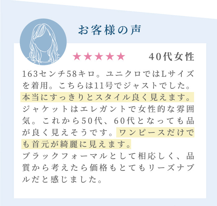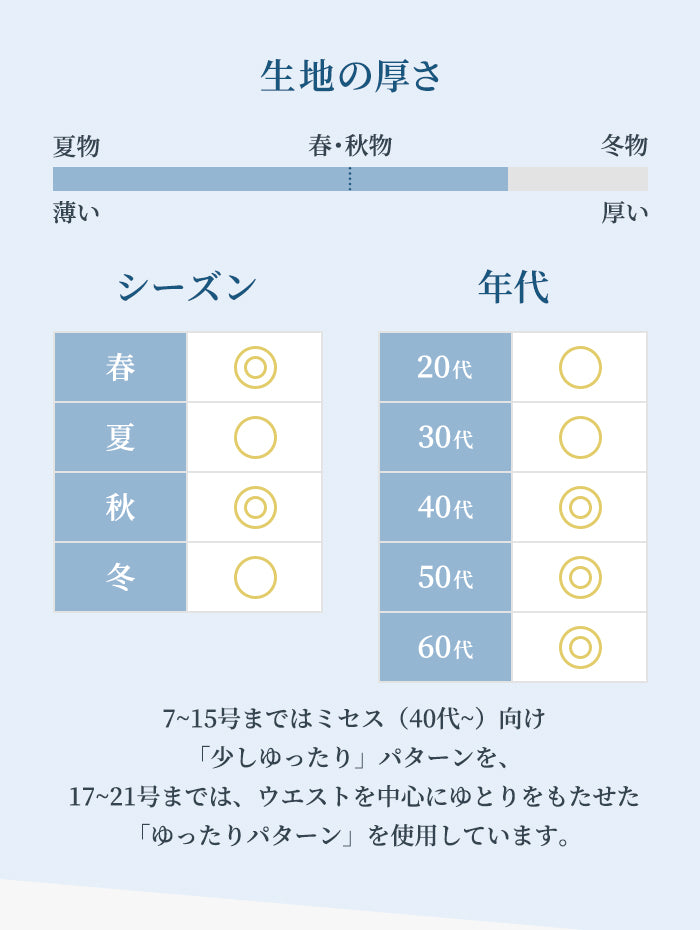 社会的な立場のあるミセス(40代~)に向けた少しゆとりを持たせた安心サイズ。