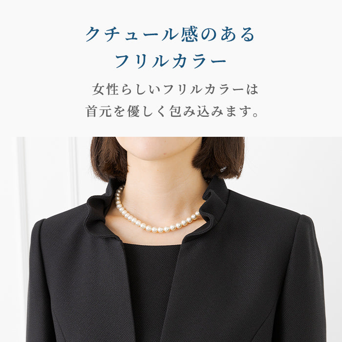 エレガントなソフトフリルカラーのジャケットは、さりげなく首元を隠す優秀デザイン。