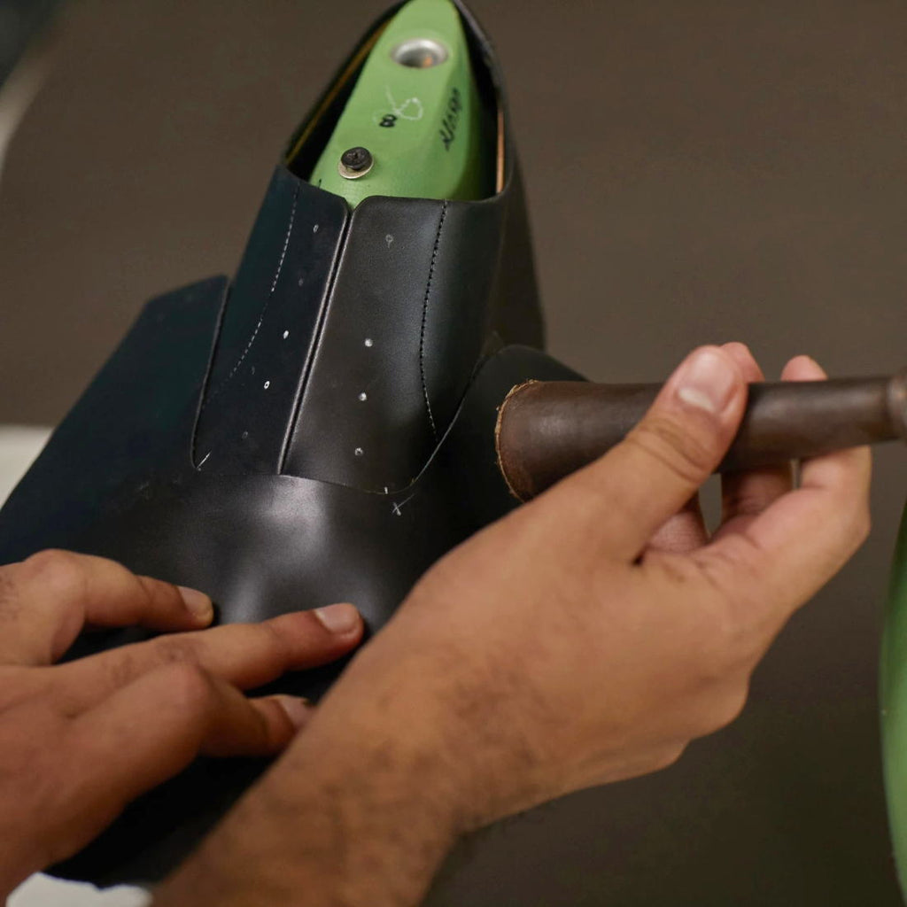 アッパーの縫製(製甲)段階において、極限まで糊を使用せず、またダブラ(補強材)も必要最小限に減らすことで、革への負担・ストレスをやわらげ、天然皮革本来の風合いと機能を最大限に引き出しております。