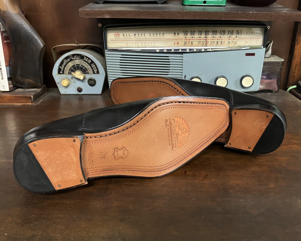 ヒールはグッドイヤー製法と同じように、ソール全周にマッケイ縫いをしたのち、ヒールをソールに後付け。さらにウェルト(コバ)には手作業による【ツメ出し加工】を施し、ヒール周りもハンドトリミングした、手の込んだ底付け技術で作られております。