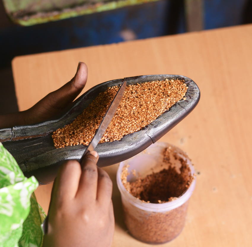 つり込み後のアッパーの裏側やソールと中底の空間(中物)には、ポルトガル製の『粒練りコルク』をふんだんに充填。グッドイヤー製法の靴と同じように、履きこむほどに、履かれる方の足型に合わせてコルクが「沈みこみ」、やがて履かれる方の足型(足裏)の形状に沿うインソール(中底)に変化してゆきます。