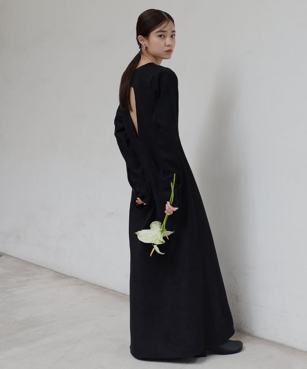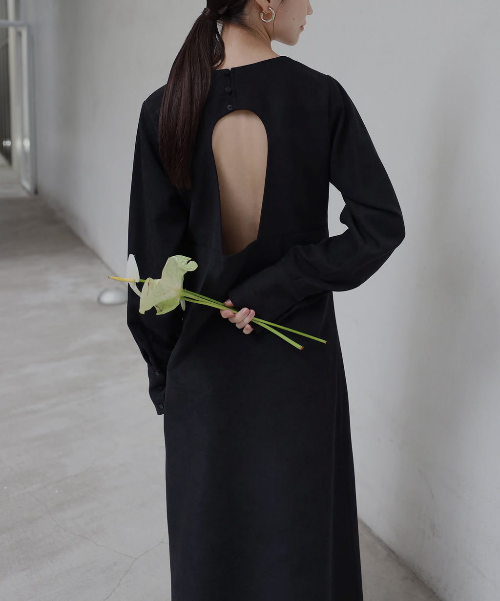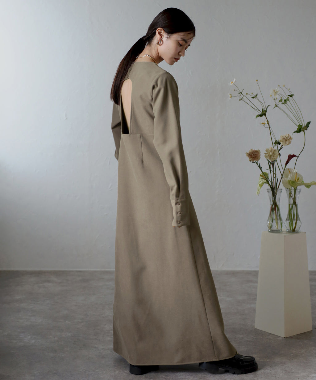 上品さと抜け感を纏う、エレガントなバックオープンワンピース微起毛素材がほどよい温もりを与え、季節感を引き立てるワンピース。