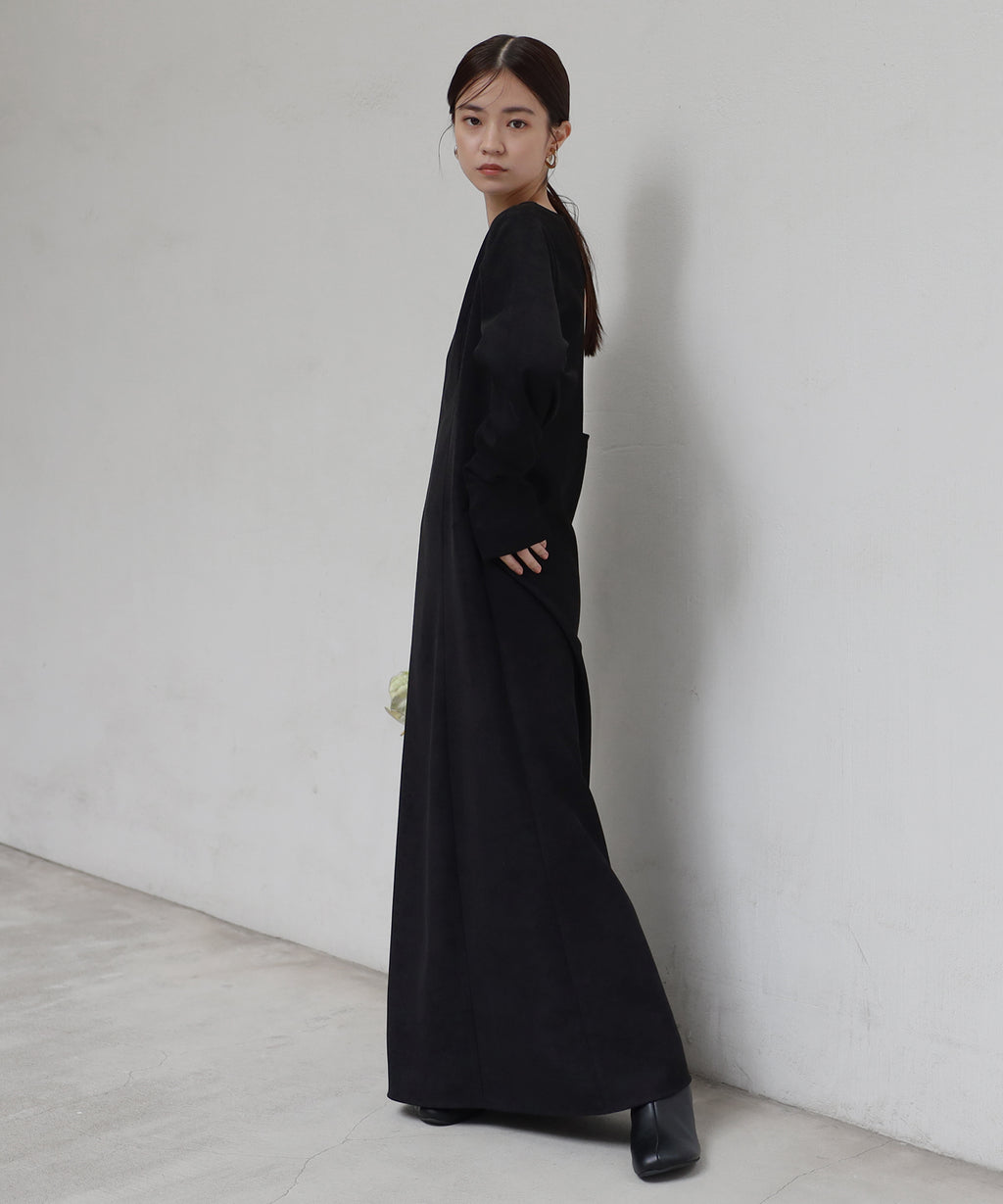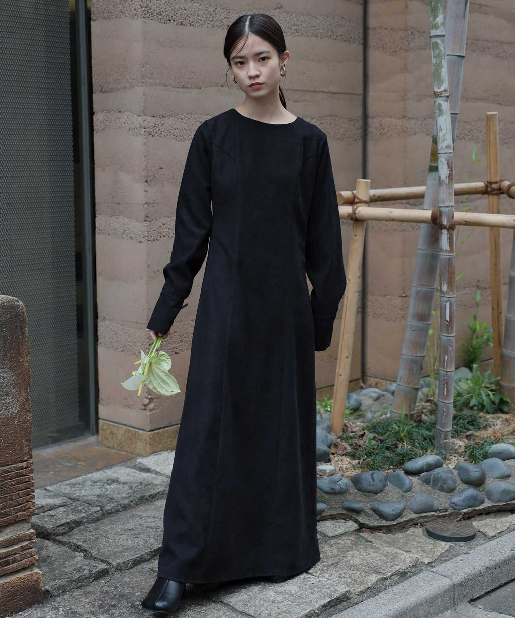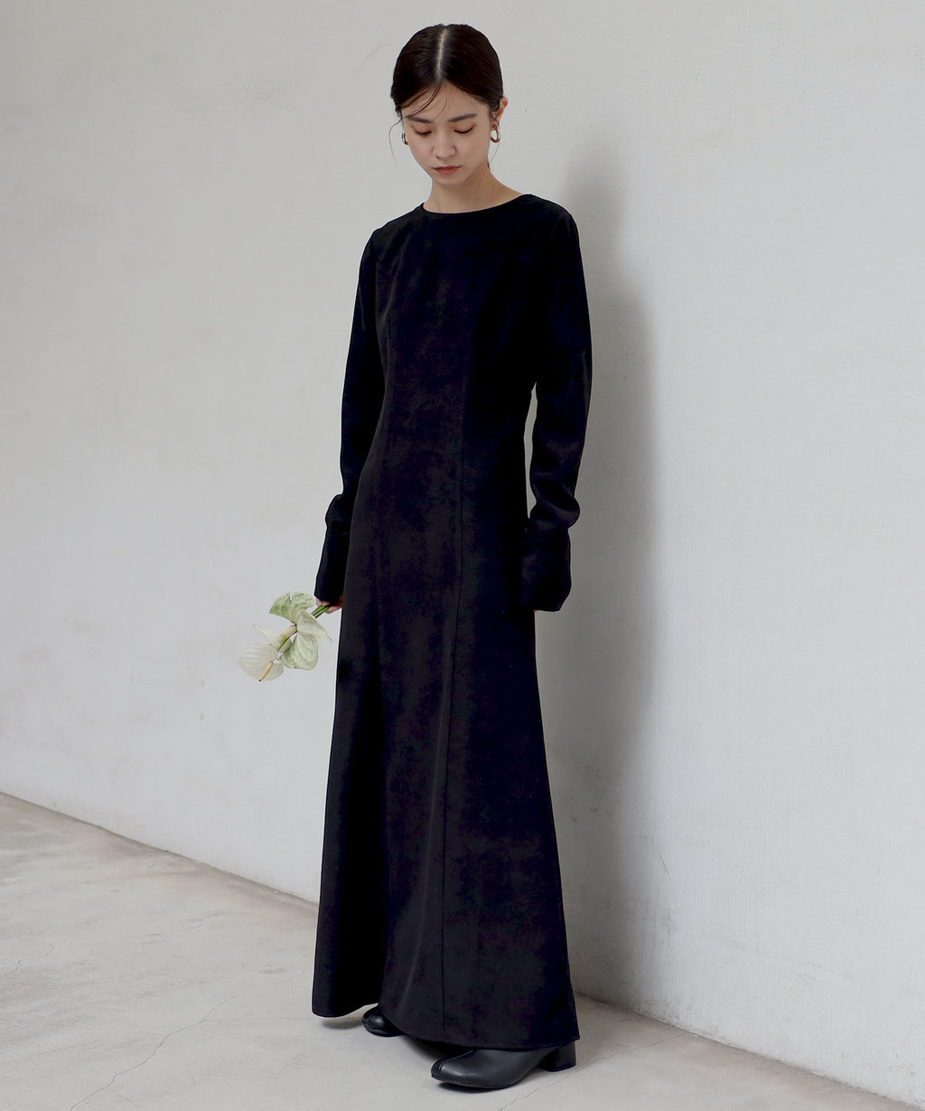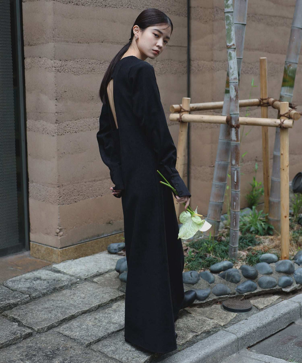 上品さと抜け感を纏う、エレガントなバックオープンワンピース微起毛素材がほどよい温もりを与え、季節感を引き立てるワンピース。