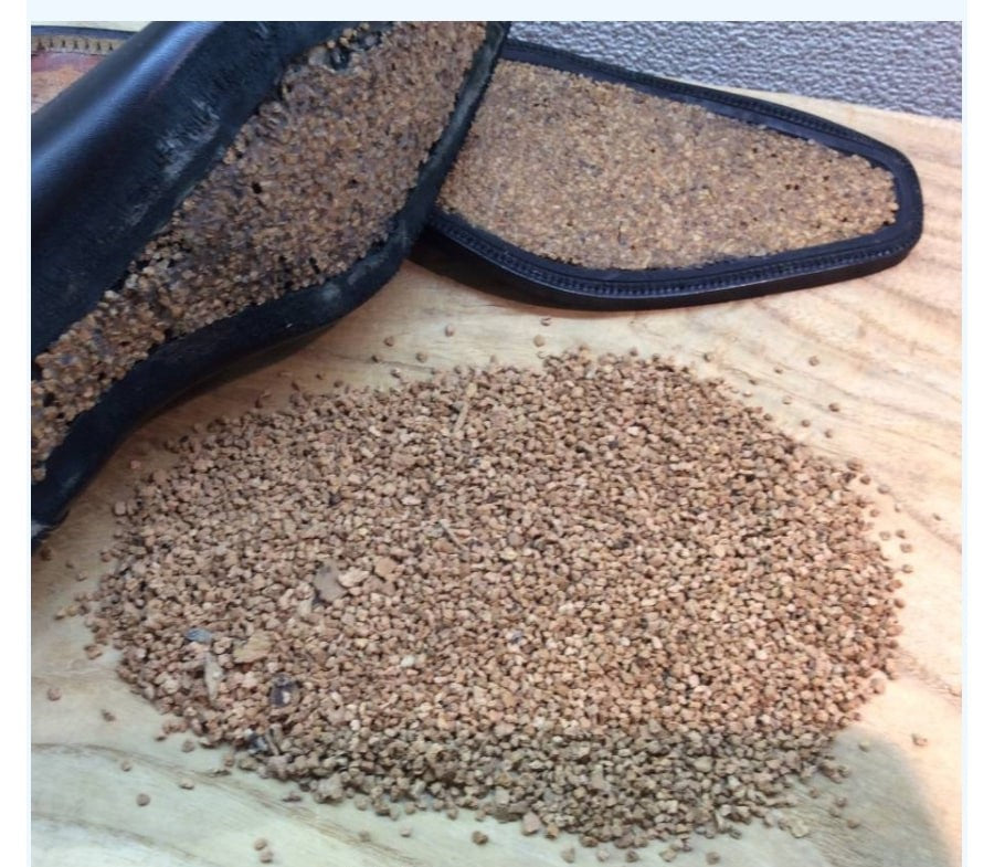 つり込み後のアッパーの裏側やソールと中底の空間には、(中物には)ポルトガル製の『粒練りコルク』をふんだんに充填。グッドイヤー製法の靴と同じように、履きこむほどに、履かれる方の足型に合わせてコルクが「沈みこみ」、やがて履かれる方の足型の形状に沿うインソール(中底)に変化してゆきます。