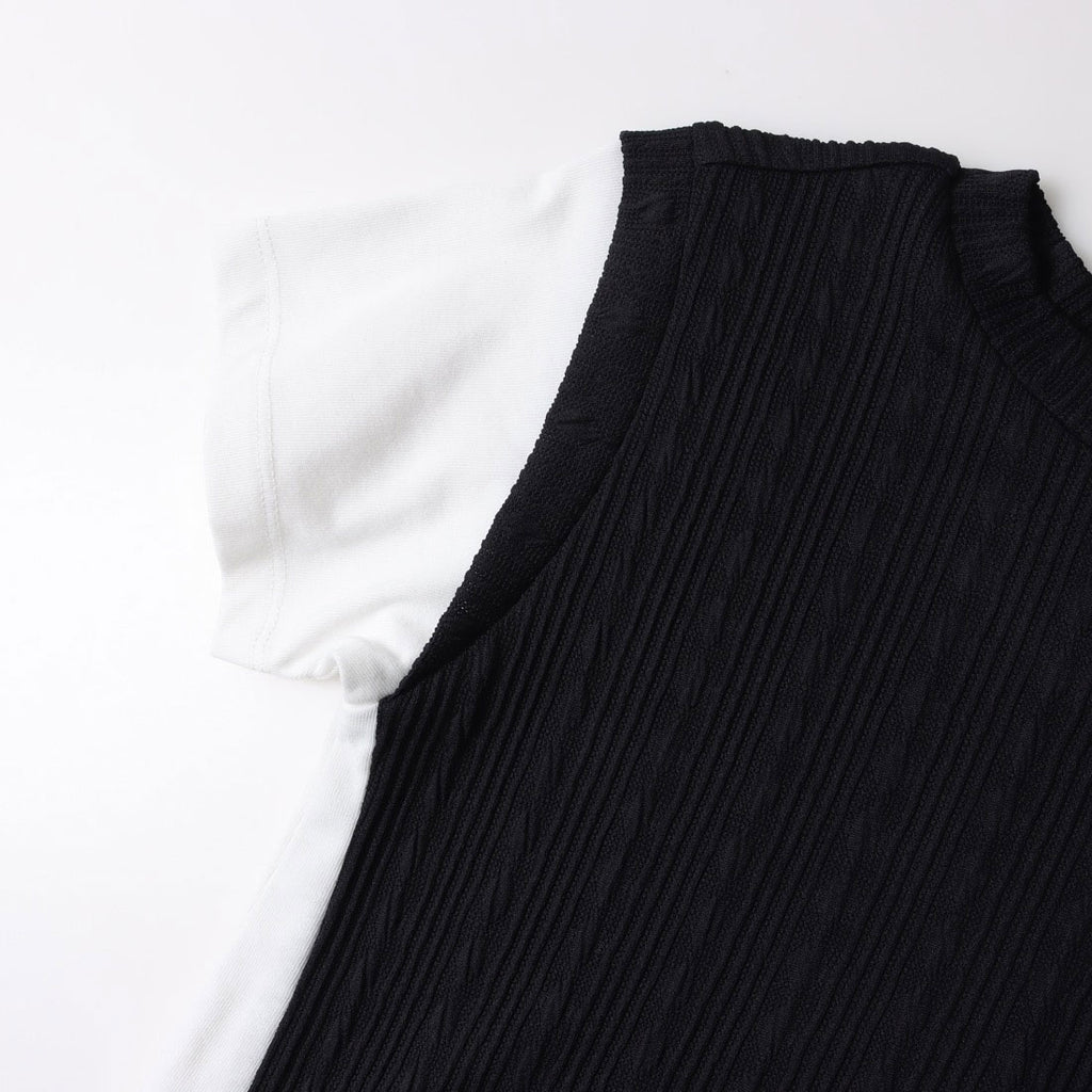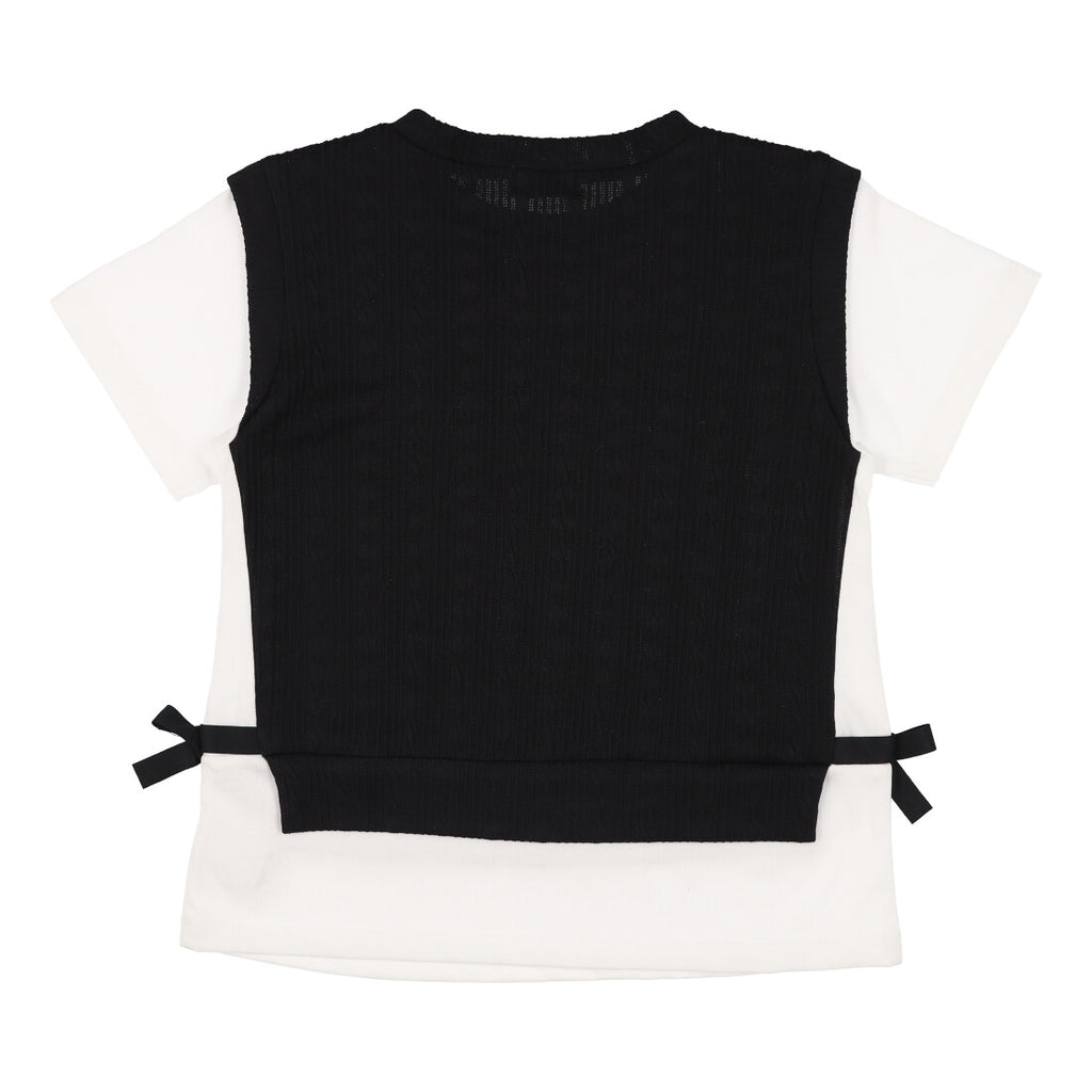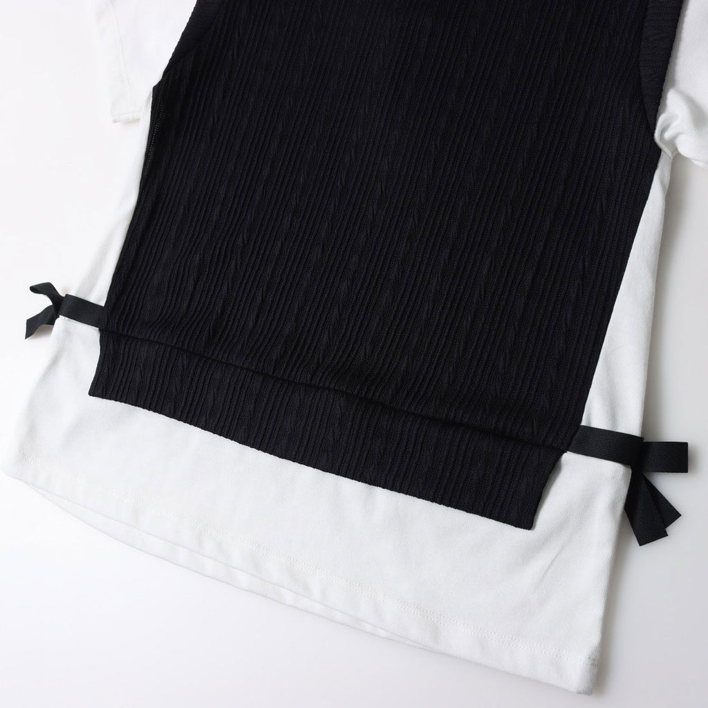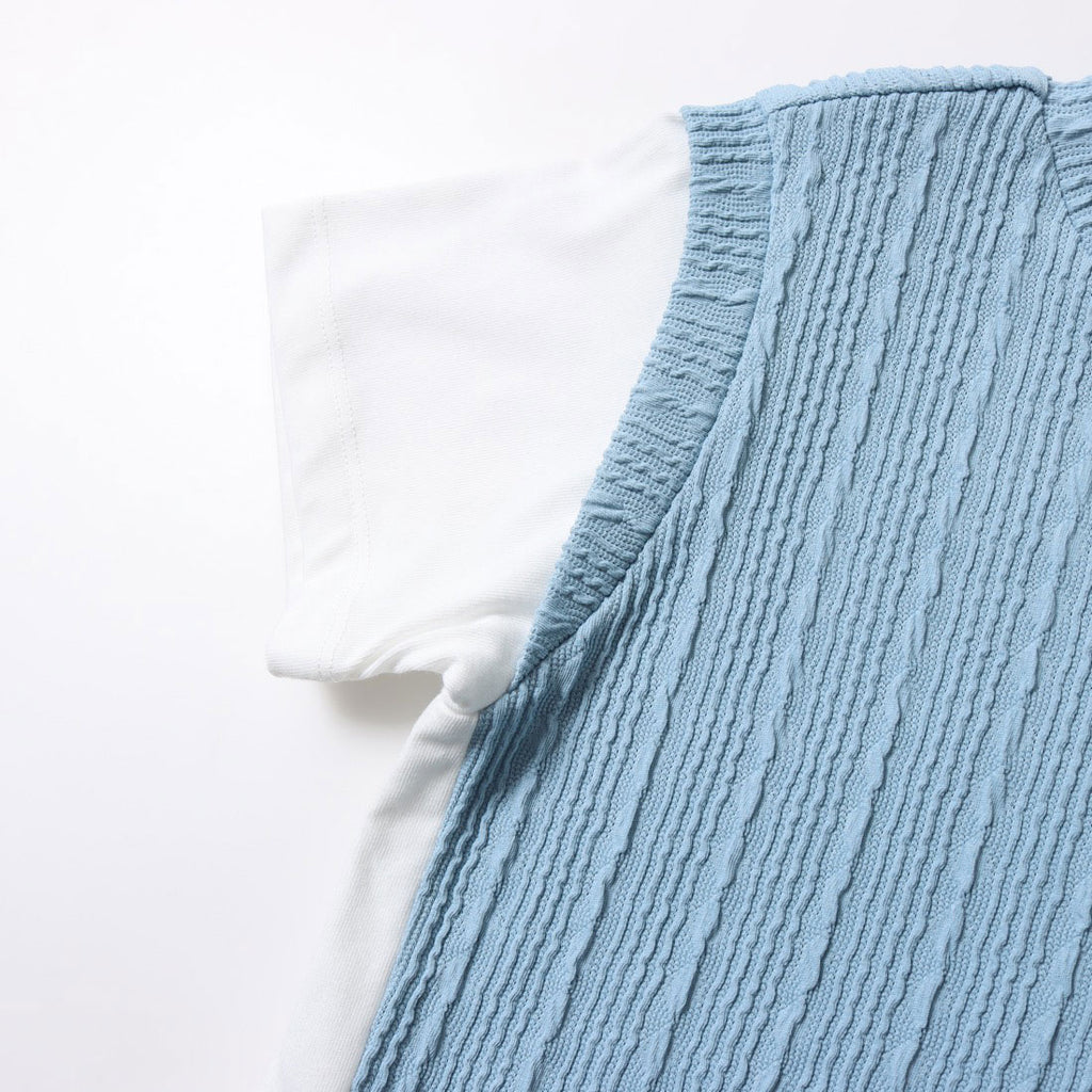 凹凸感のあるフクレジャカードをベスト風に身頃に使用したフェイクレイヤードTシャツです。