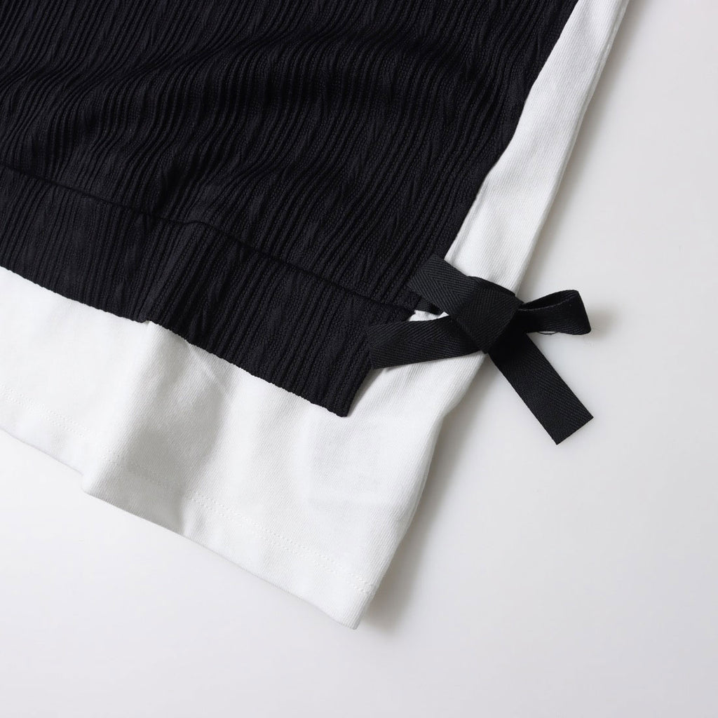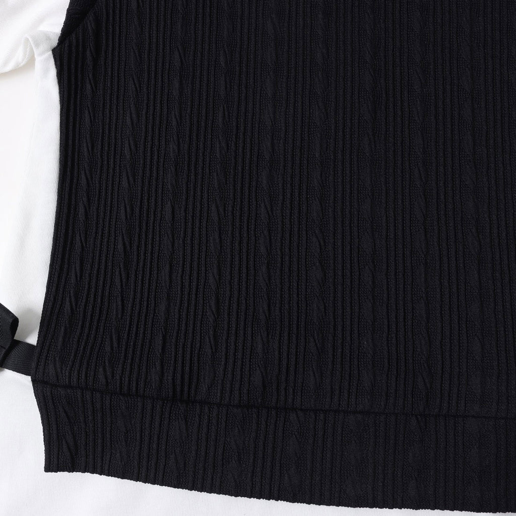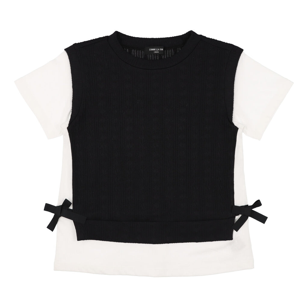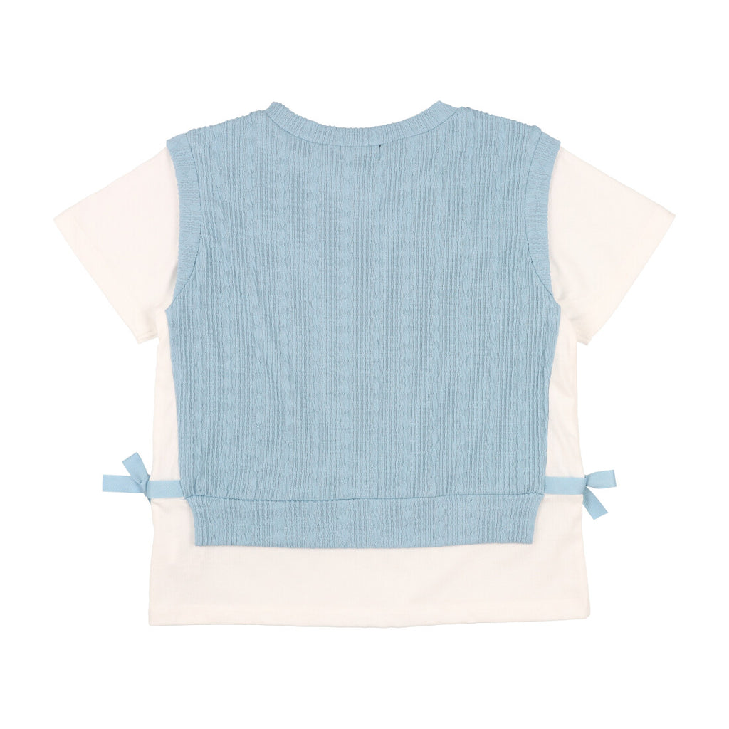 凹凸感のあるフクレジャカードをベスト風に身頃に使用したフェイクレイヤードTシャツです。