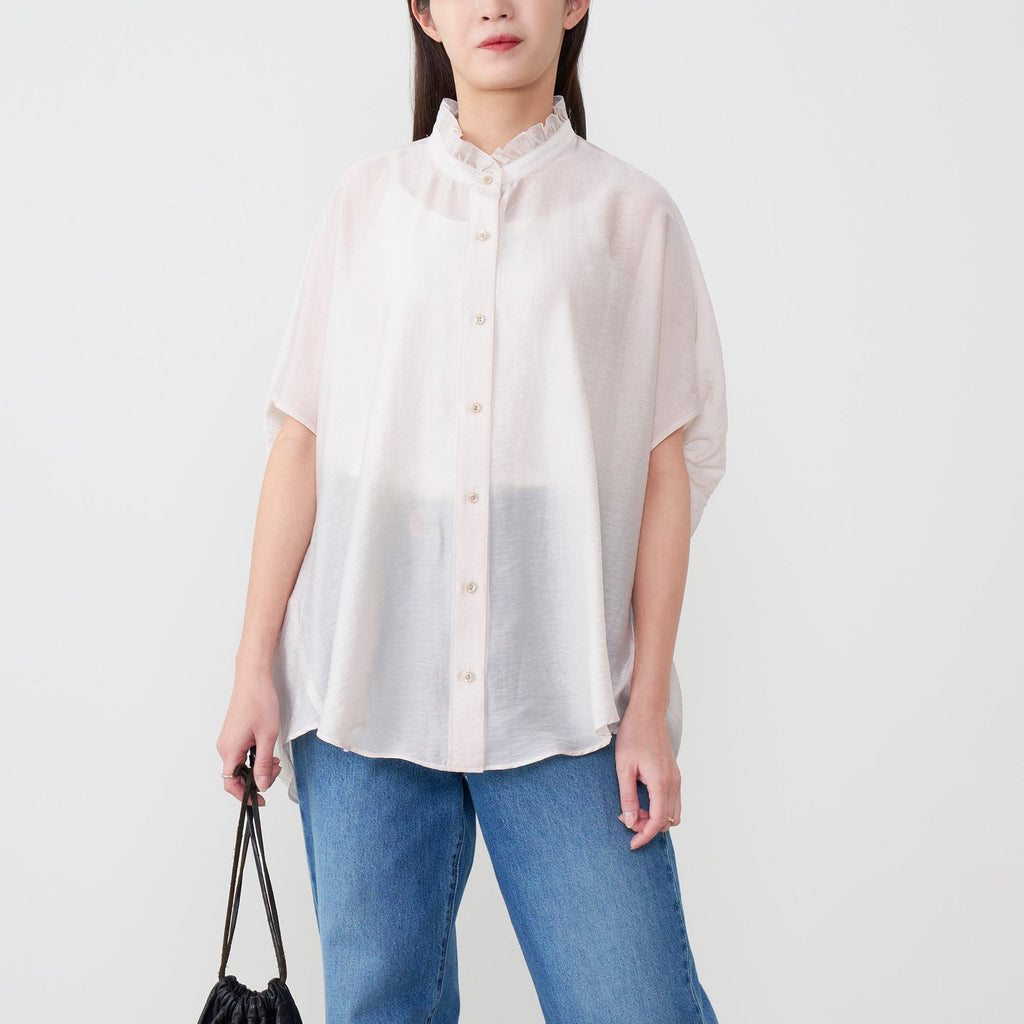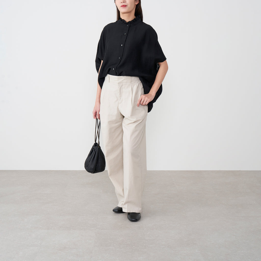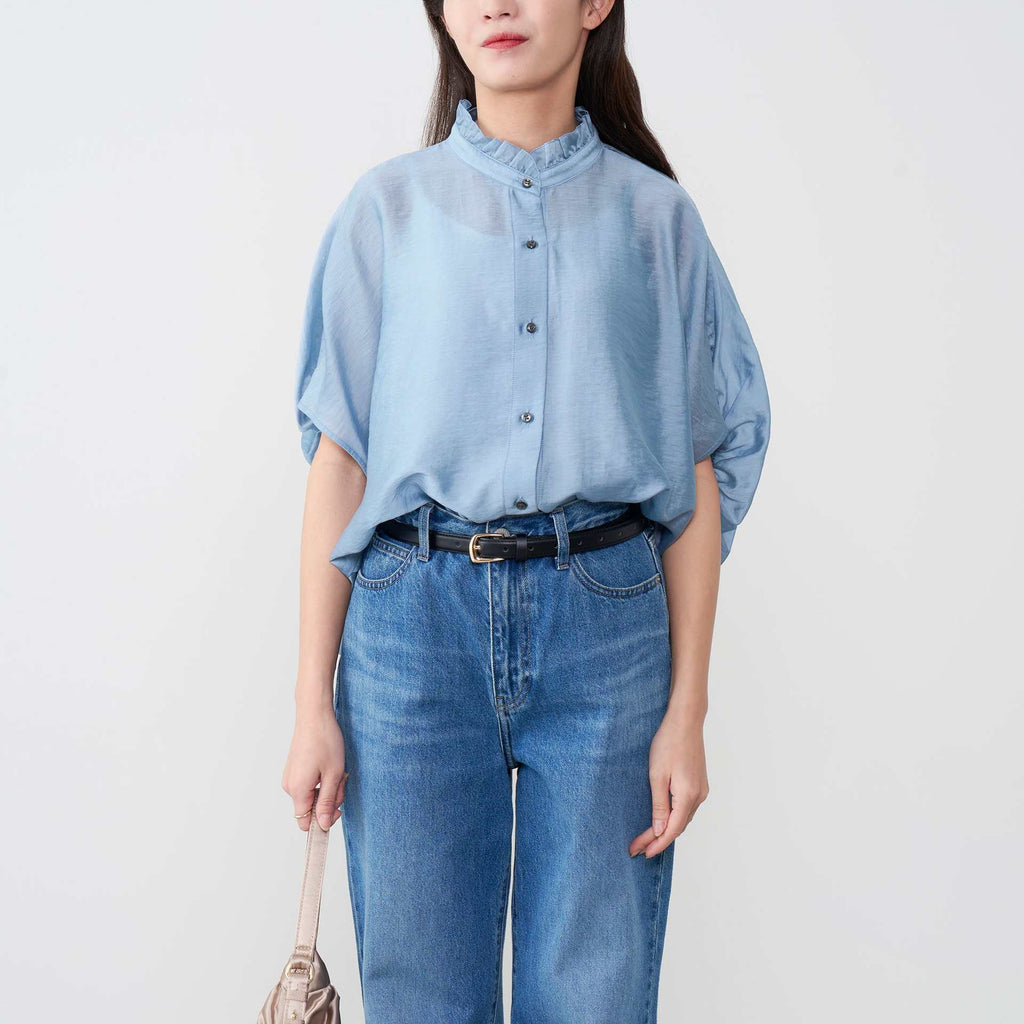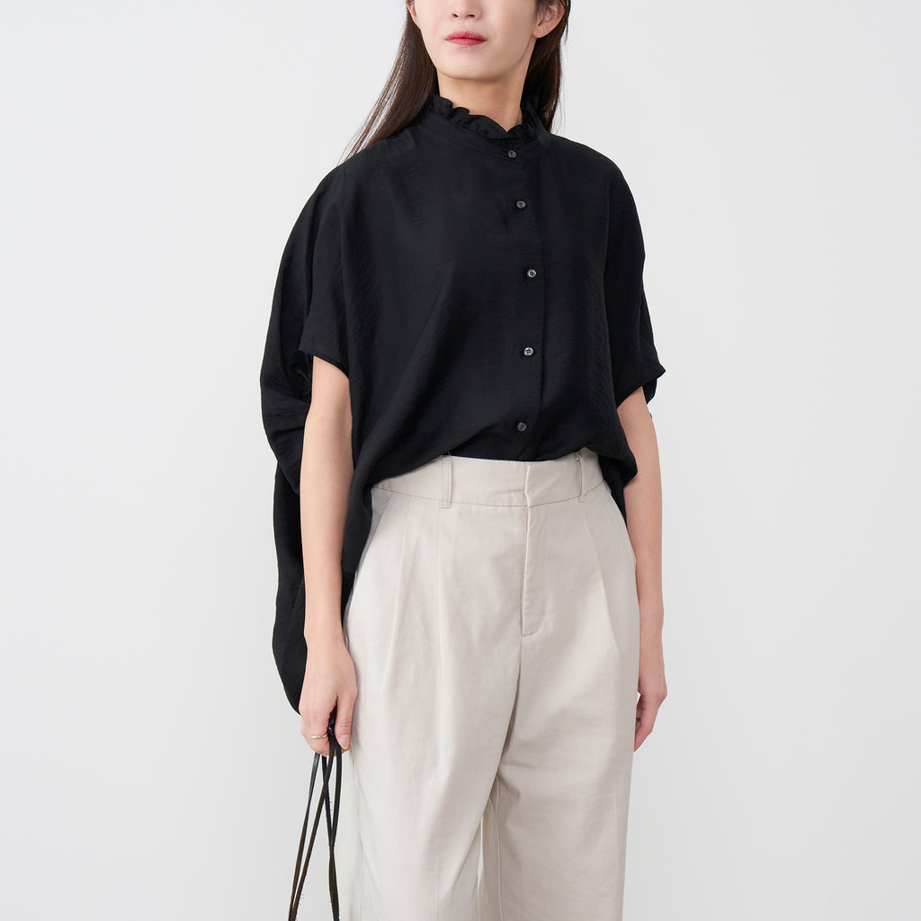 ボリュームのあるシルエットと程よい光沢感が特徴のフリルネックブラウス。