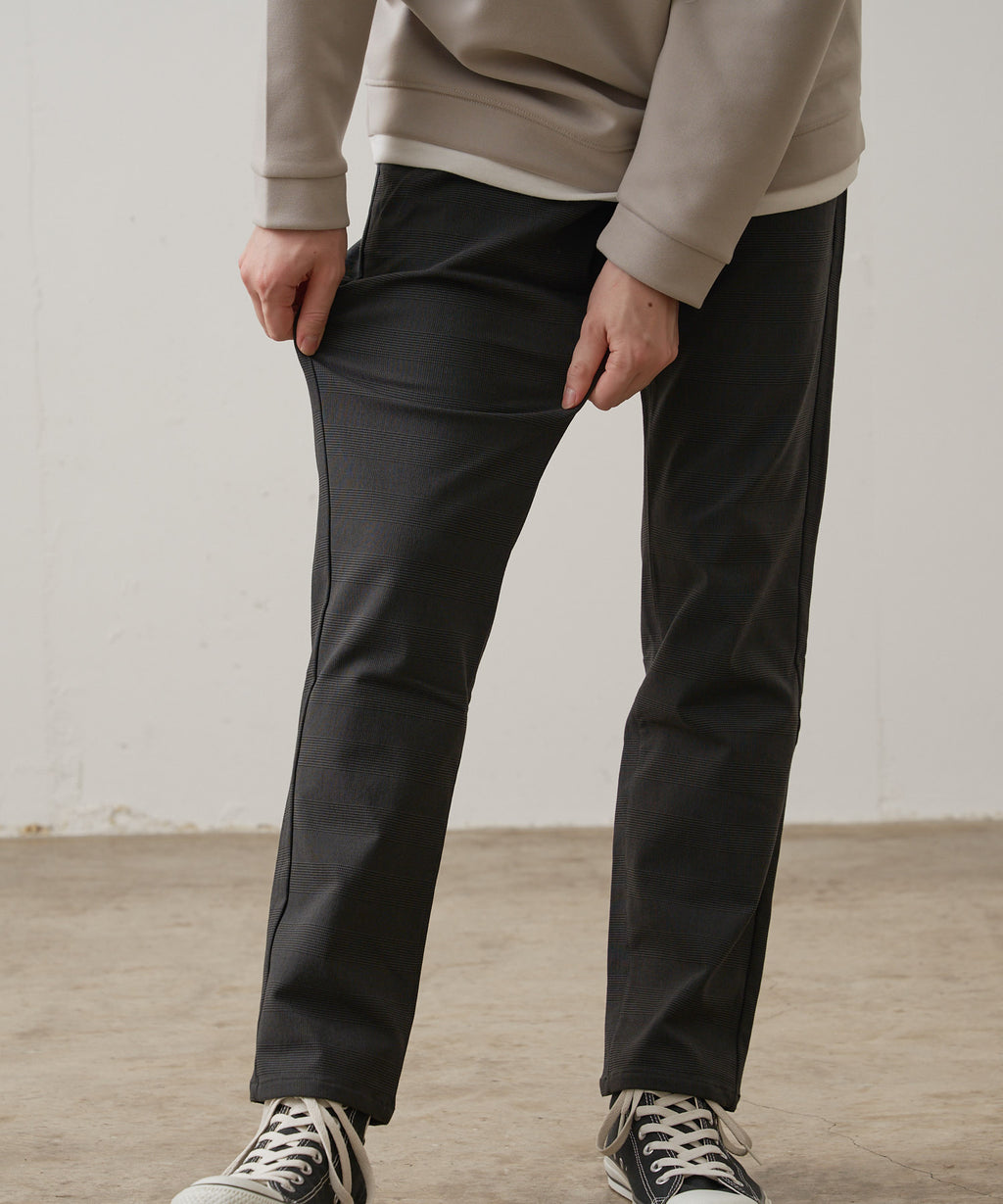 伸縮性抜群のストレッチ素材を使用。優しい着用感とキレイめムードを両立した賢いタックパンツは、オンにもオフにも大活躍すること間違いなし。起毛感のある素材でシーズンらしさもしっかりとキープした一本です。