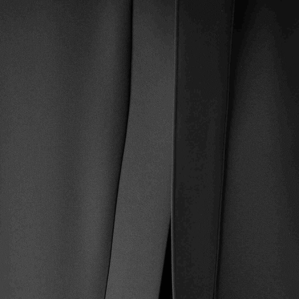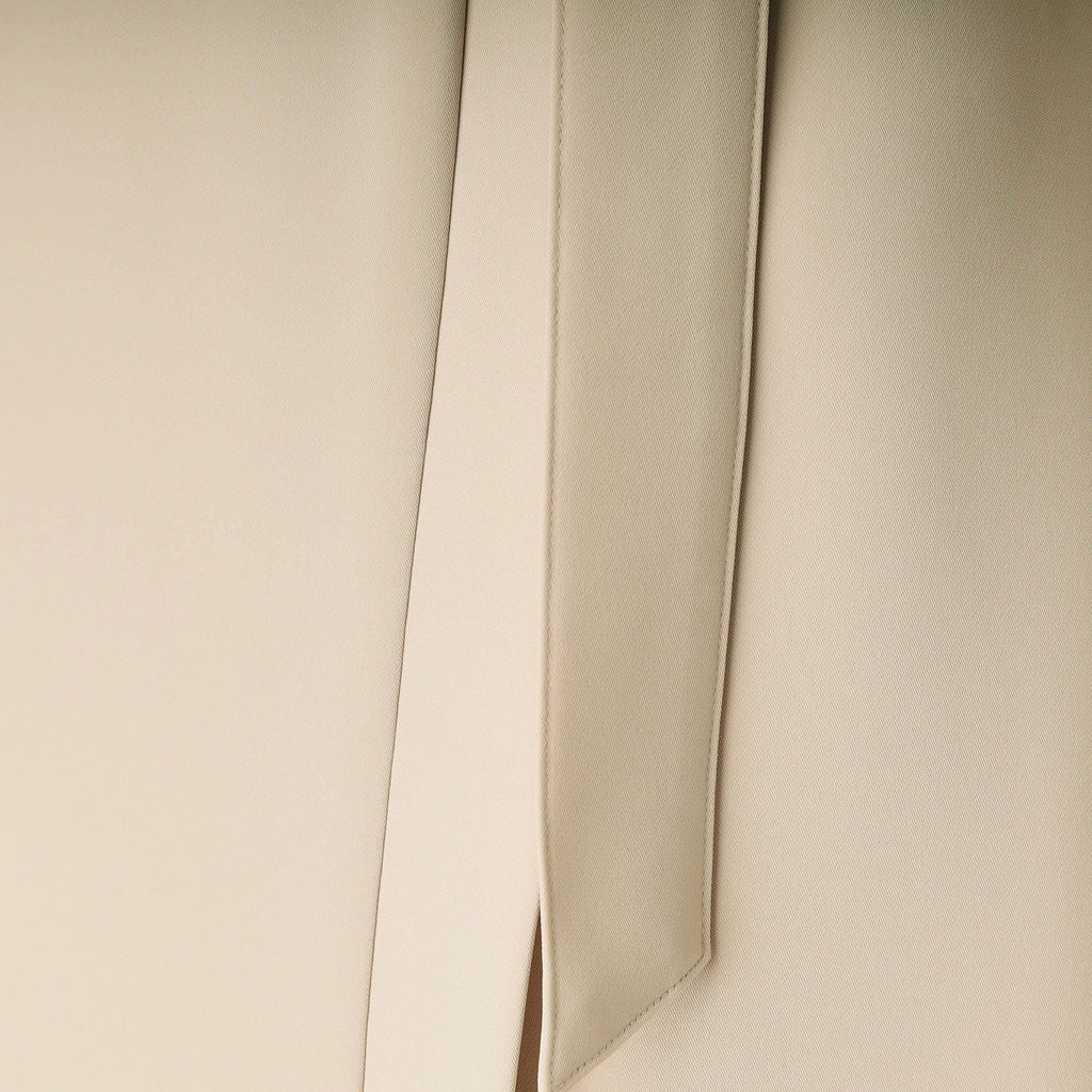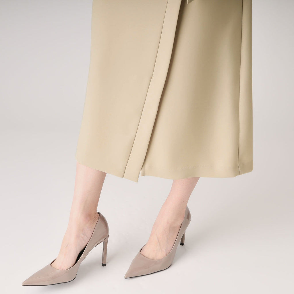 バックル付きの共地のリボンベルトがウエストを美しく引き締め、全体のバランスを整えます。