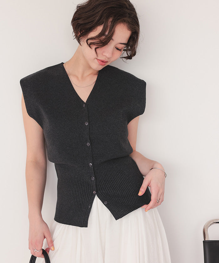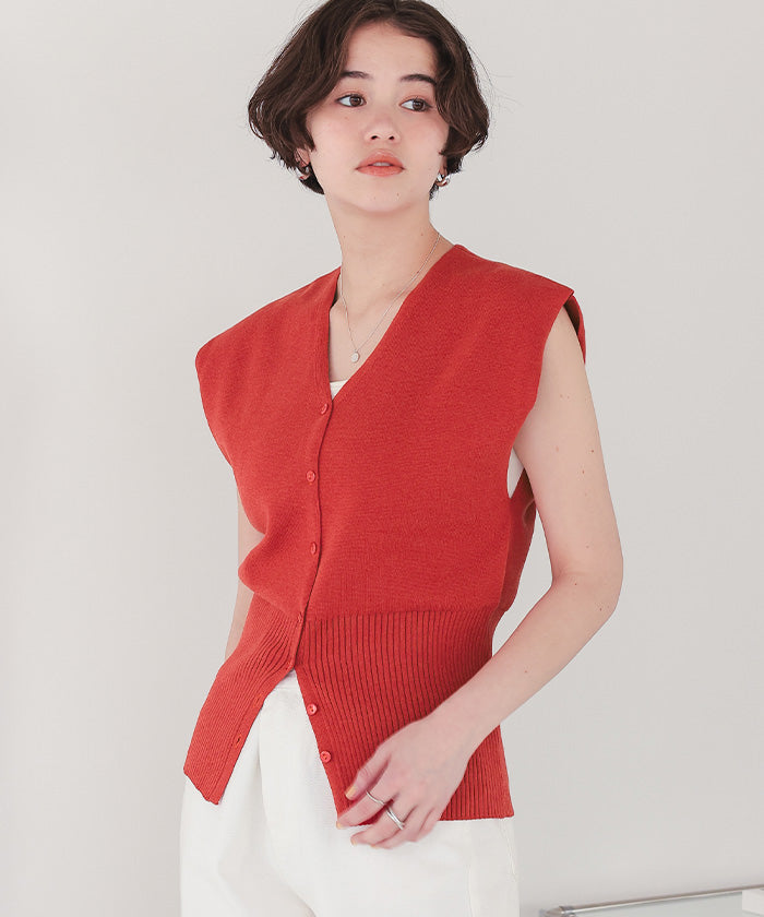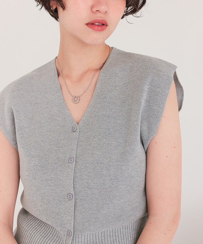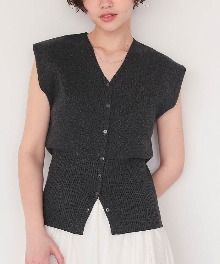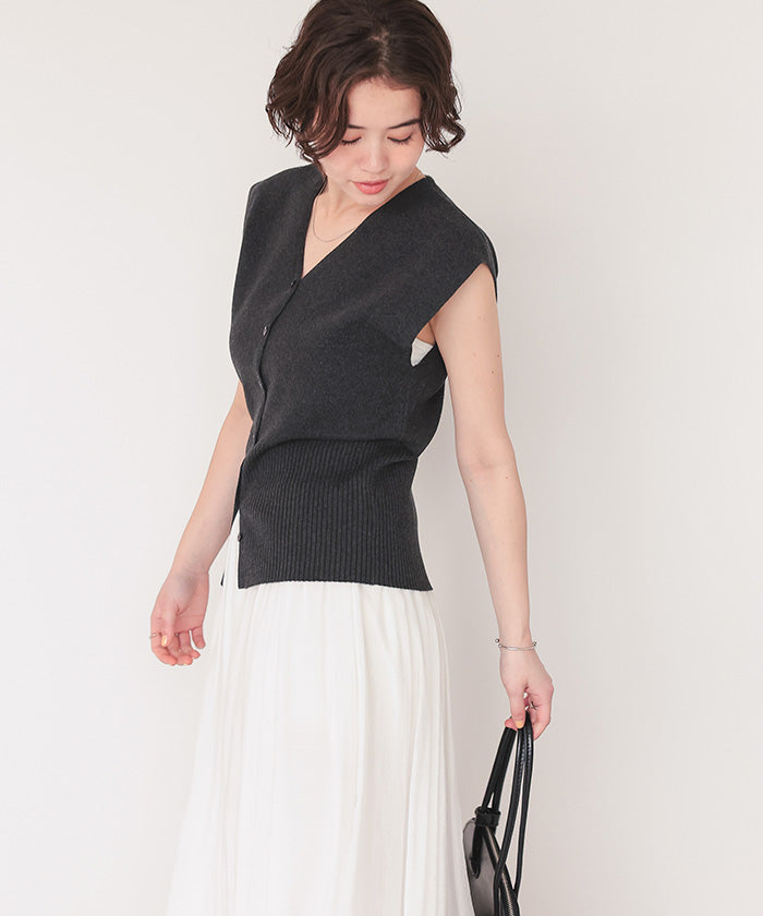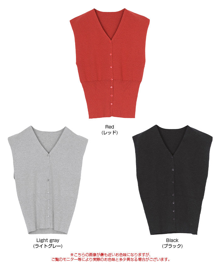 ・ノースリーブ/Vネックですっきりしたデザインの、前ボタン仕様のニットベストトップス。