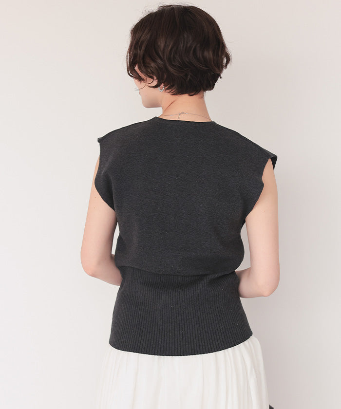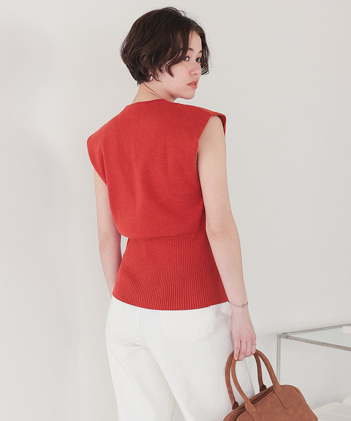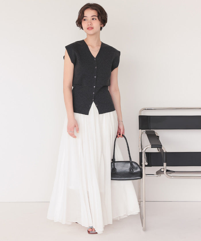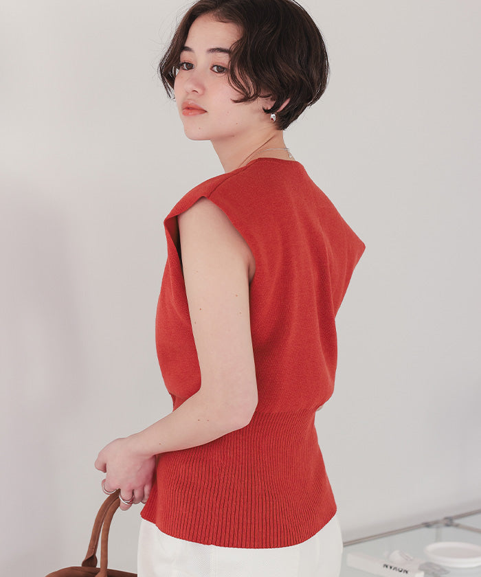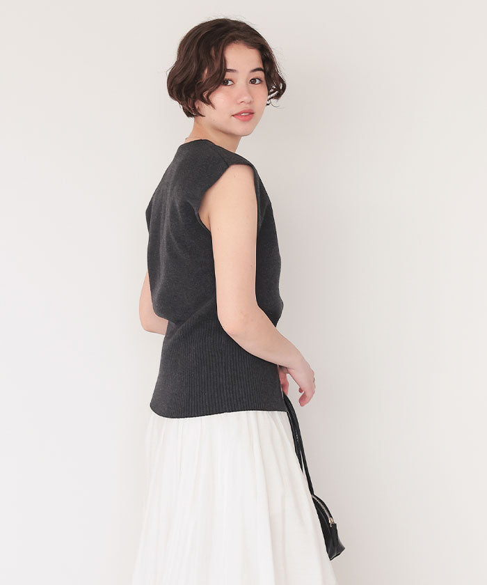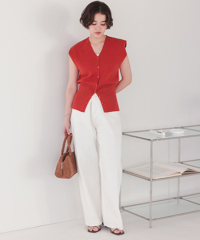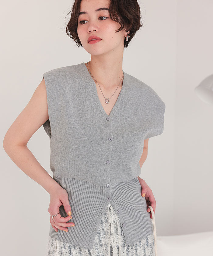 ・ノースリーブ/Vネックですっきりしたデザインの、前ボタン仕様のニットベストトップス。
