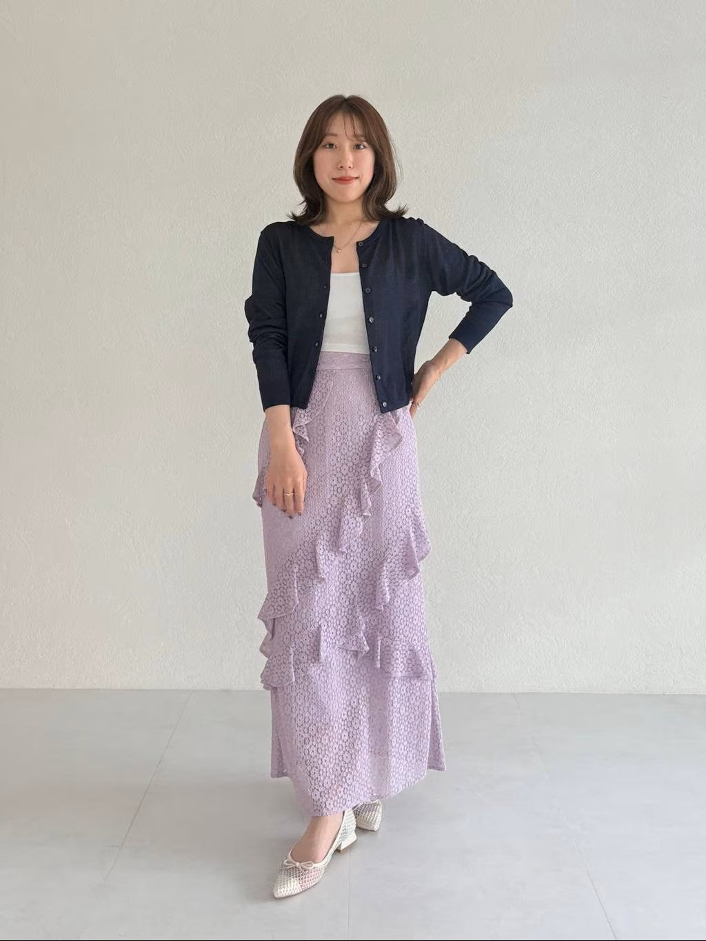 細かいラメ入りなので肌が綺麗に見えるうえに、シックなカラーが大人っぽく、秋口まで長く使える万能カーディガン。