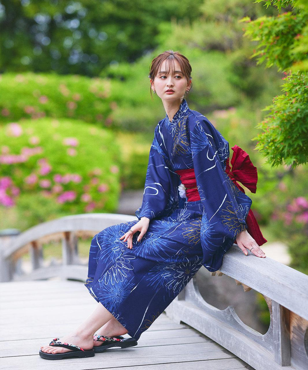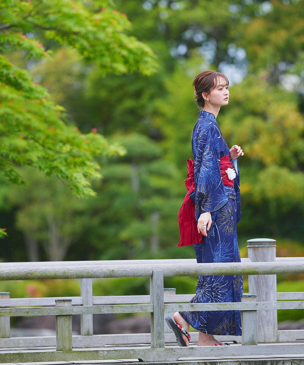 帯の色に合わせた下駄を選ぶとスッキリとまとまりのある浴衣スタイルに。