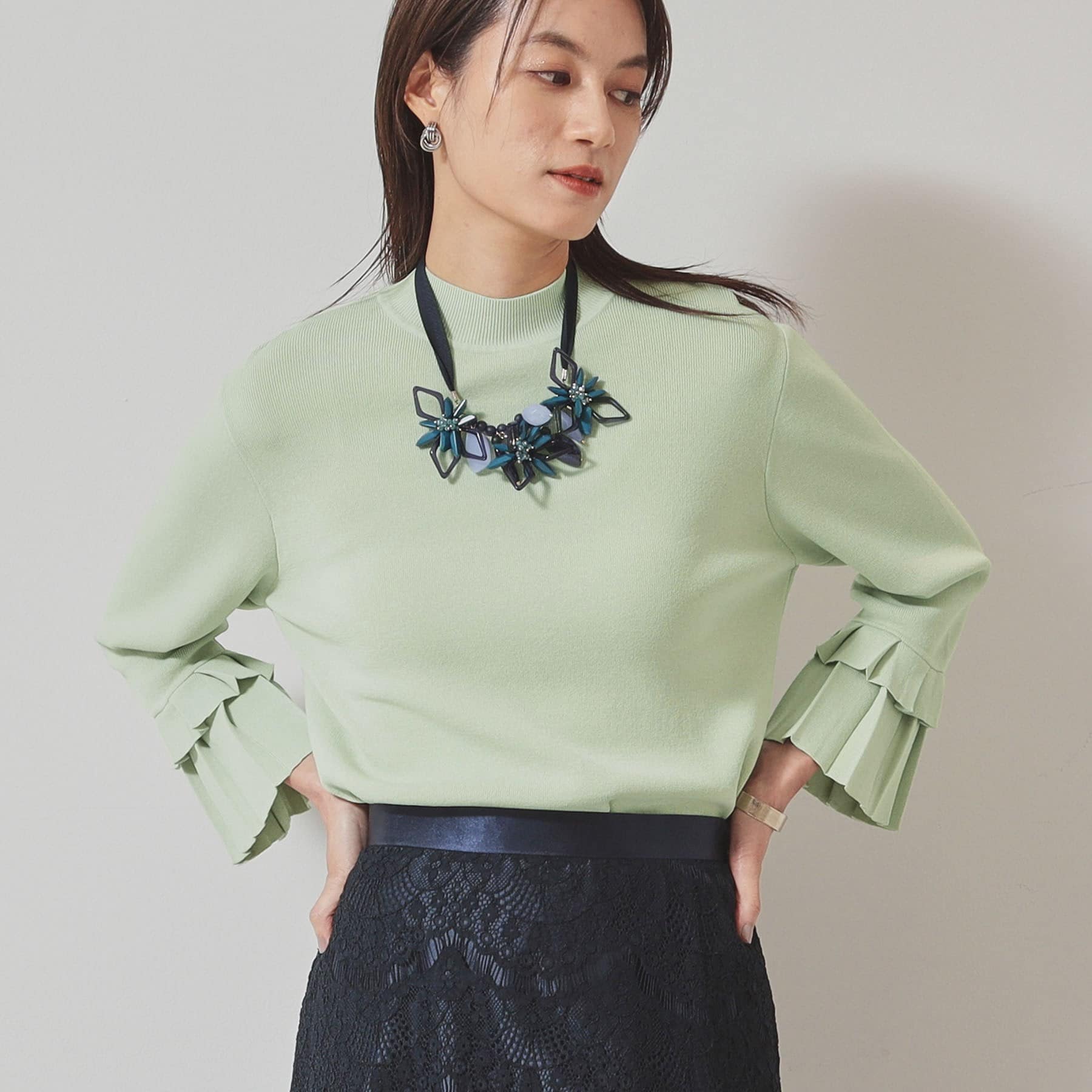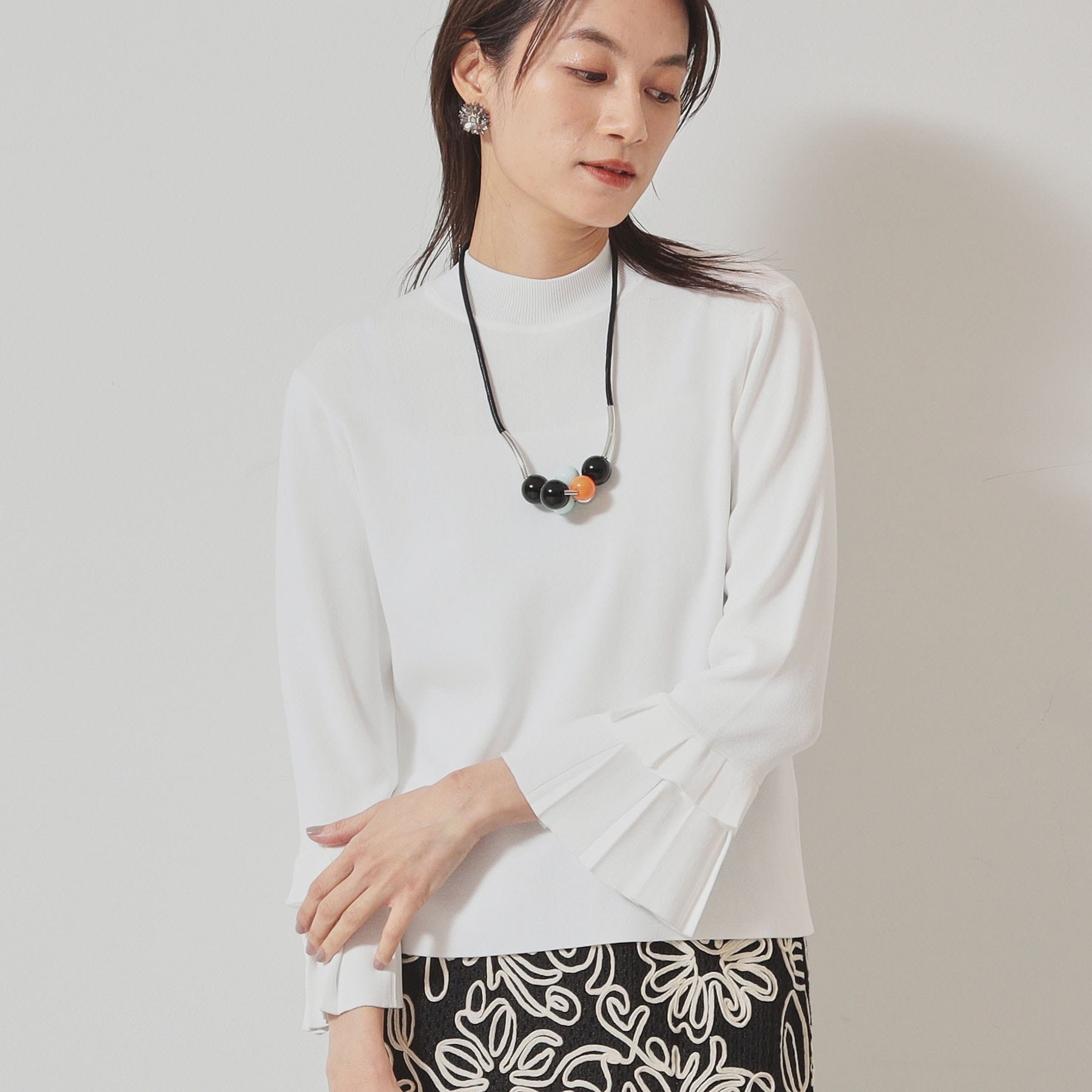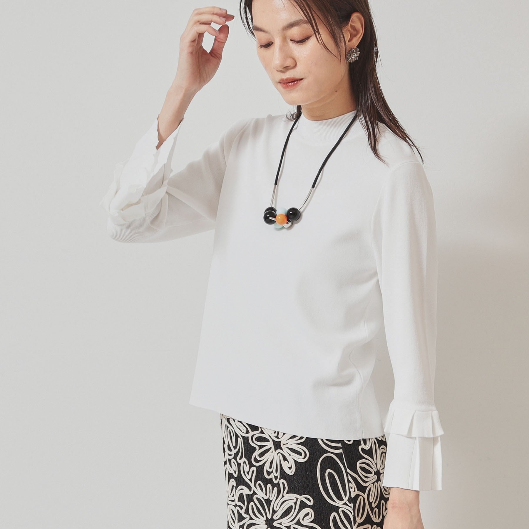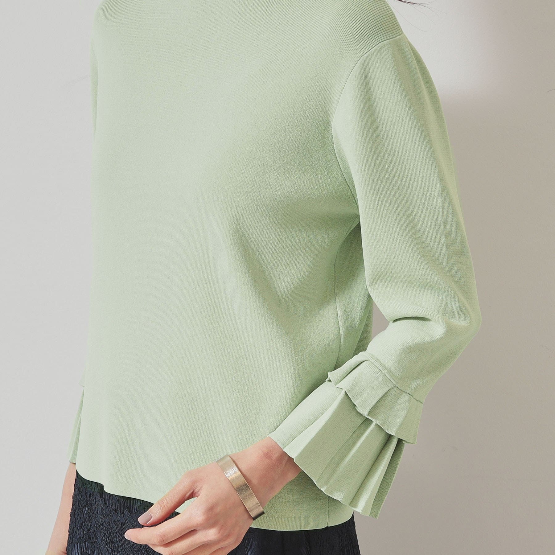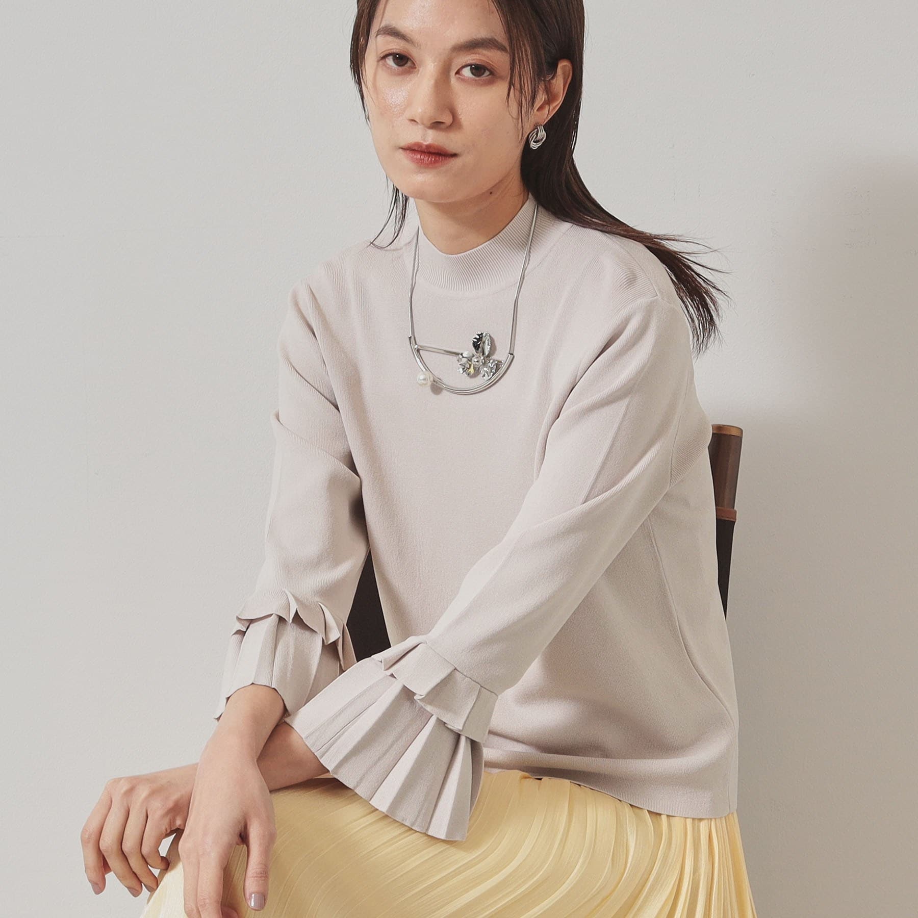 袖口に施されたプリーツデザインがエレガントなムードのニットプルオーバー。
