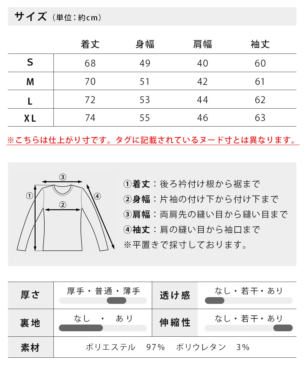 M : 着丈:70cm, 肩幅:42cm, 胸囲:102cm, 袖丈:61cm
