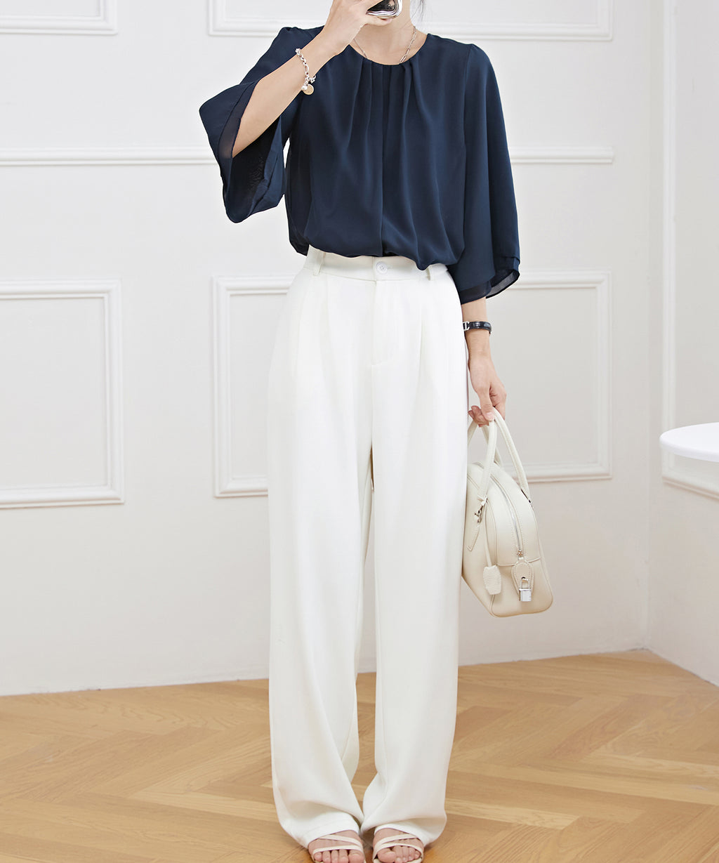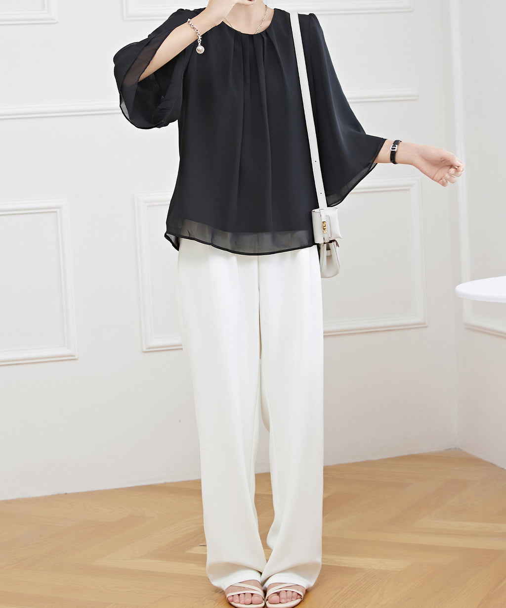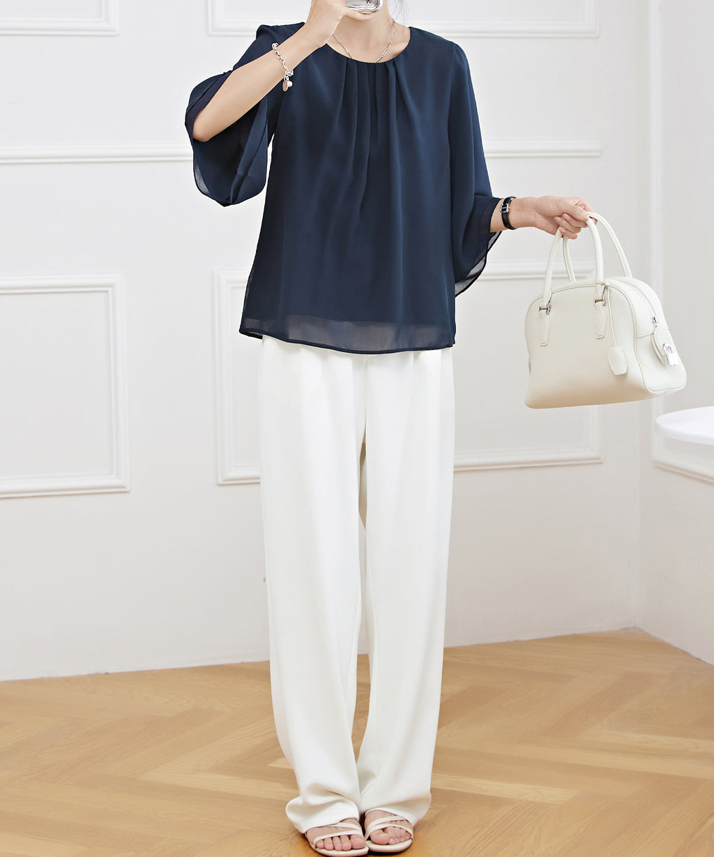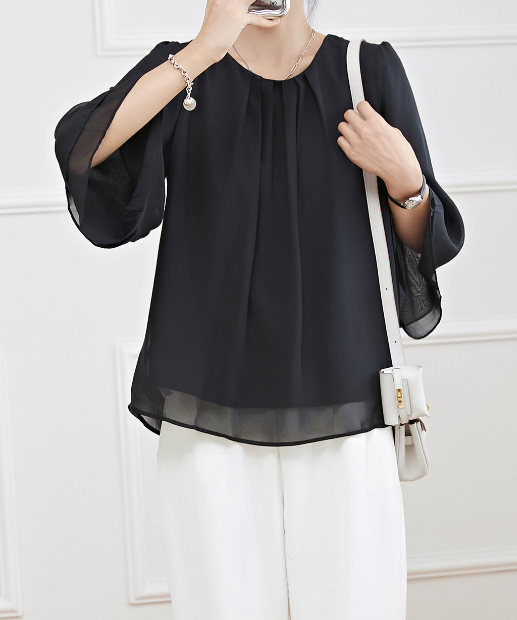 オフィスやセレモニー、デートなど、女性らしく品のある装いに合わせたい、オンコーデトップスです。