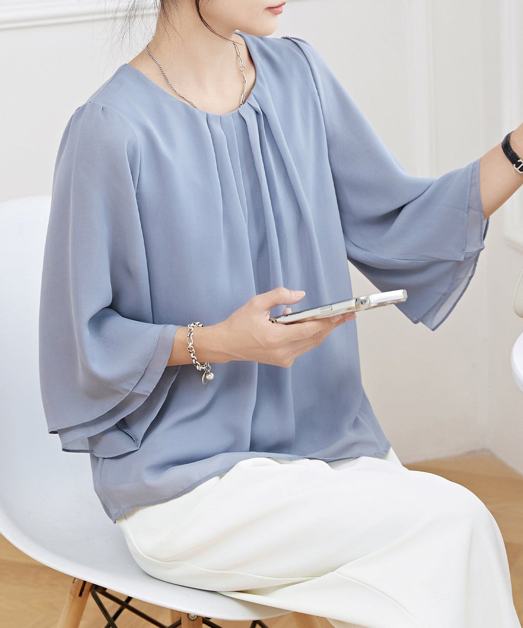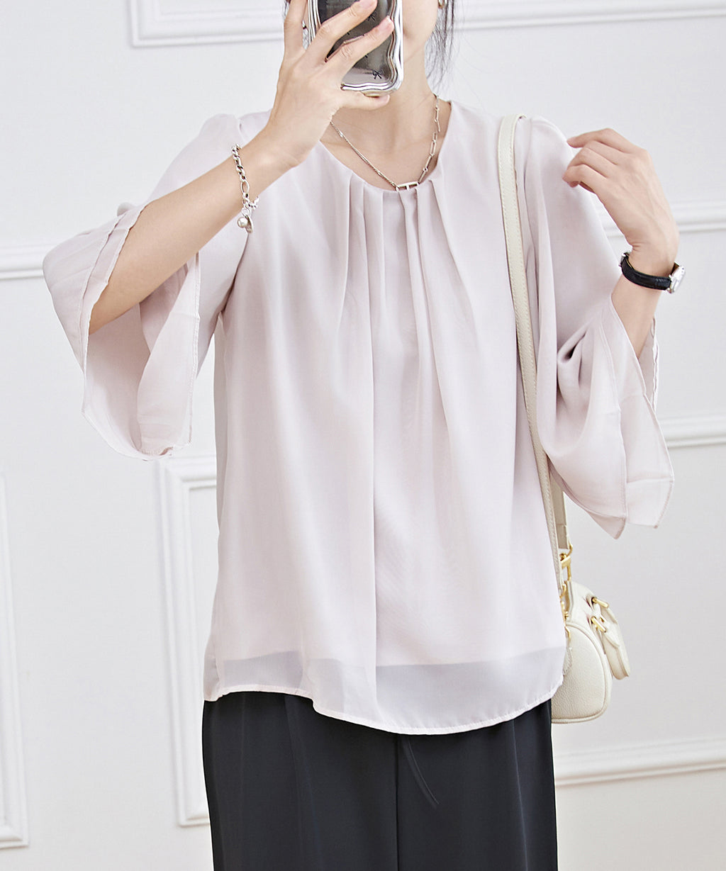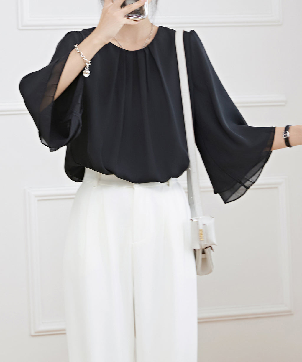 気になる二の腕まわりのボリュームもカバーしてくれるスリーブは、袖口に向かって広がるラインで華奢見え効果も抜群◎