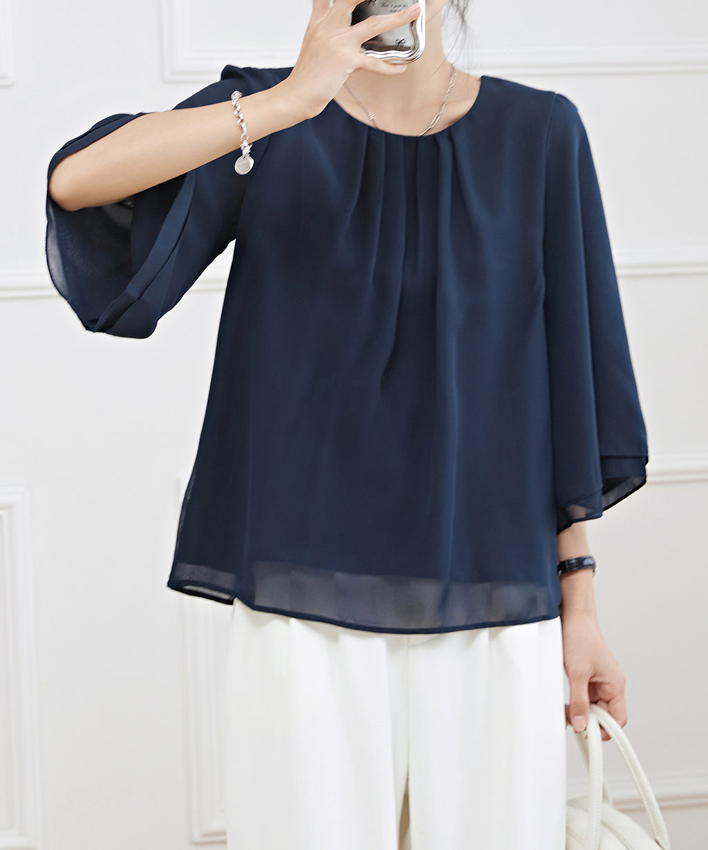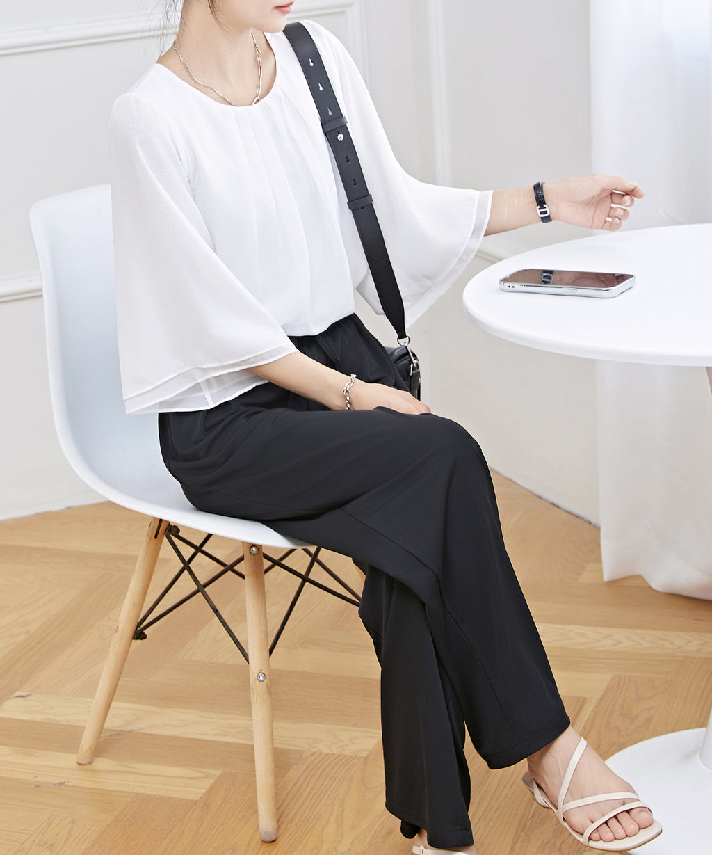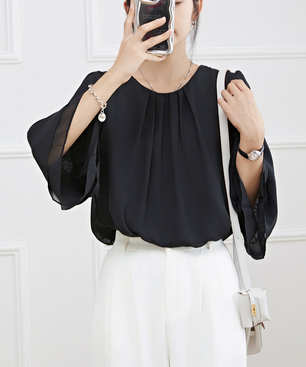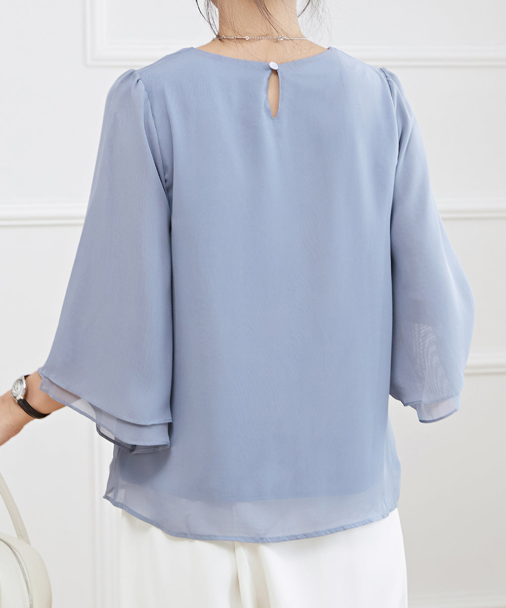 気になる二の腕まわりのボリュームもカバーしてくれるスリーブは、袖口に向かって広がるラインで華奢見え効果も抜群◎