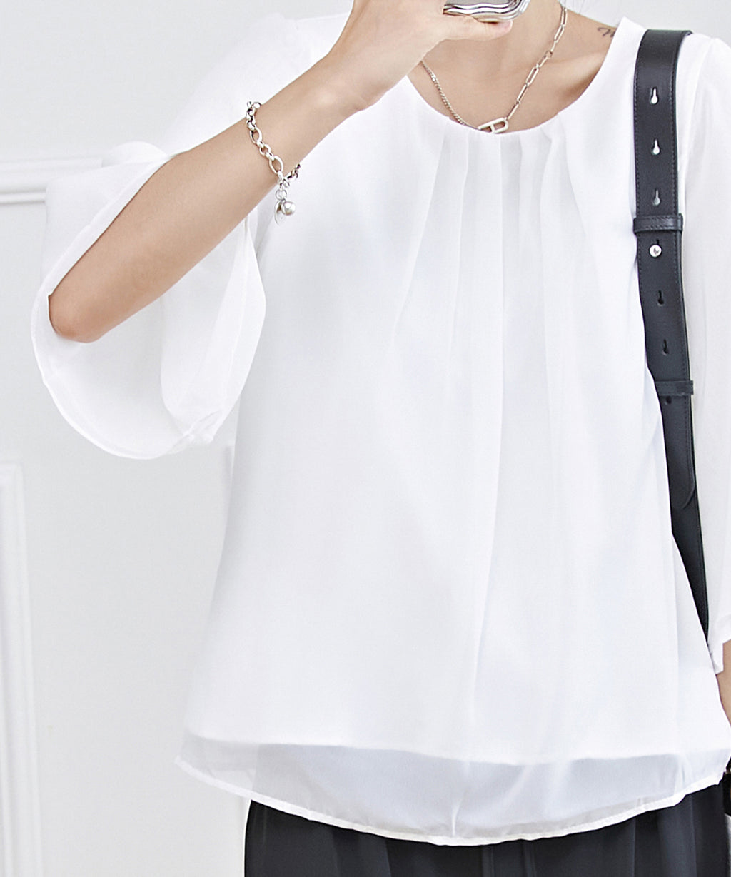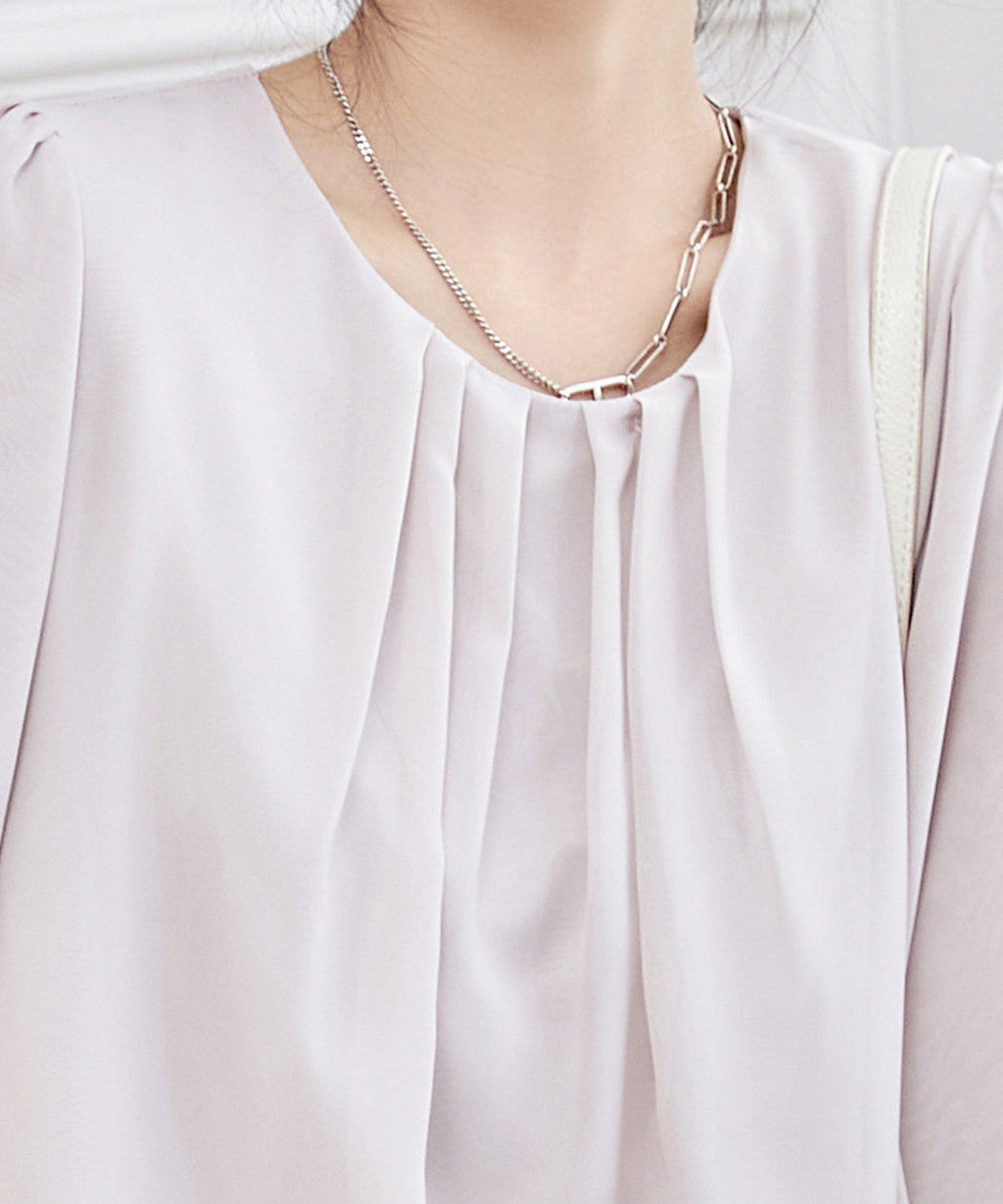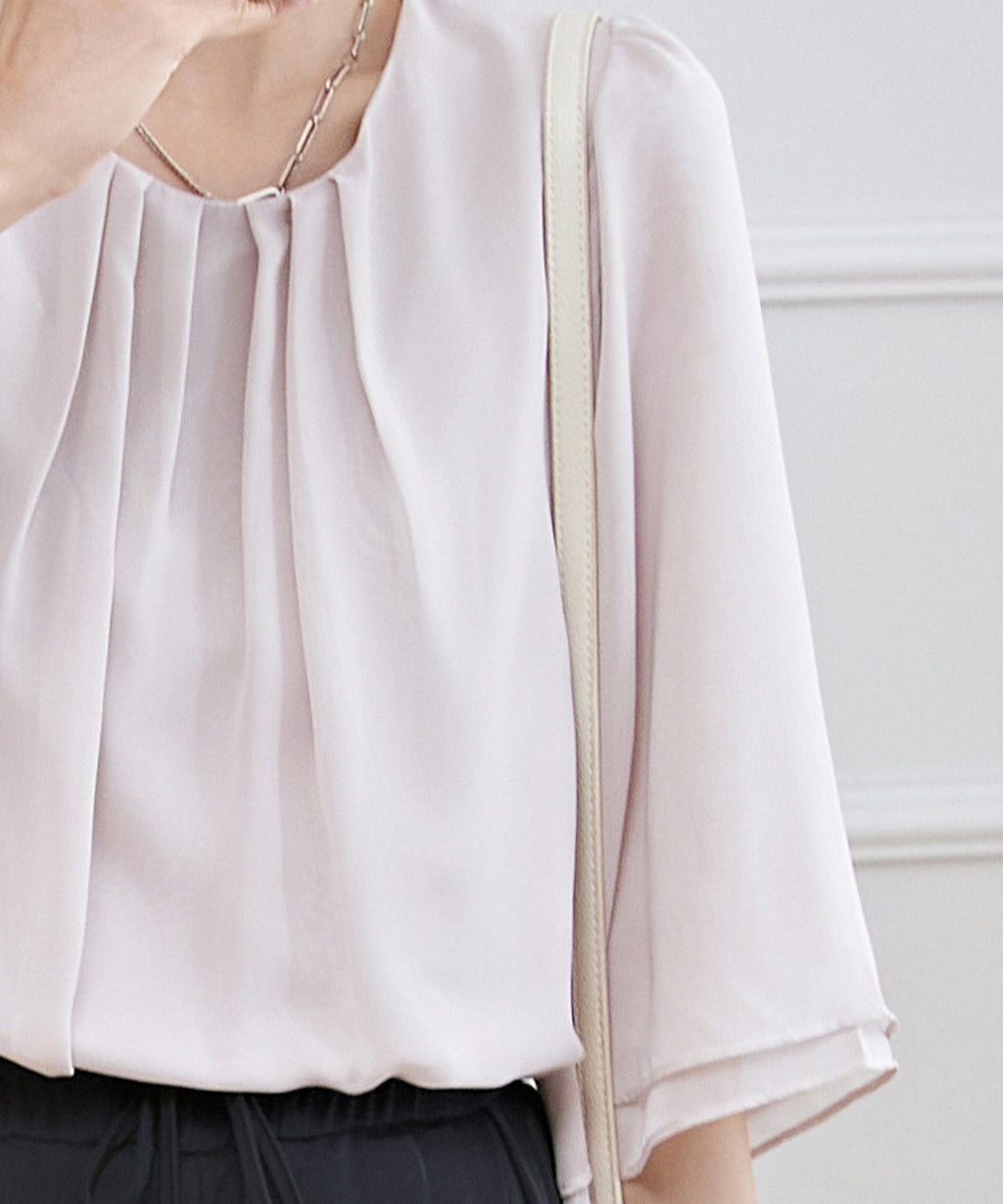 衿ぐりにはタックをあしらい、シルエットに立体感をプラス。