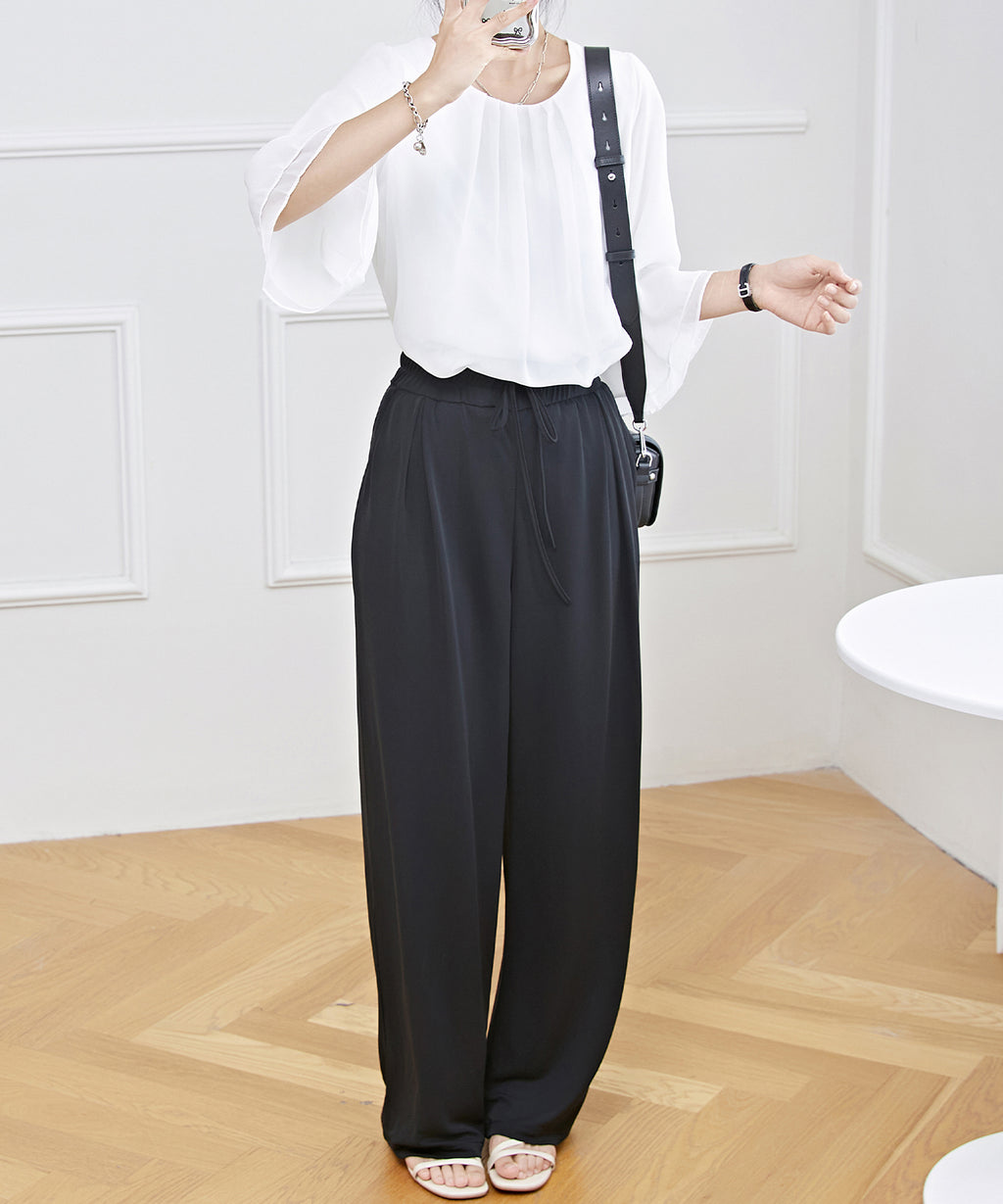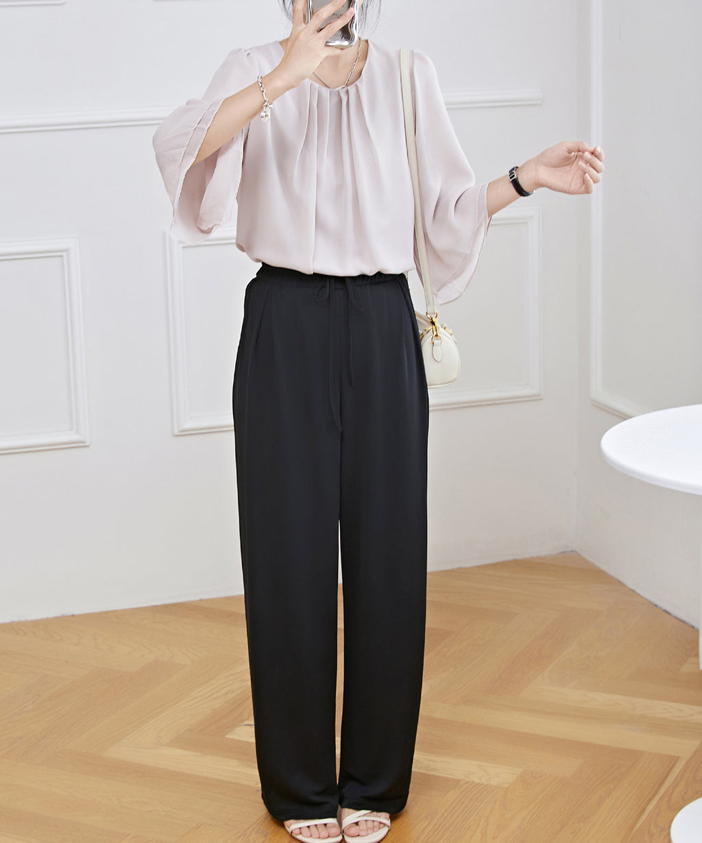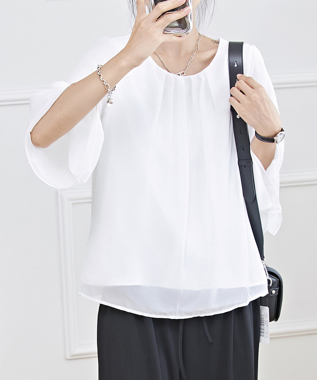 衿ぐりにはタックをあしらい、シルエットに立体感をプラス。