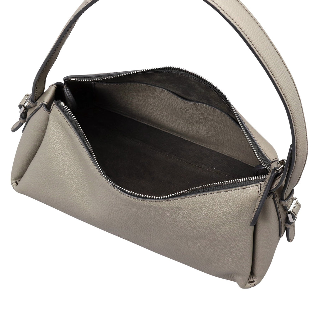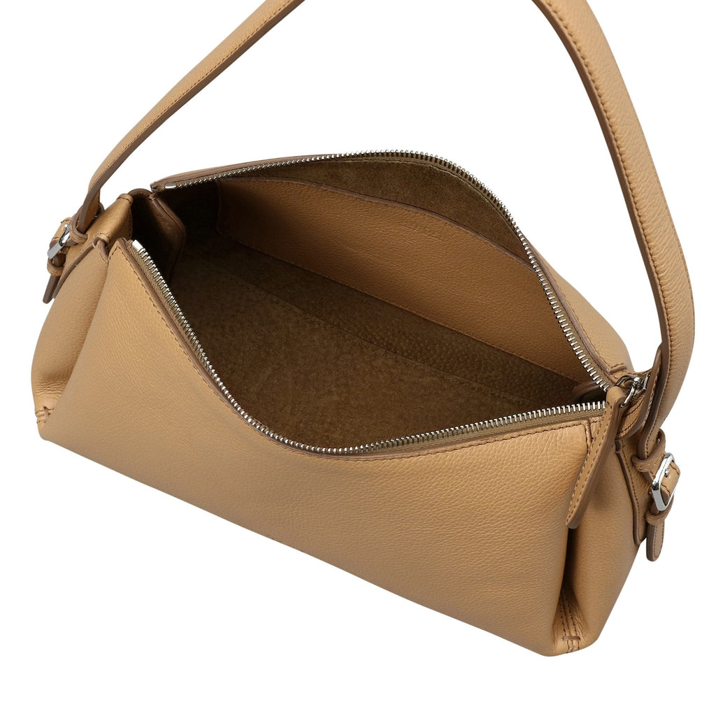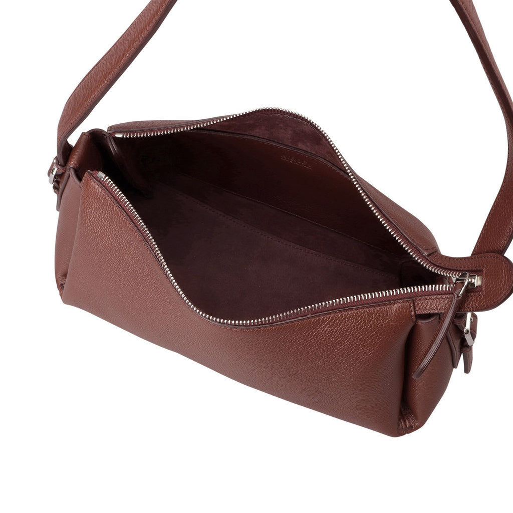 高さを抑えたユニークな横長のフォルムと、2枚のレザーを複雑に折り合わせることで生まれたふっくらとしたボディ。