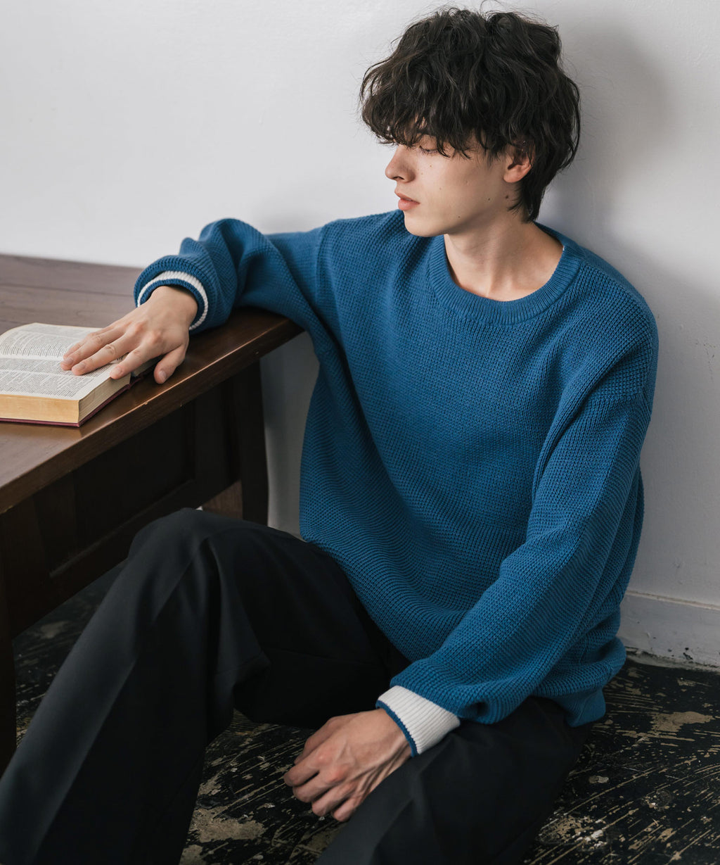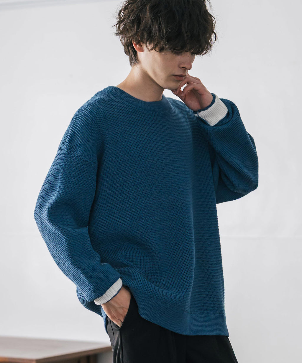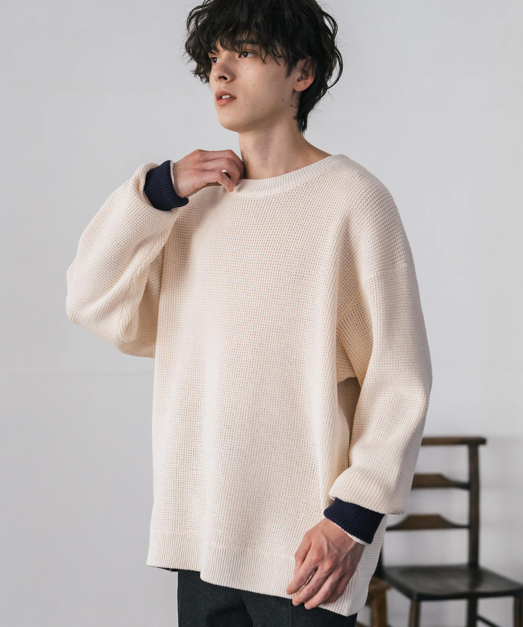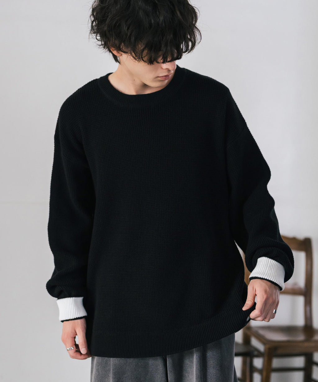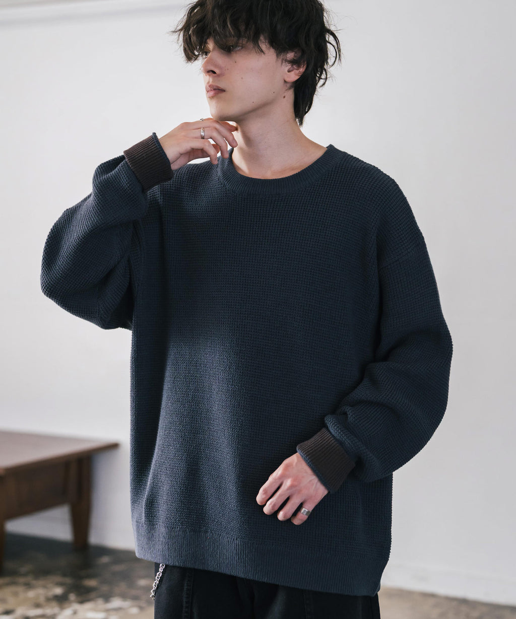 オーバーサイズ配色リブワッフルニットプルオーバー