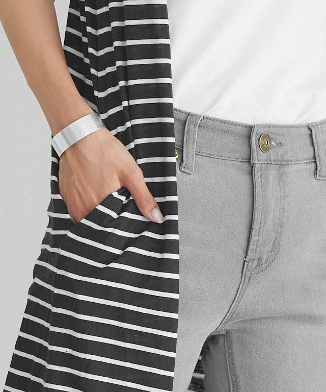 フロントが自然と縦に流れるので、さっと羽織るだけでどんなコーデに合わせても大人っぽさをぐっと引き立ててくれます。