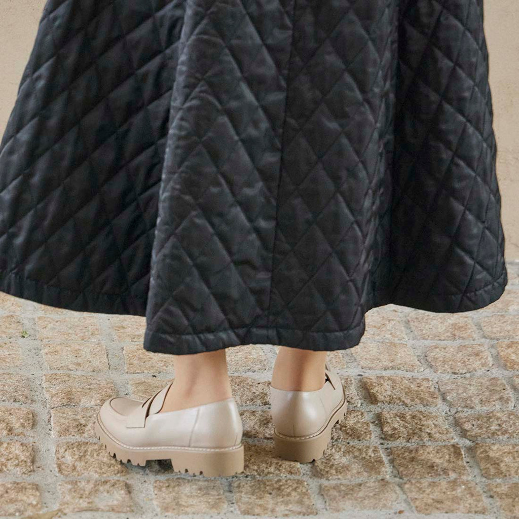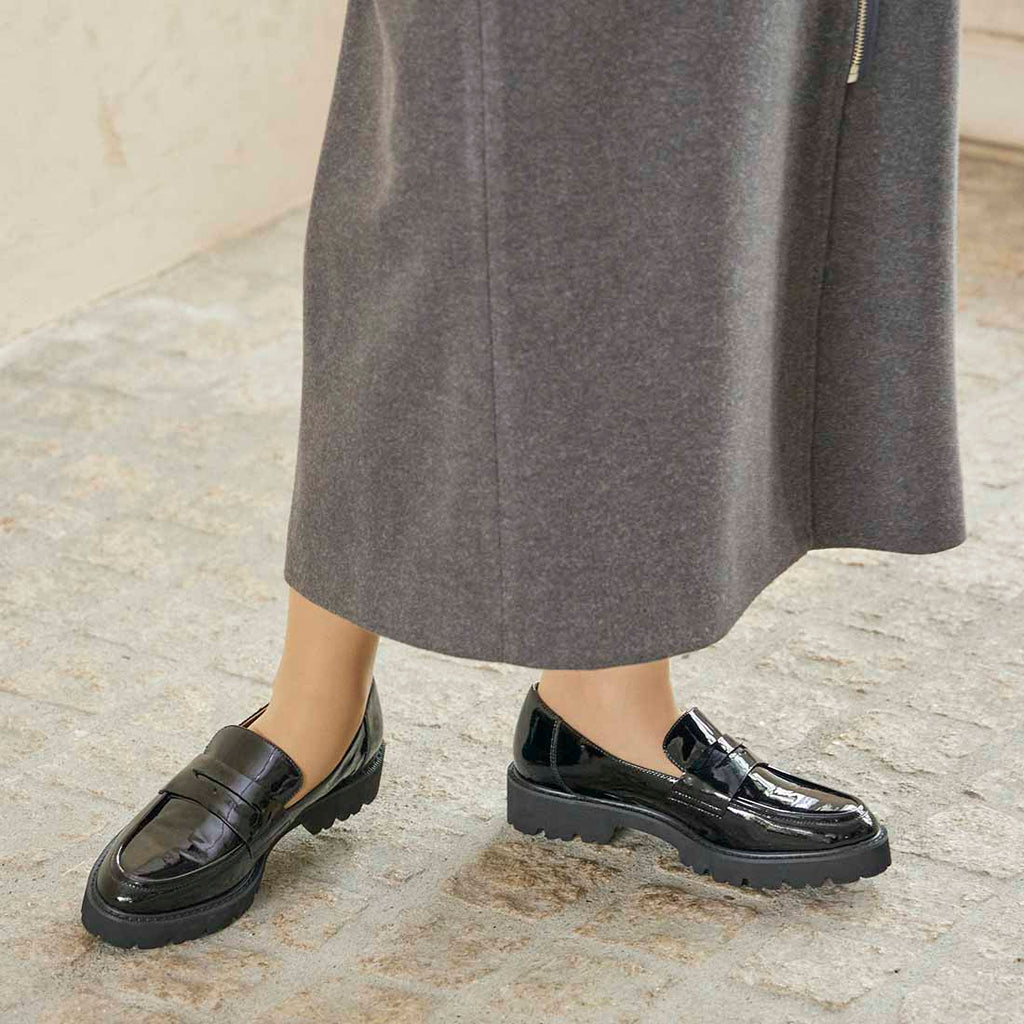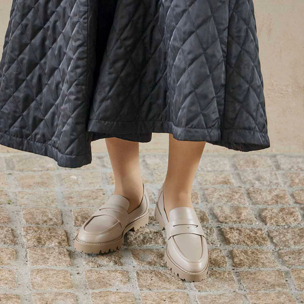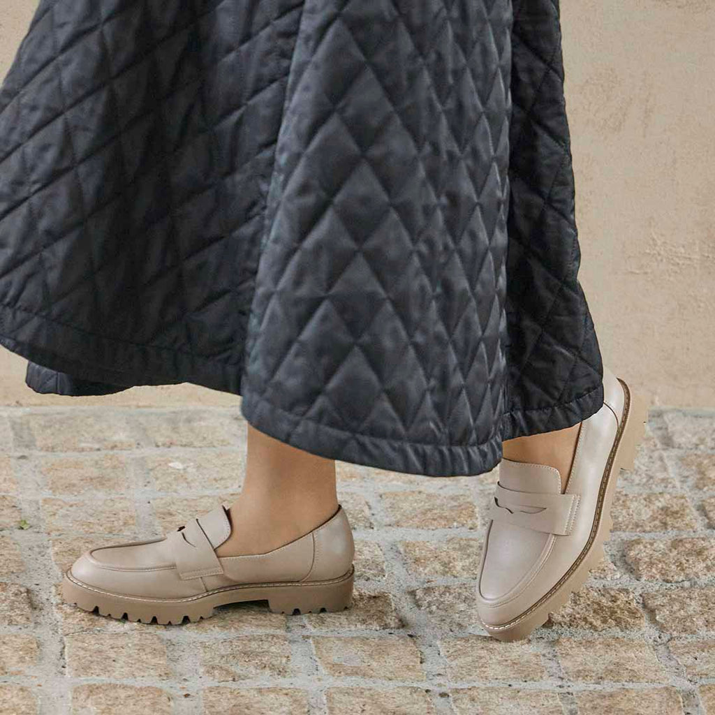 定番のコインローファーを、トレンドの厚底で今年らしいシルエットにアップデート。