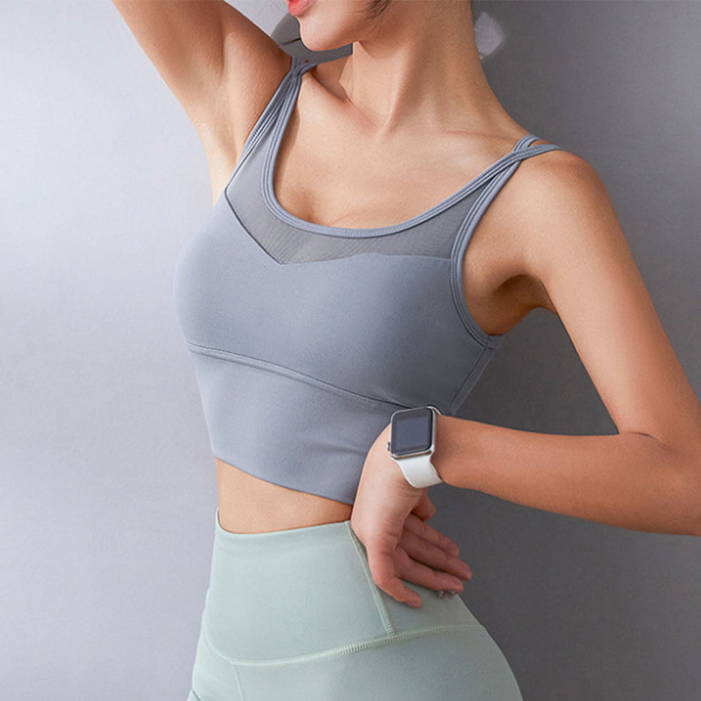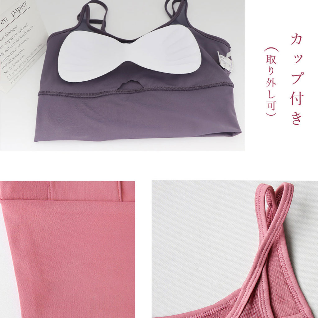 クロスバックデザインで健康的な背中見せ、幅広のストラップでより安定したサポート力を発揮