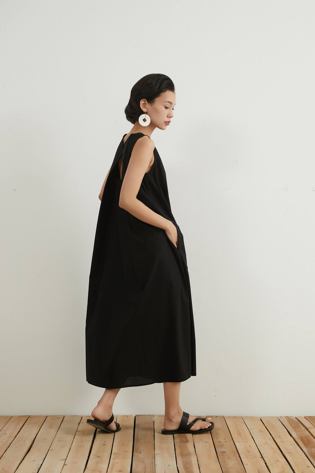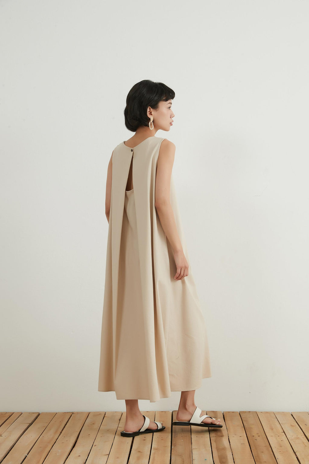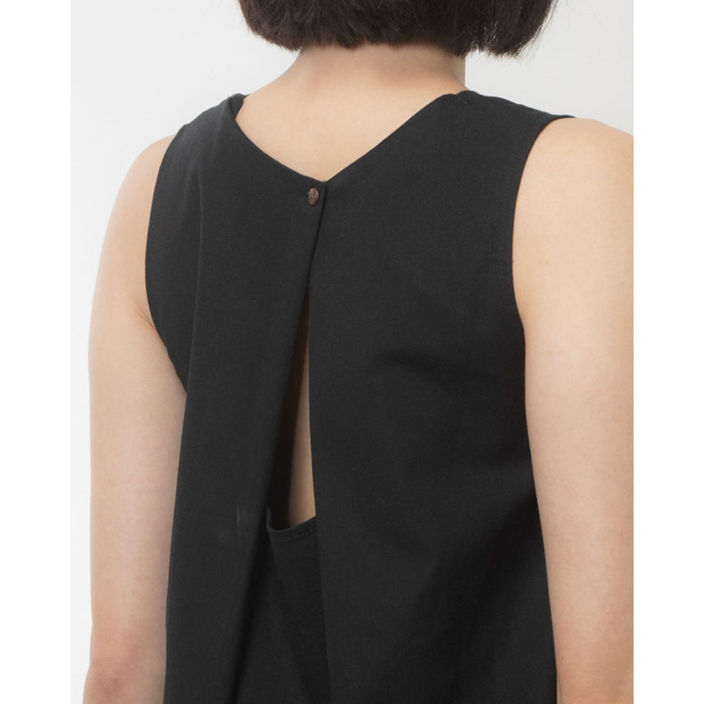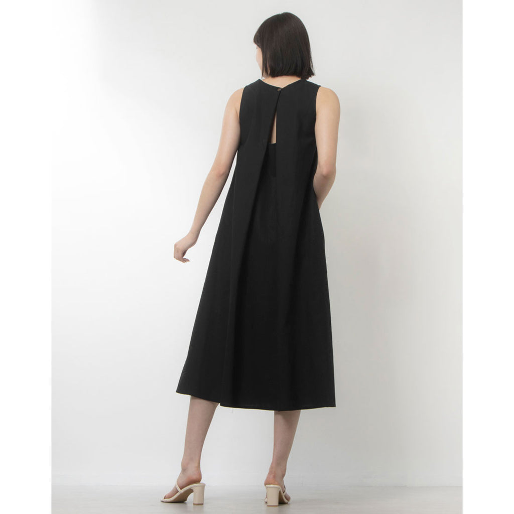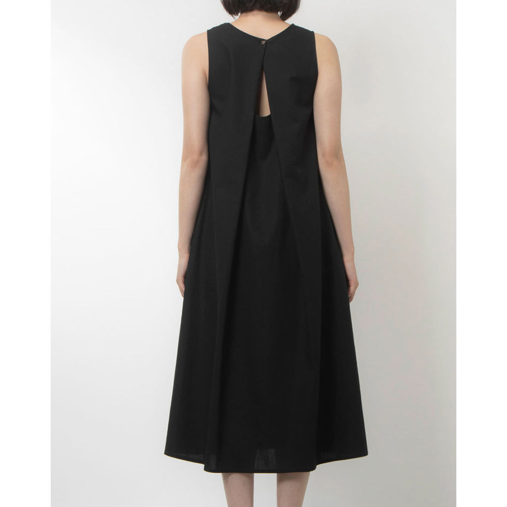 前身ごろはシンプルミニマルな印象で、ポイントは後ろにある大きなタックと背中見せのデザイン。