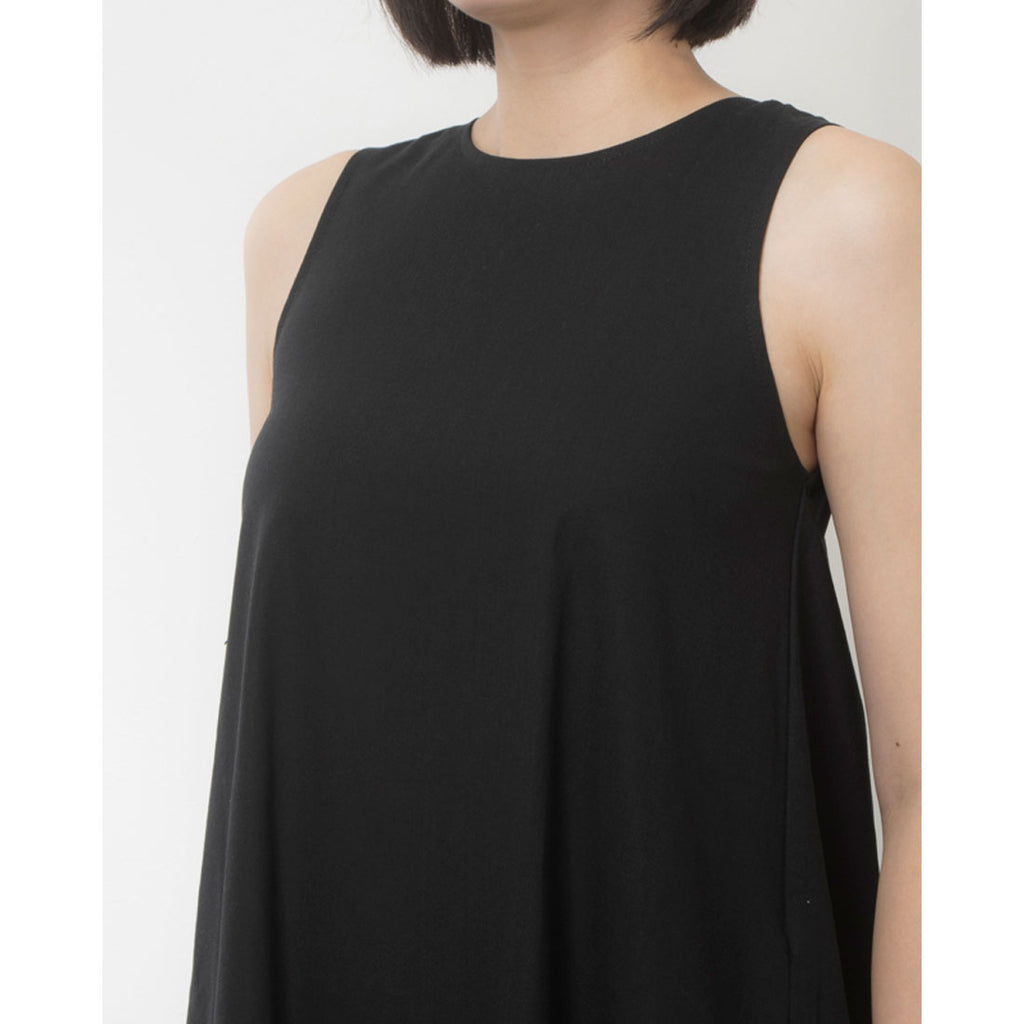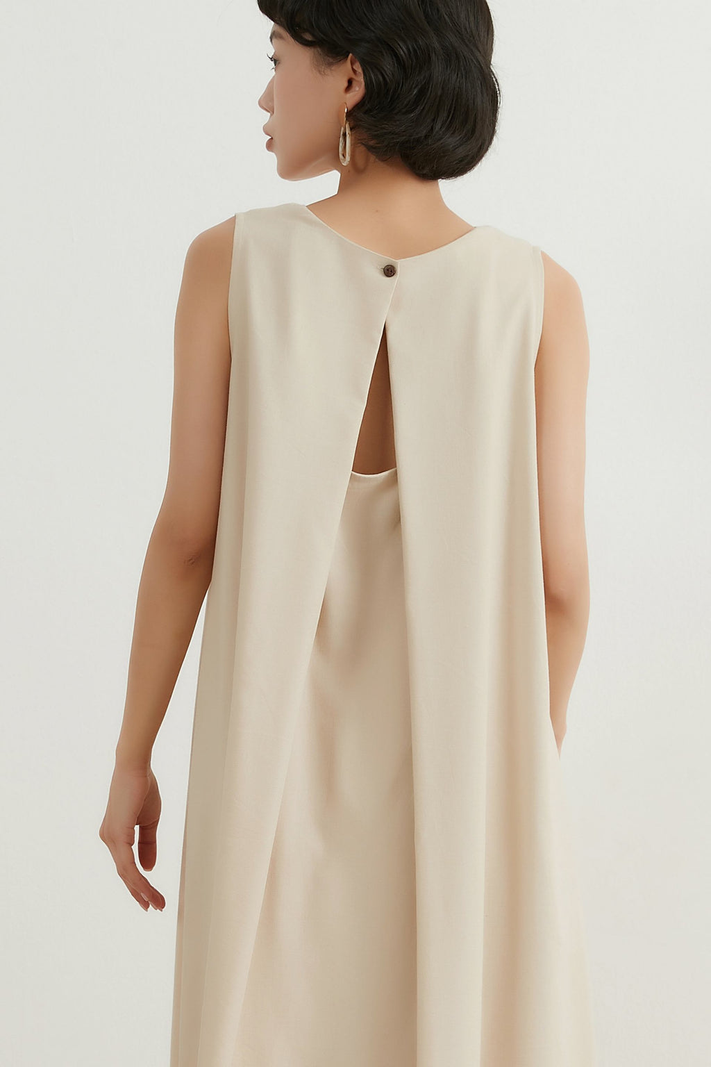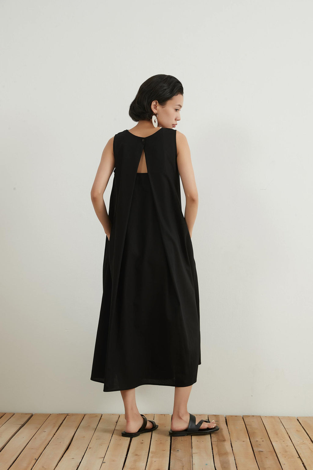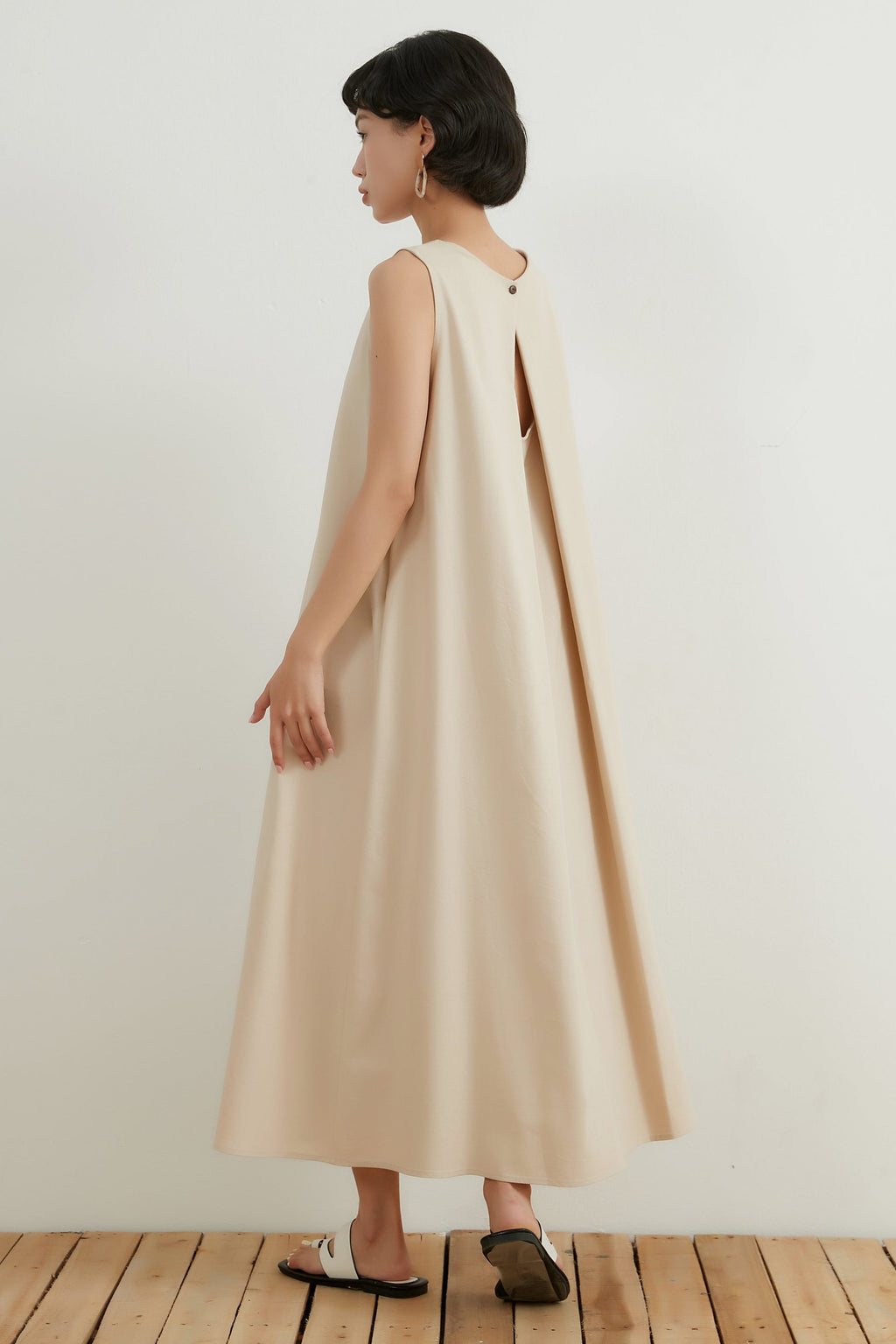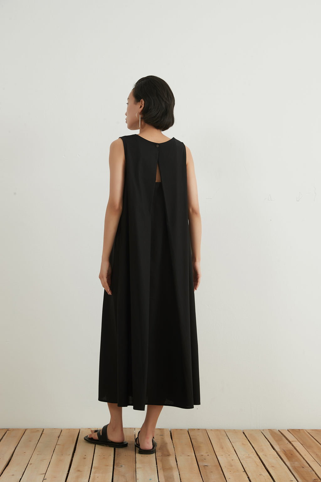 前身ごろはシンプルミニマルな印象で、ポイントは後ろにある大きなタックと背中見せのデザイン。