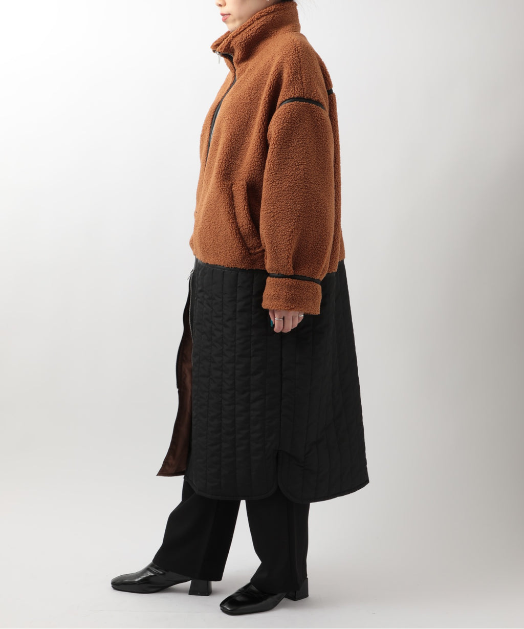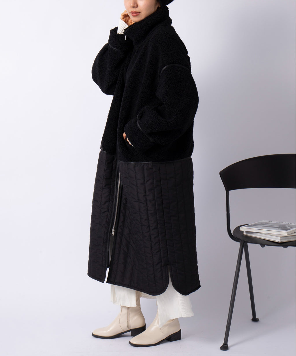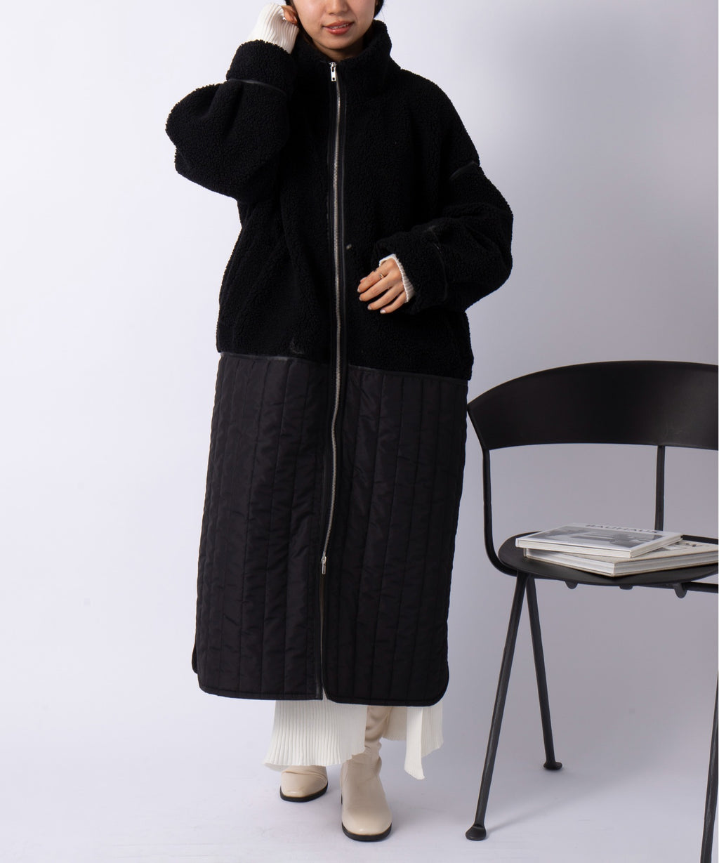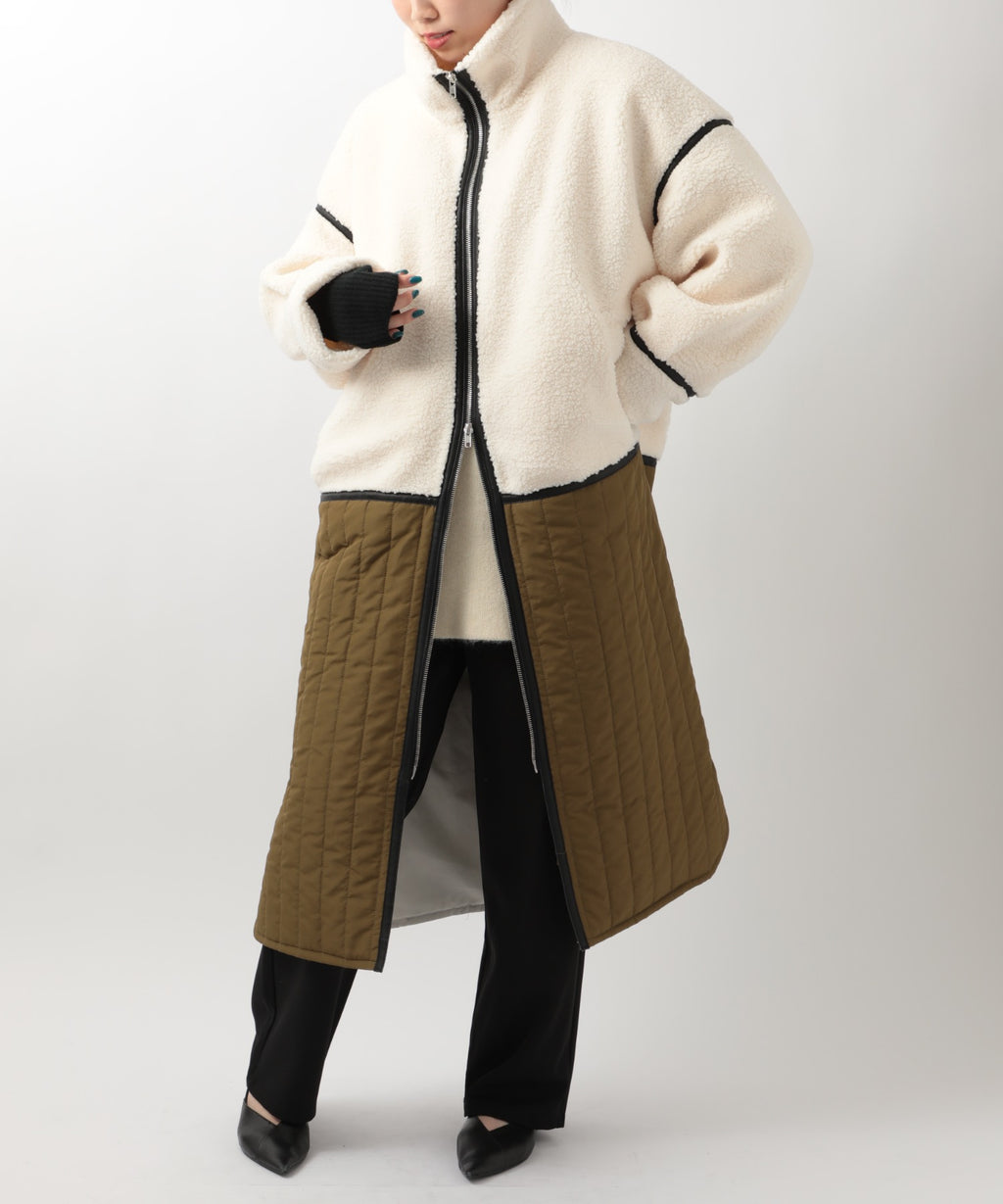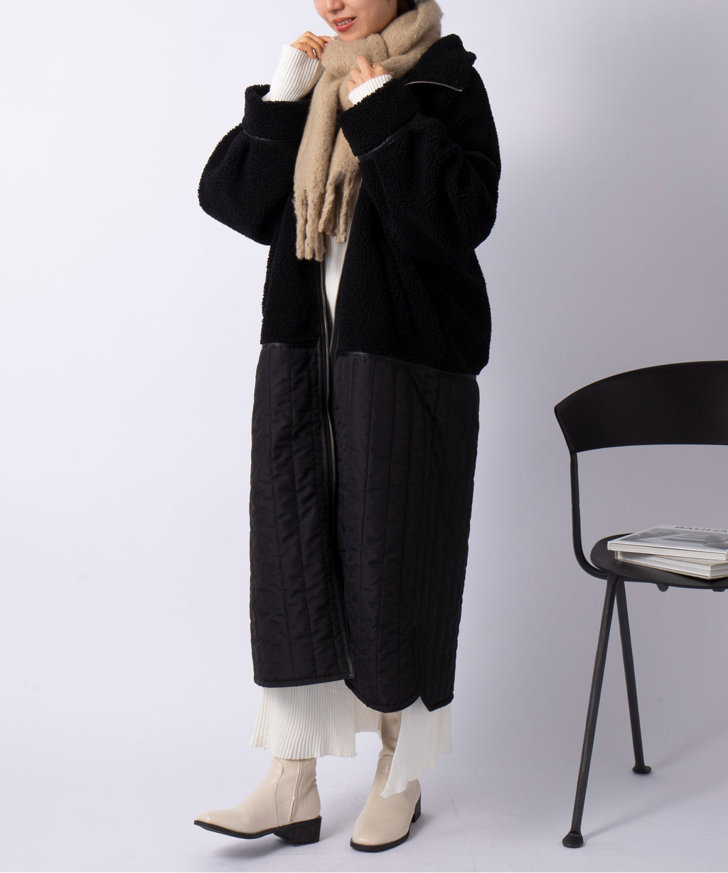 ふっくらモコモコの風合いのボアとキルティングを組み合わせたモードな雰囲気漂うロングコート。