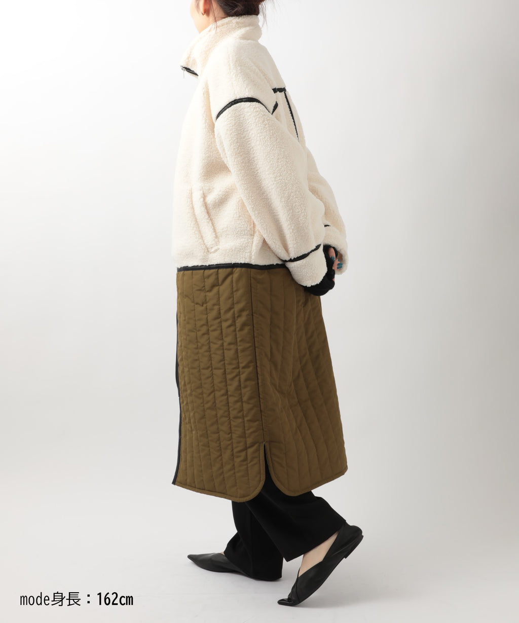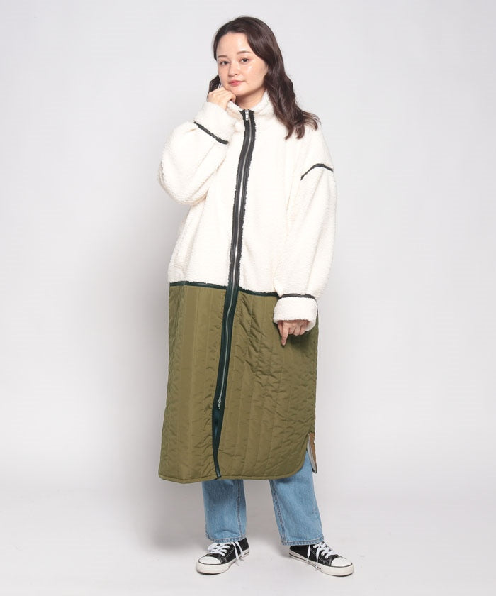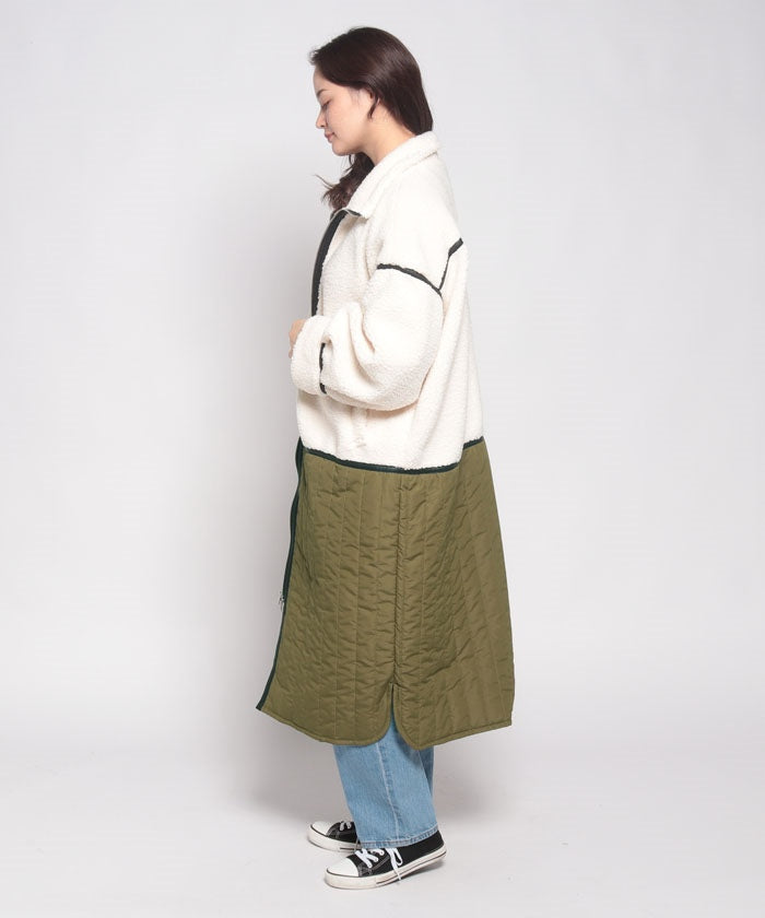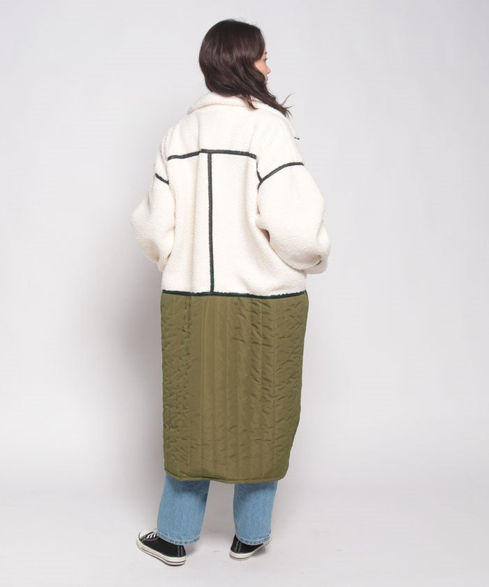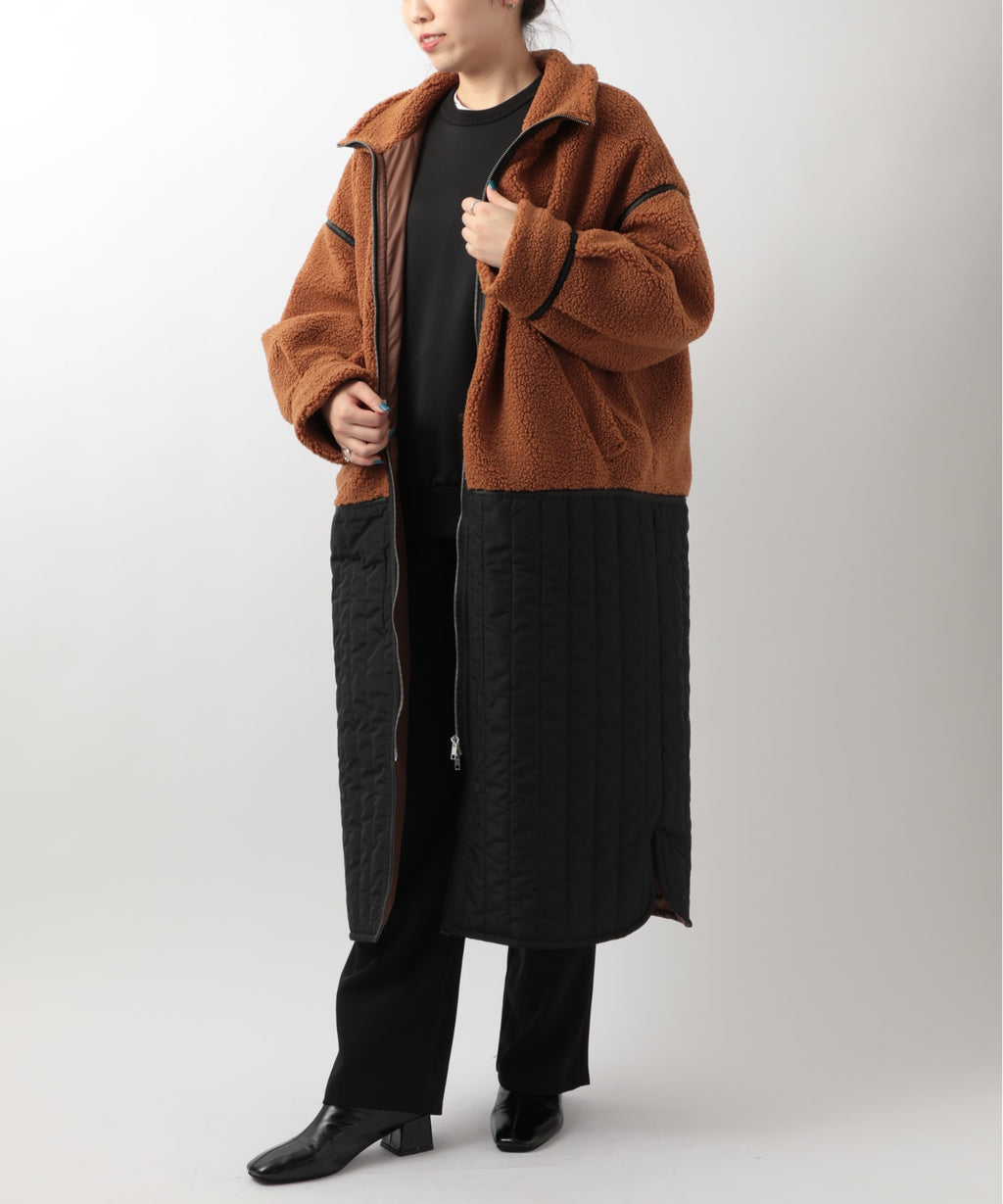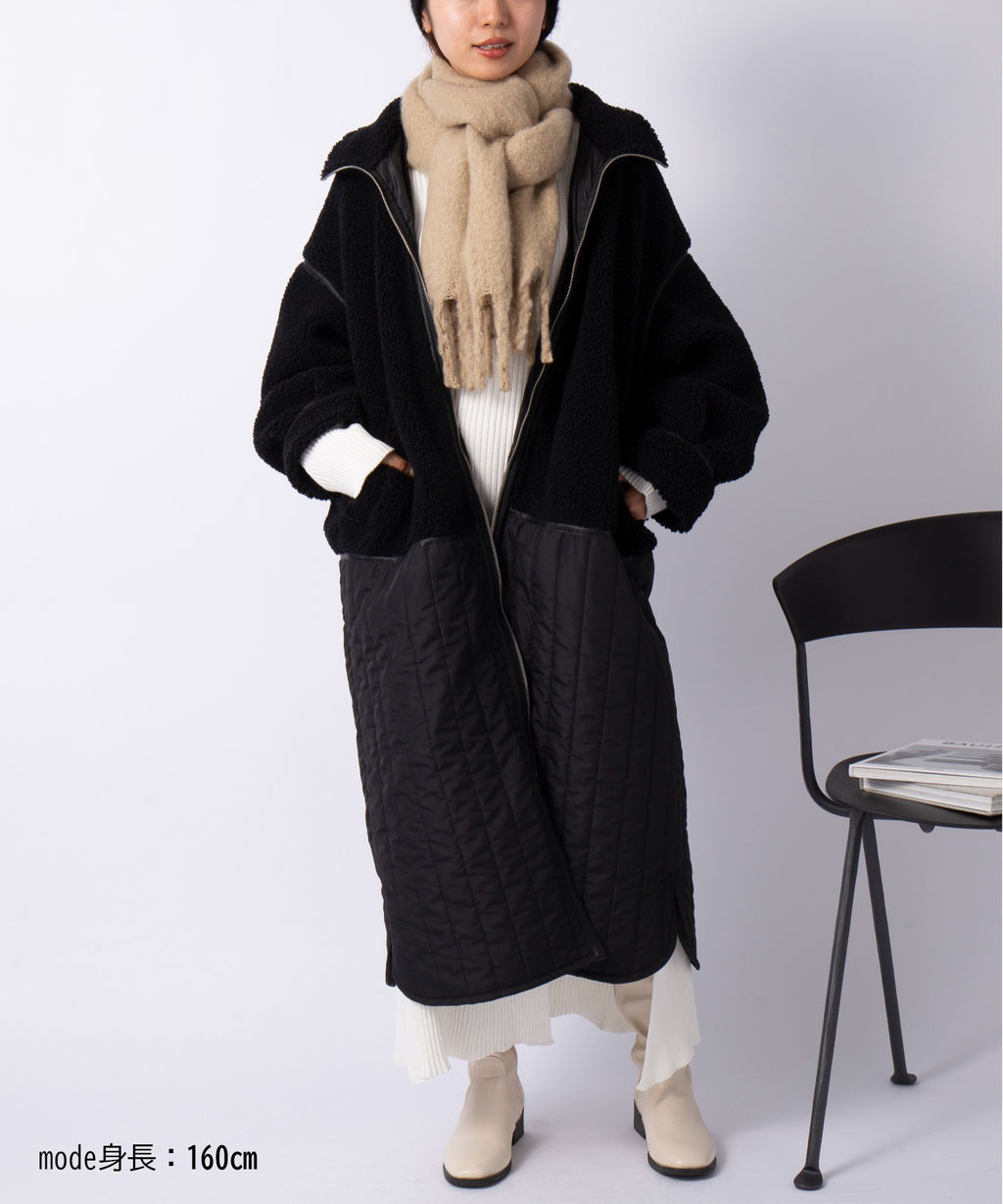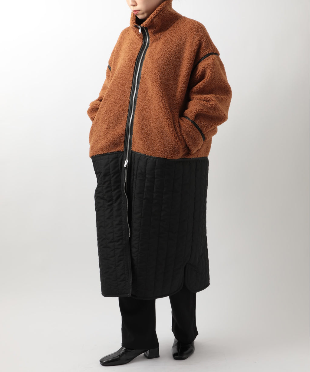 ふっくらモコモコの風合いのボアとキルティングを組み合わせたモードな雰囲気漂うロングコート。