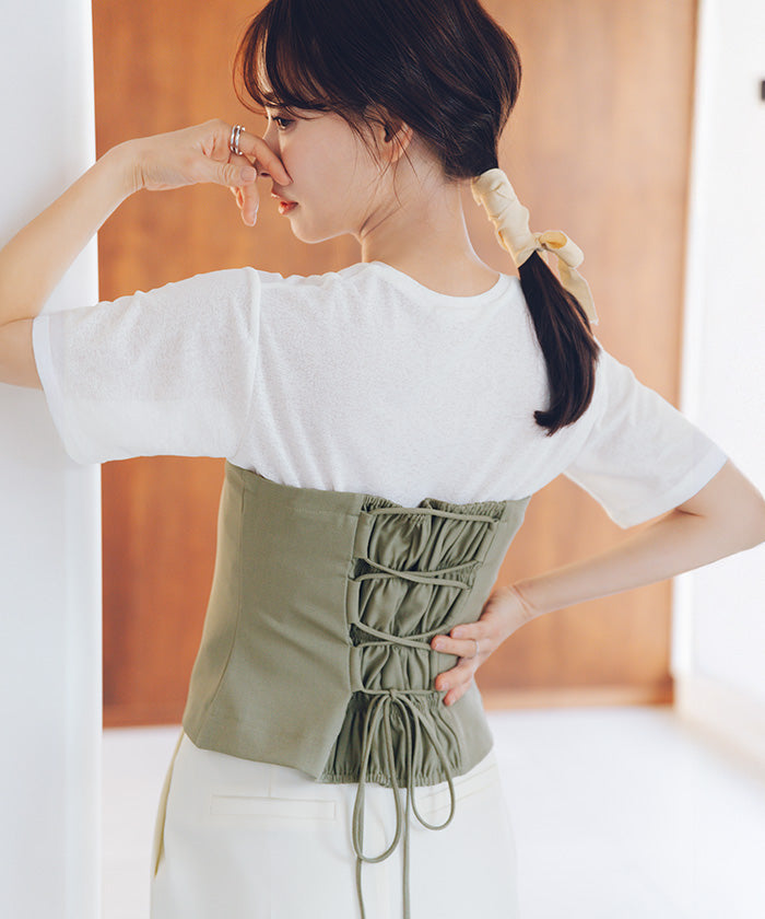 ・後ろはシャーリング仕様になっており、体のフィット感はレースアップリボン部分で調整可能です