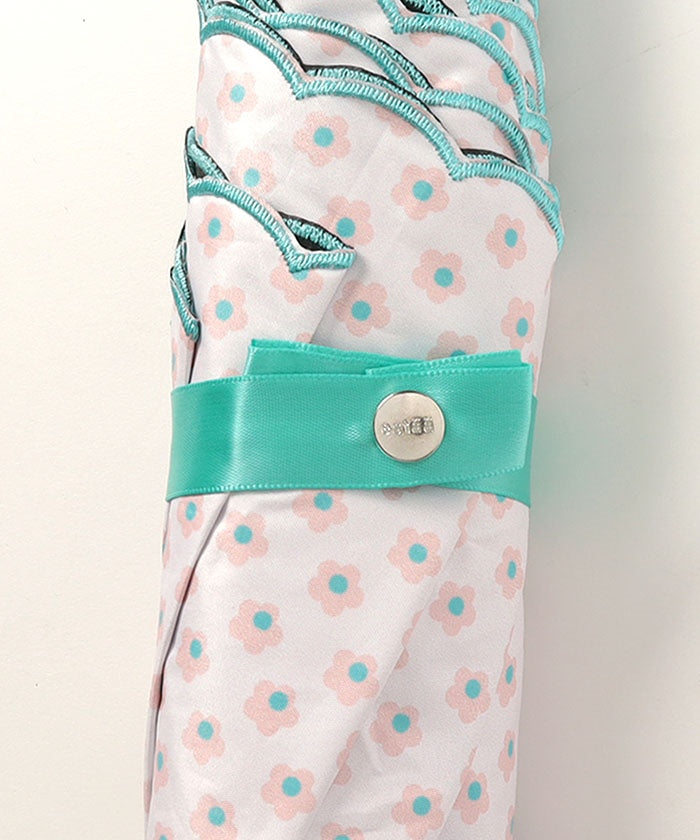 アデリアレトロの昭和レトロな可愛らしさがギュッと詰め込まれたコラボレーション折り畳み傘。ドットのようにデザインされた小さなフラワープリントがワザありです。バンブー調のハンドルやスカラップしたアウトラインなどディテールまで抜かりなく。