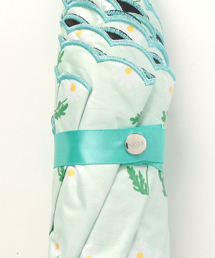 アデリアレトロの昭和レトロな可愛らしさがギュッと詰め込まれたコラボレーション折り畳み傘。爽やかさただよう配色でフラワープリントをのせました。バンブー調のハンドルやスカラップしたアウトラインなどディテールまで抜かりなく。